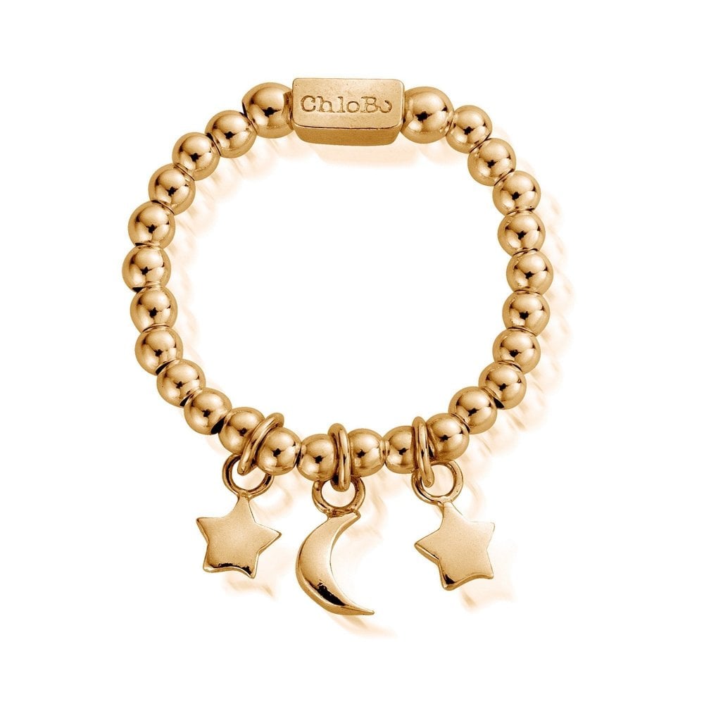 Featuring mini moon charm symbolising protection and magic, and mini stars to bring wishes to life. Can be worn alone for a subtle finish or stacked with your other beaded or solid rings.