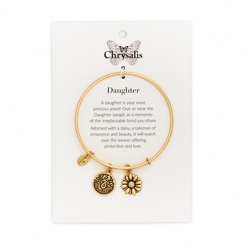 A daughter is your most precious jewel! Give or wear your Daughter bangle as a momento of the irreplaceable bond you share. Adorned with a daisy, a talisman of innocence and beauty, it will watch over the wearer offering protection and love.