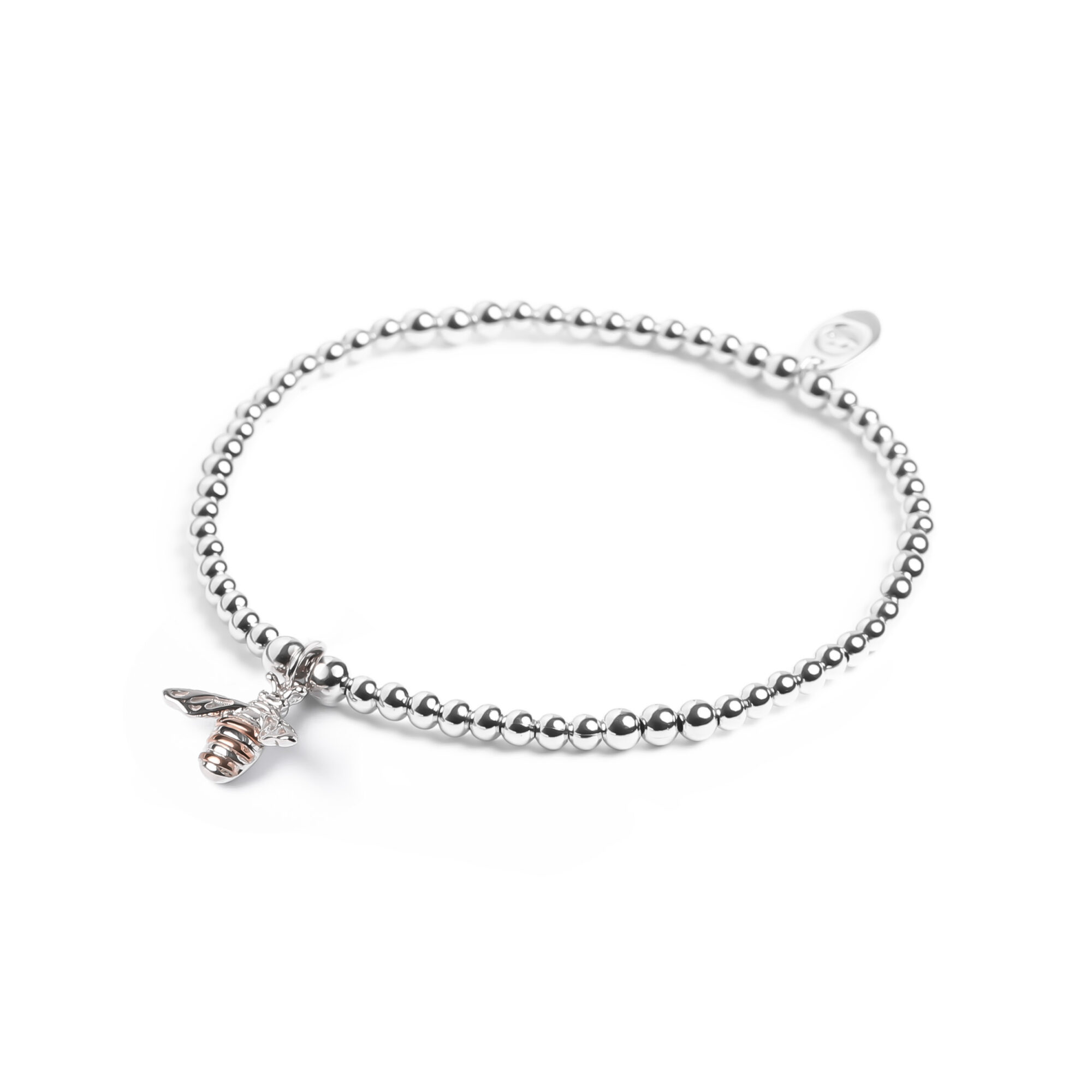 In the middle of spring, magic occurs, the beautiful honey bee buzzes back and forth carrying pollen from one blossom to another. In modern folklore this mesmerising creature serves as a charm for health, wealth and wisdom. This beautifully elegant Honey Bee Affinity stretch bracelet features a delightful honey bee charm. Crafted from sterling silver adorned with 9ct rose gold, this charming bracelet could be the perfect gift for a loved one or as a treasured keepsake for yourself.