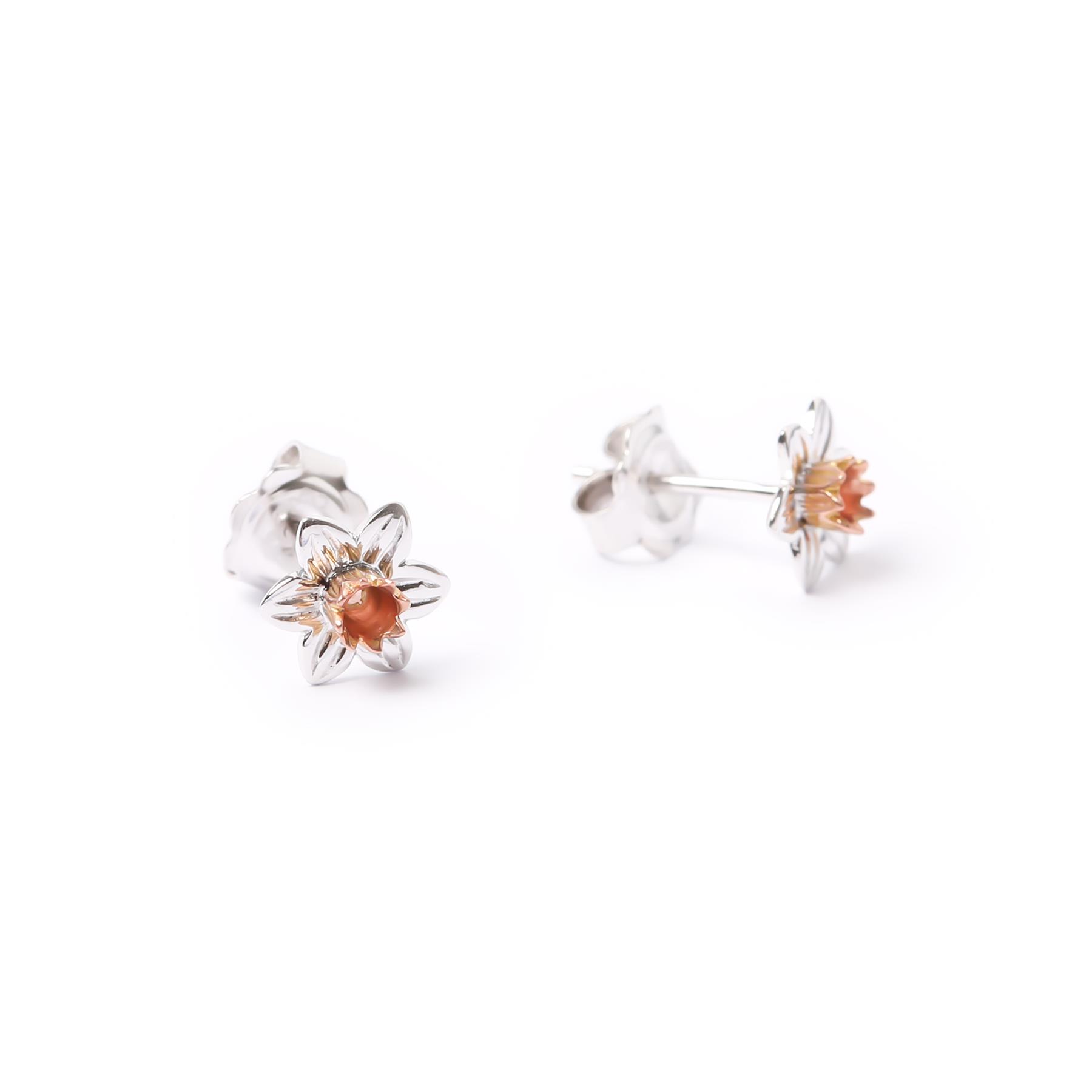 These dainty Daffodil stud earrings feature elegant 9ct rose gold trumpets that sit perfectly on sterling silver petals. The Daffodil stud earrings are perfect for every day wear and will suit any occasion or attire. Featuring a butterfly fastening at the back, the Daffodil stud earrings contain rare Welsh gold, making them tr