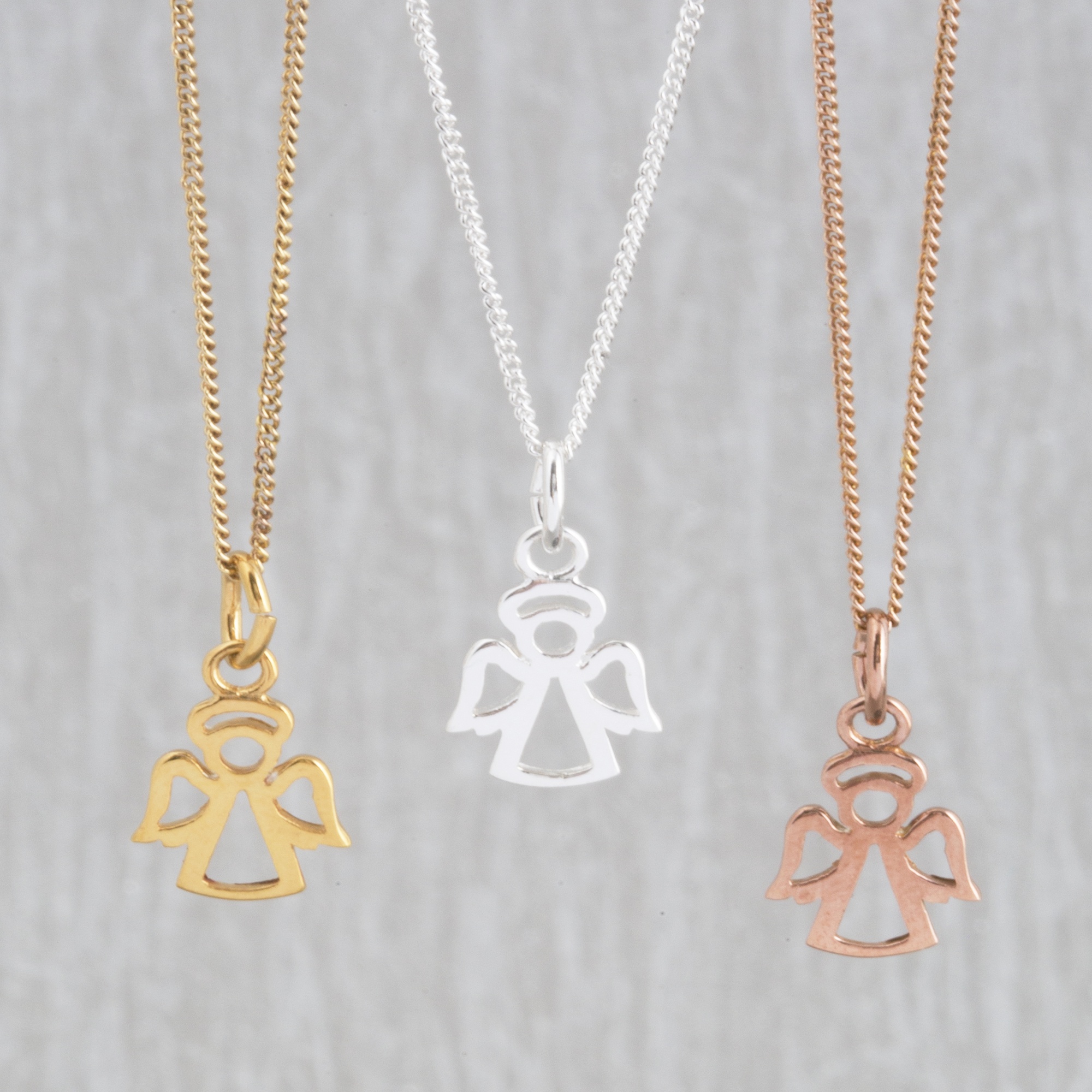 Dainty sterling silver open Angel pendant. Available in sterling silver (.925), 18ct yellow gold plate over sterling silver (.925) or 18ct rose gold plate over sterling silver (.925).