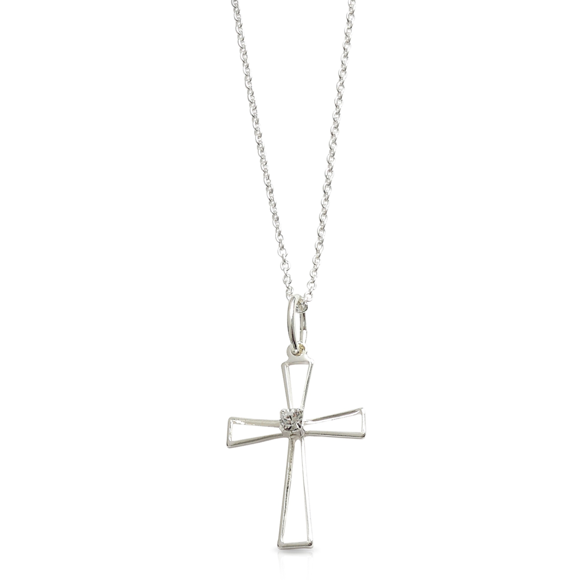 Elegant cross pendant with crystal centre. Available in sterling silver plate, 18ct yellow gold plate or 18ct rose gold plate.