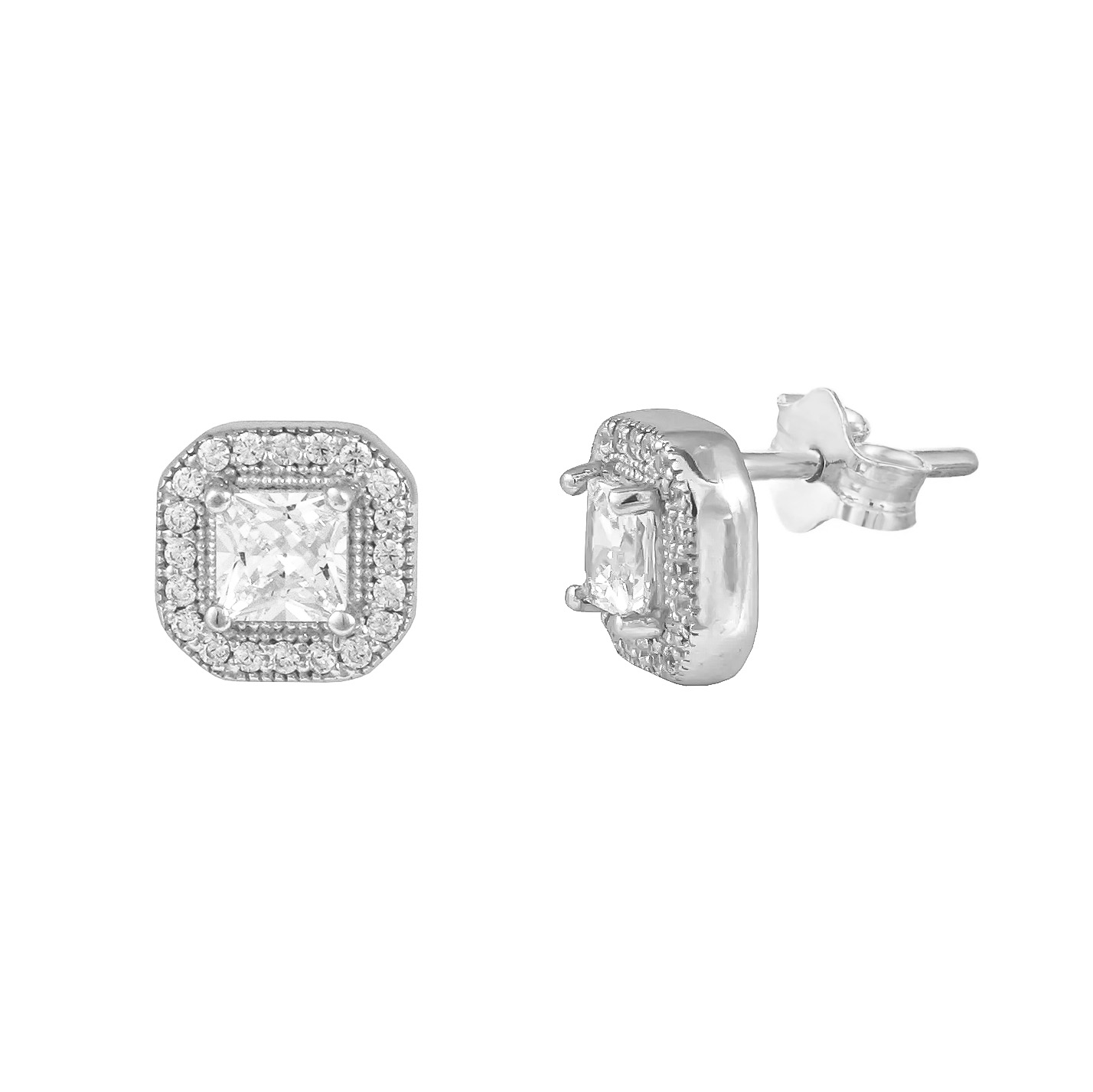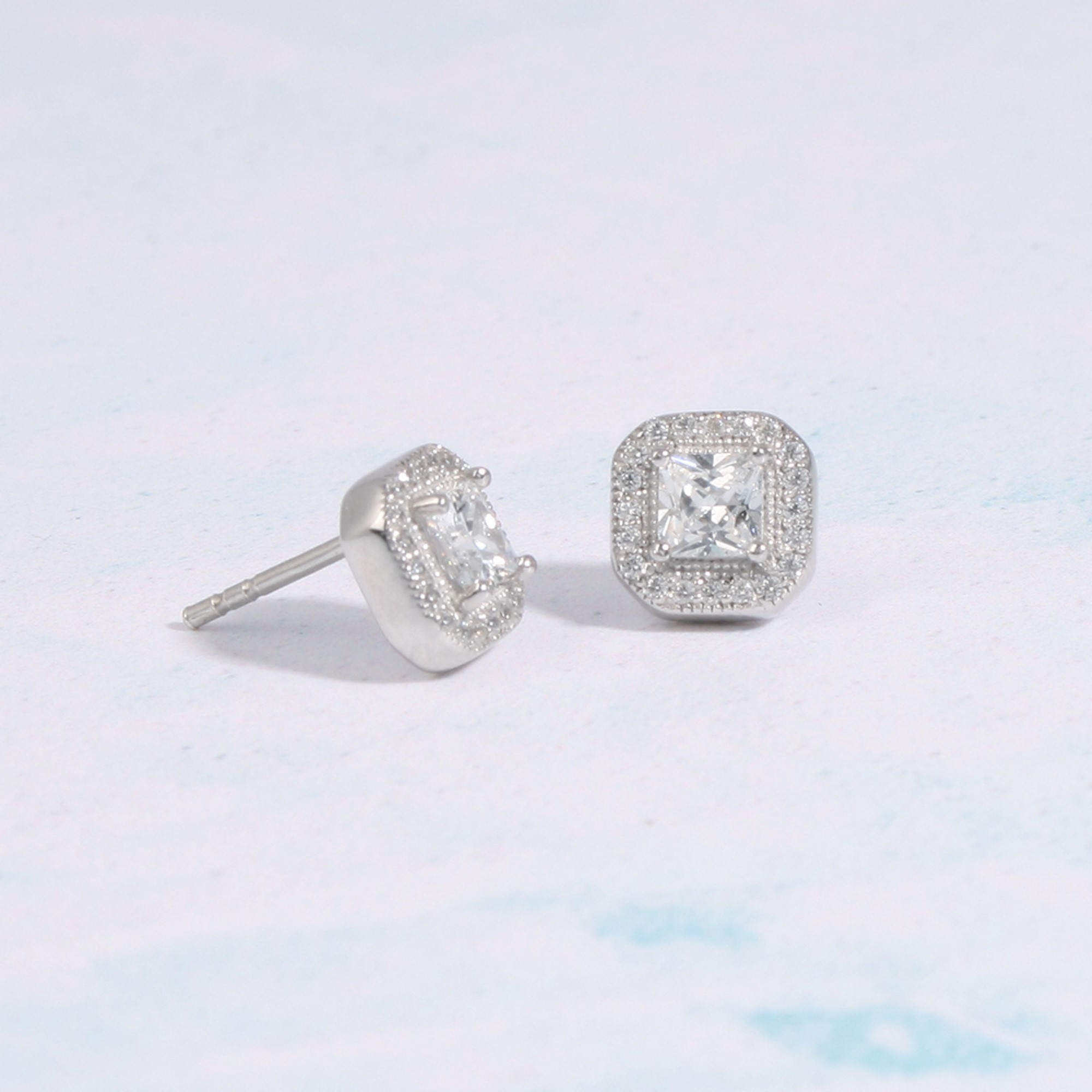An example of the ever-popular halo design, the Elizabeth studs feature a princess cut cubic zirconia, surrounded by further CZ stones Catching the light at every angle, these really are a must-have for your jewellery box. Why not pair them with our square halo pendant to create an elegant set?