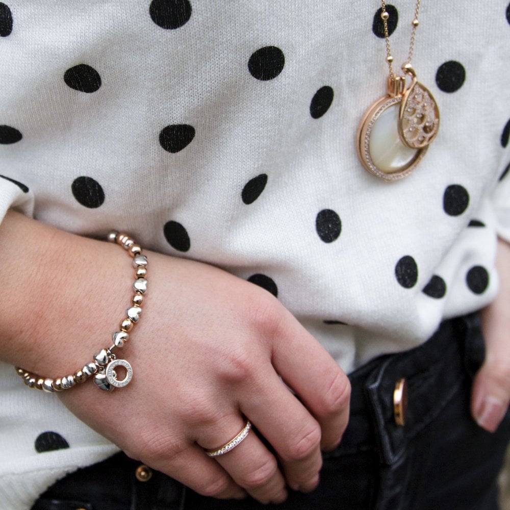 Emozioni bangles are available in a stunning array of looks from shimmering silver to glamorous gold with a touch of colourful radiance. In a two tone silver and rose gold plated finish with dainty heart charm. Comes in official Emozioni packaging. Part of Hot Diamonds.