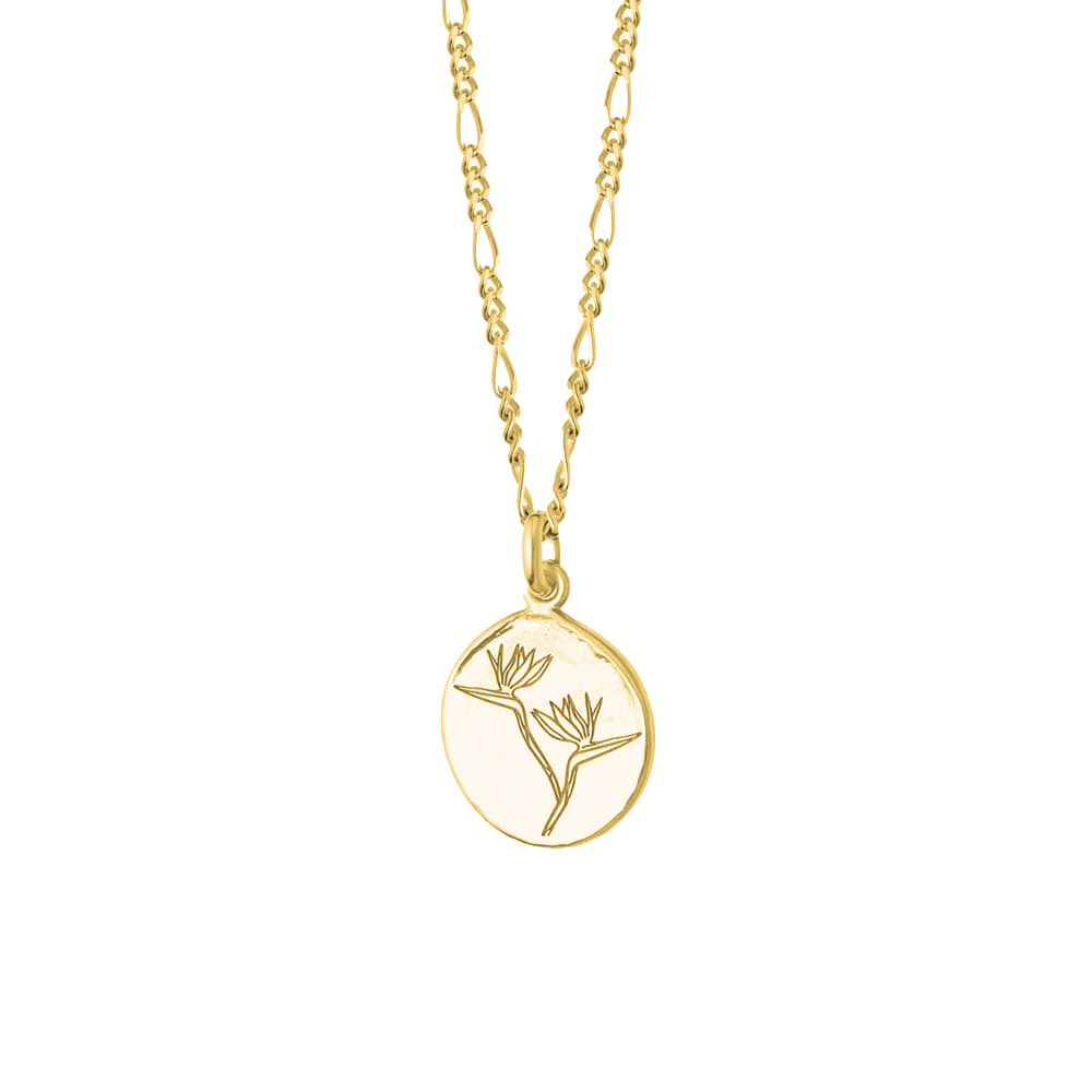 A symbol of paradise, freedom and joy this stunning bird of paradise pendant is the perfect gift for someone special or yourself. Crafted in sterling silver, the circular pendant is embossed with a bird of paradise illustration. The pendant is set upon a Figaro chain.