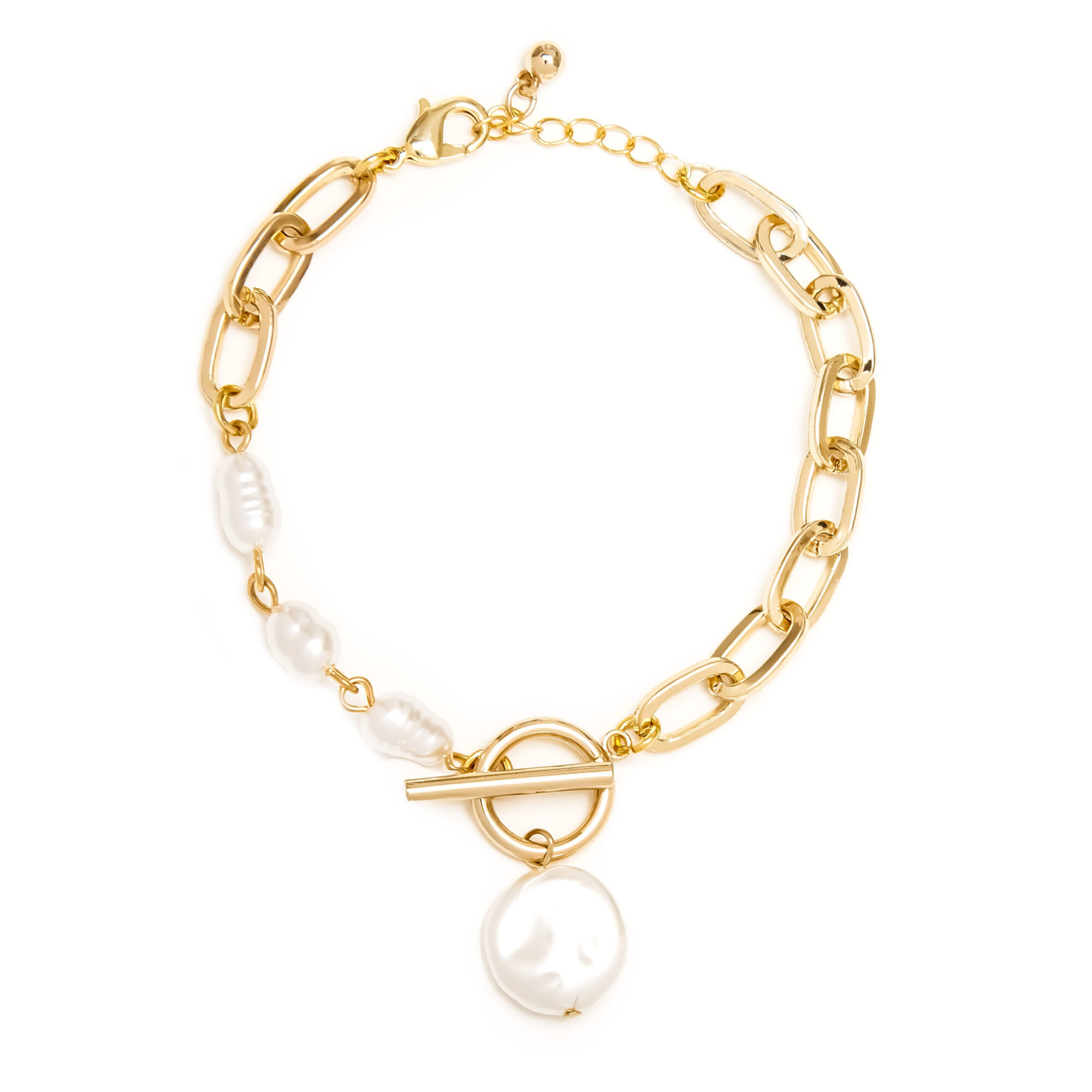 Introducing our Gold Plated Baroque Pearl T-Bar Link Bracelet – an exquisite piece that seamlessly blends timeless elegance with modern style. This bracelet features baroque pearls gracefully linked with a T-bar closure, all adorned with a luxurious gold-plated finish. The design exudes sophistication, making it a versatile accessory for any occasion. Elevate your wrist with this unique combination of classic pearls and contemporary style, adding a touch of refined glamour to your look.