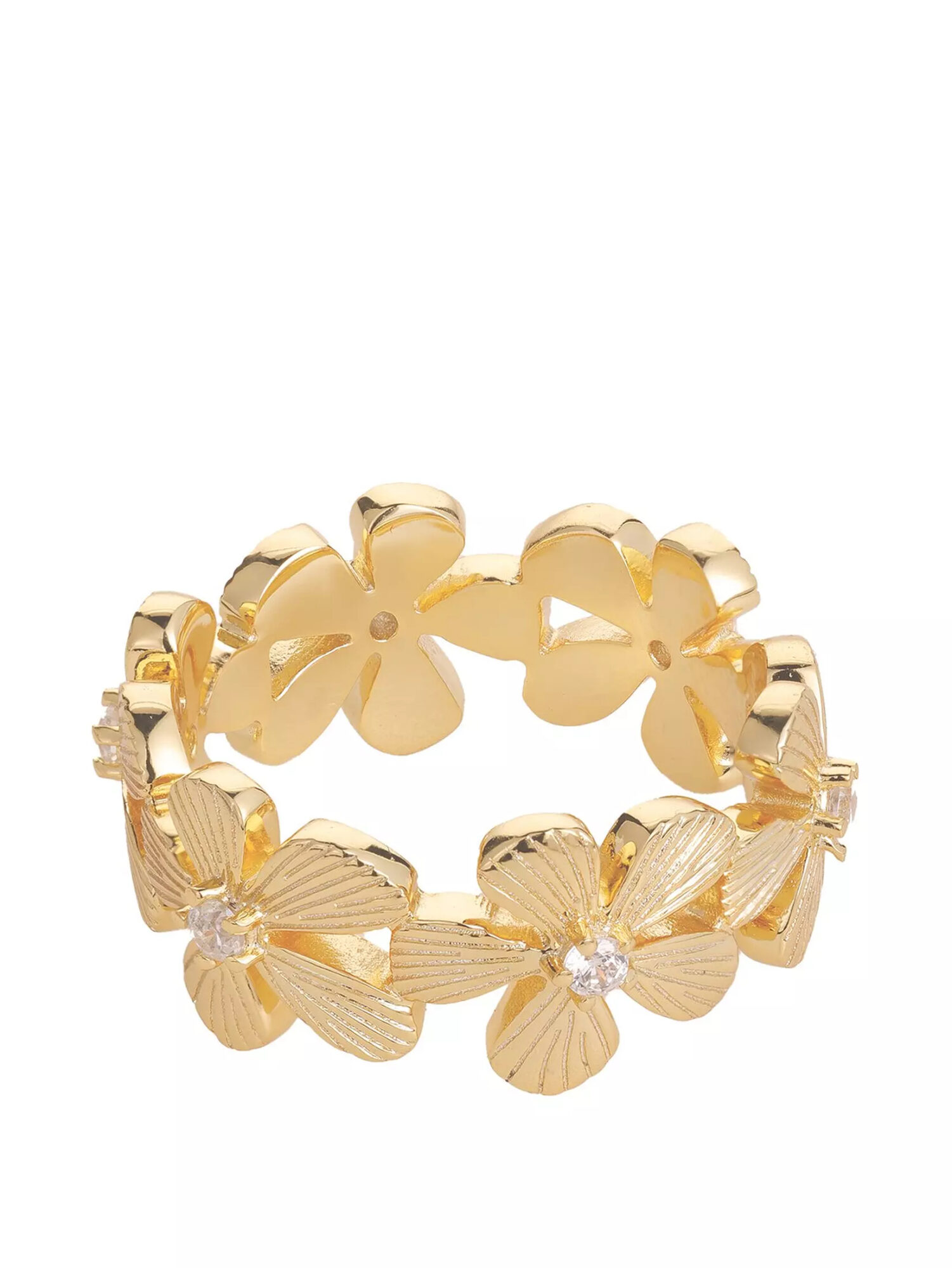 Turn heads with this Gold Plated Large Floral CZ Ring, a striking piece designed to dazzle. Crafted in gold-plated metal and adorned with sparkling cubic zirconia stones, it features an intricate floral design that radiates elegance and charm. The bold size makes it perfect for special occasions or elevating everyday looks with a touch of glamour. Whether worn solo or paired with other accessories, this ring is a statement piece that captures attention and celebrates your unique style.
