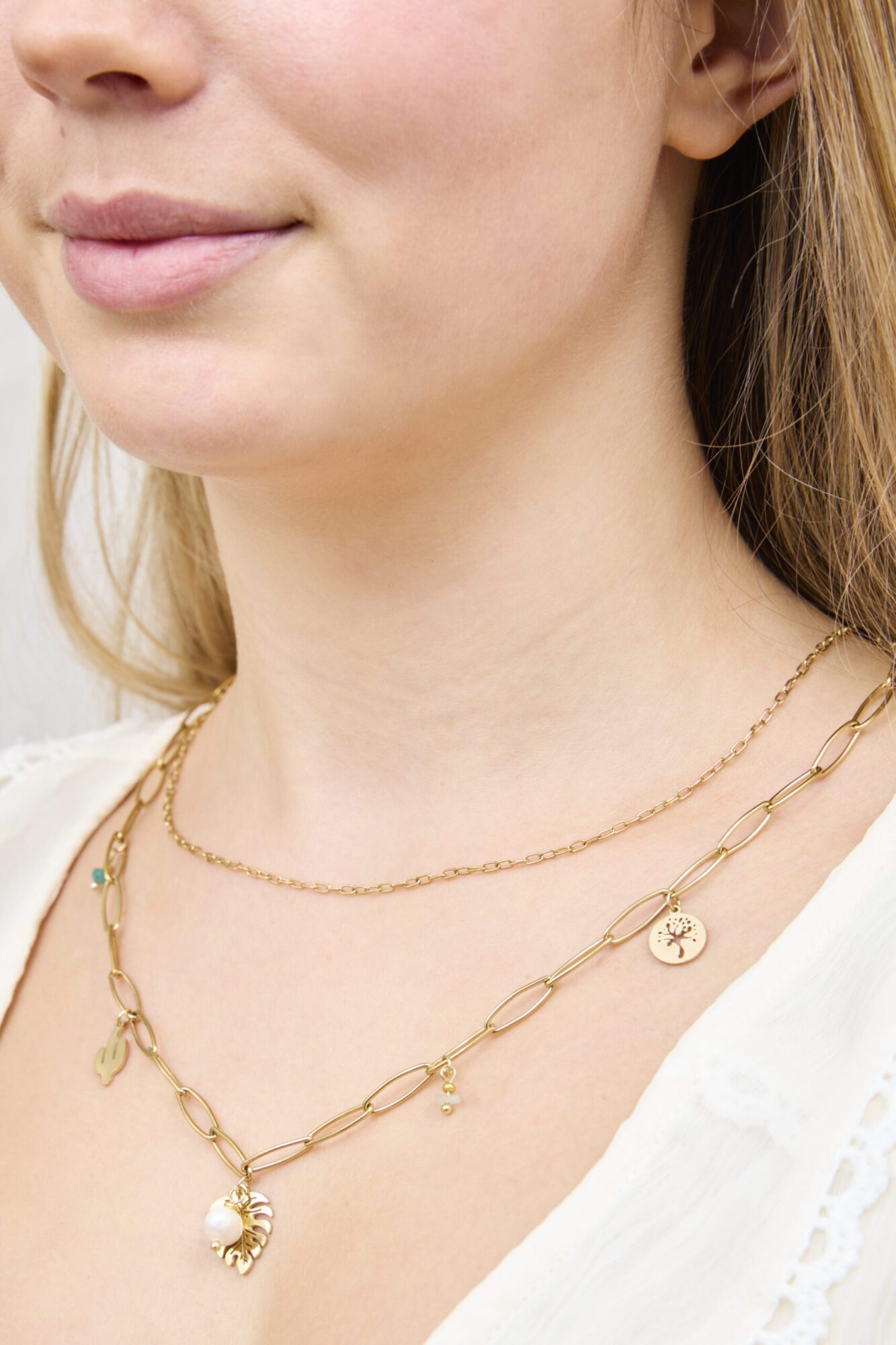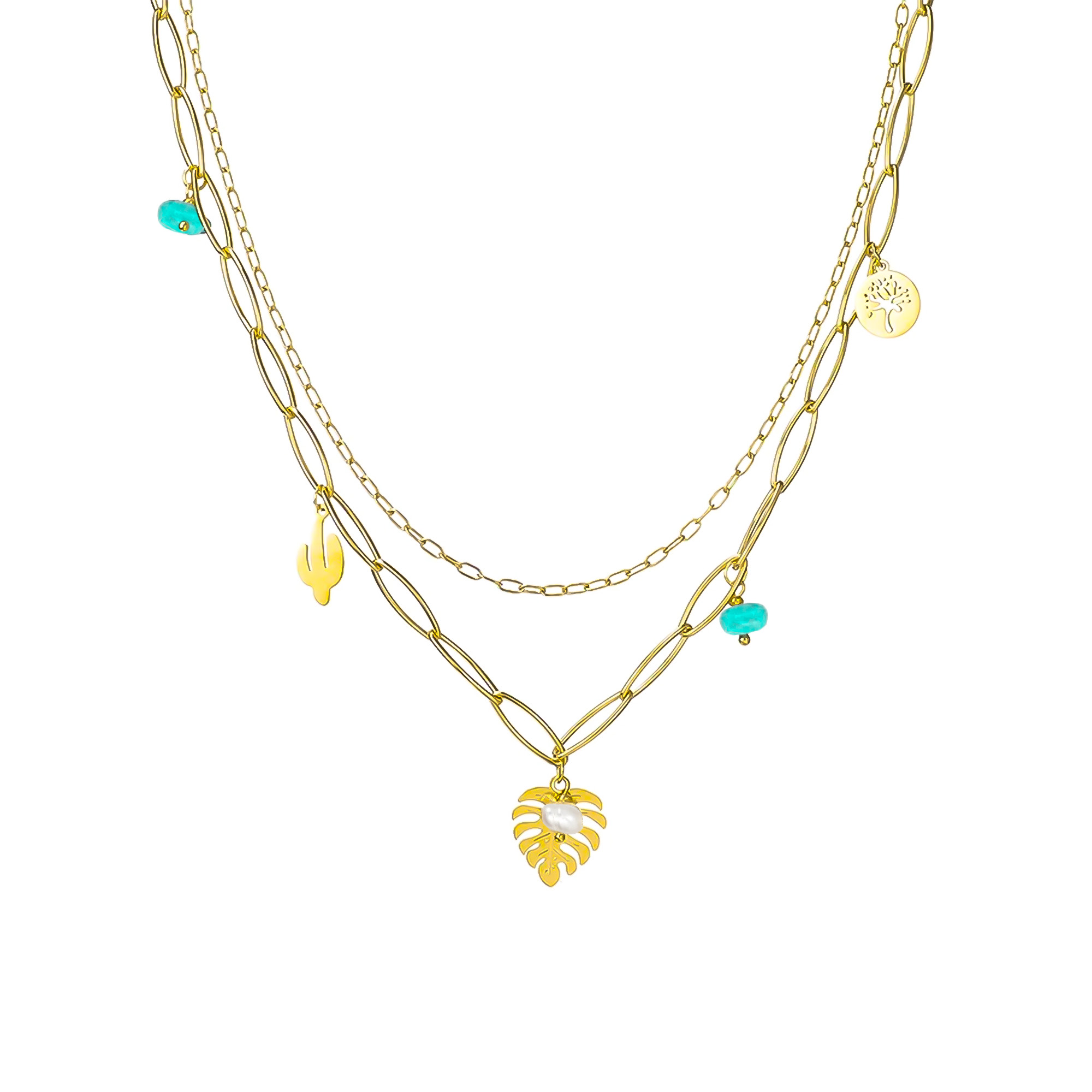 This elegant double-layer necklace showcases gold-plated leaf charms paired with sparkling green stone accents. Inspired by nature, it adds a sophisticated and delicate touch to any outfit. Lightweight and versatile, this necklace is perfect for everyday wear or special occasions, making it a timeless addition to your jewellery collection.