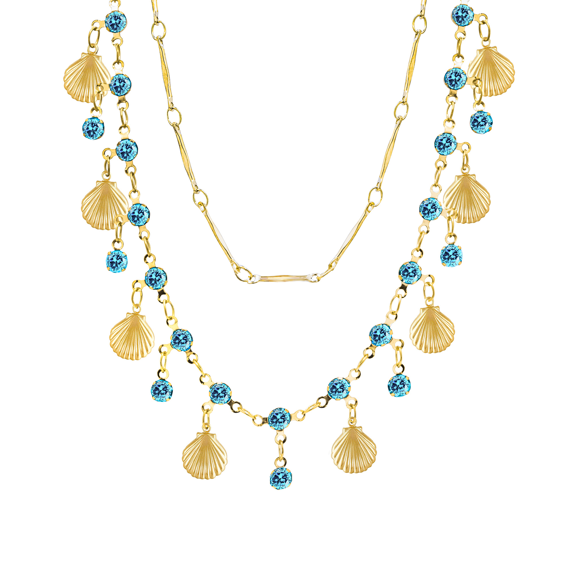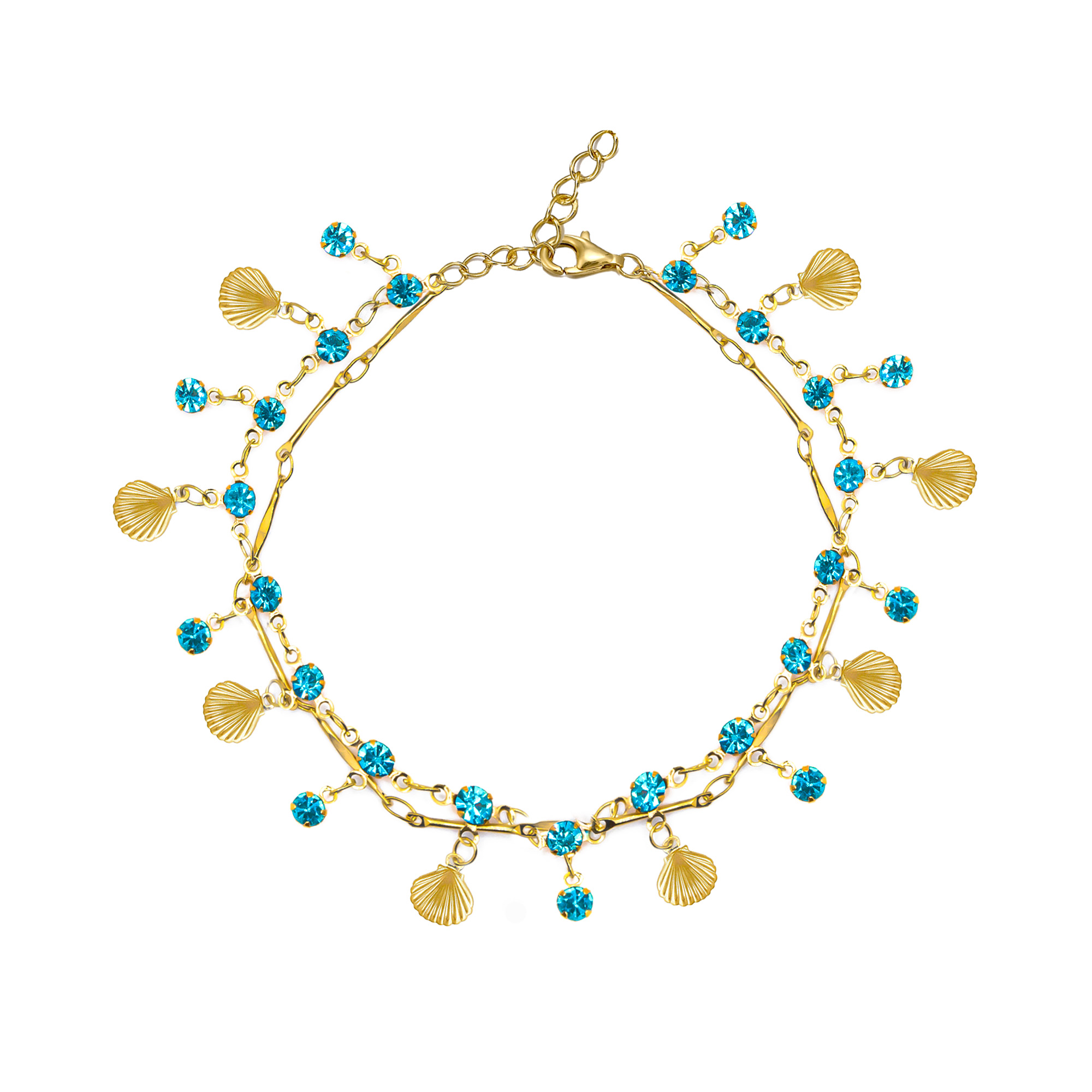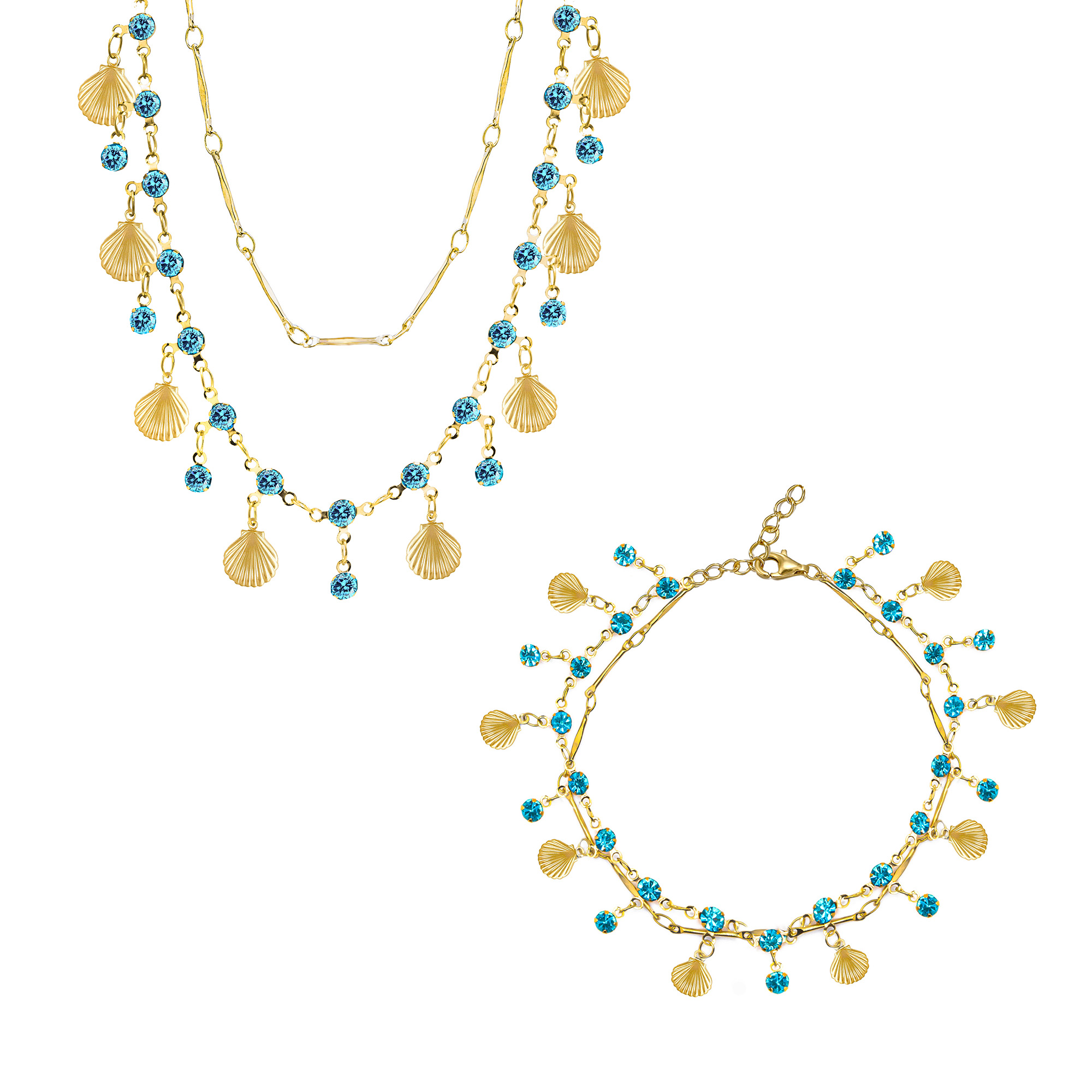 This Gold Plated Shell and Crystal Double Layer Necklace and Bracelet Set combines coastal charm with elegant sparkle. Featuring a double-layer necklace and a matching bracelet, both adorned with gold-plated shells and shimmering crystals, this set adds a refined touch to beach-inspired or casual chic outfits. Lightweight and versatile, it’s the perfect accessory duo for those who love coordinated, stylish jewellery with a seaside vibe.