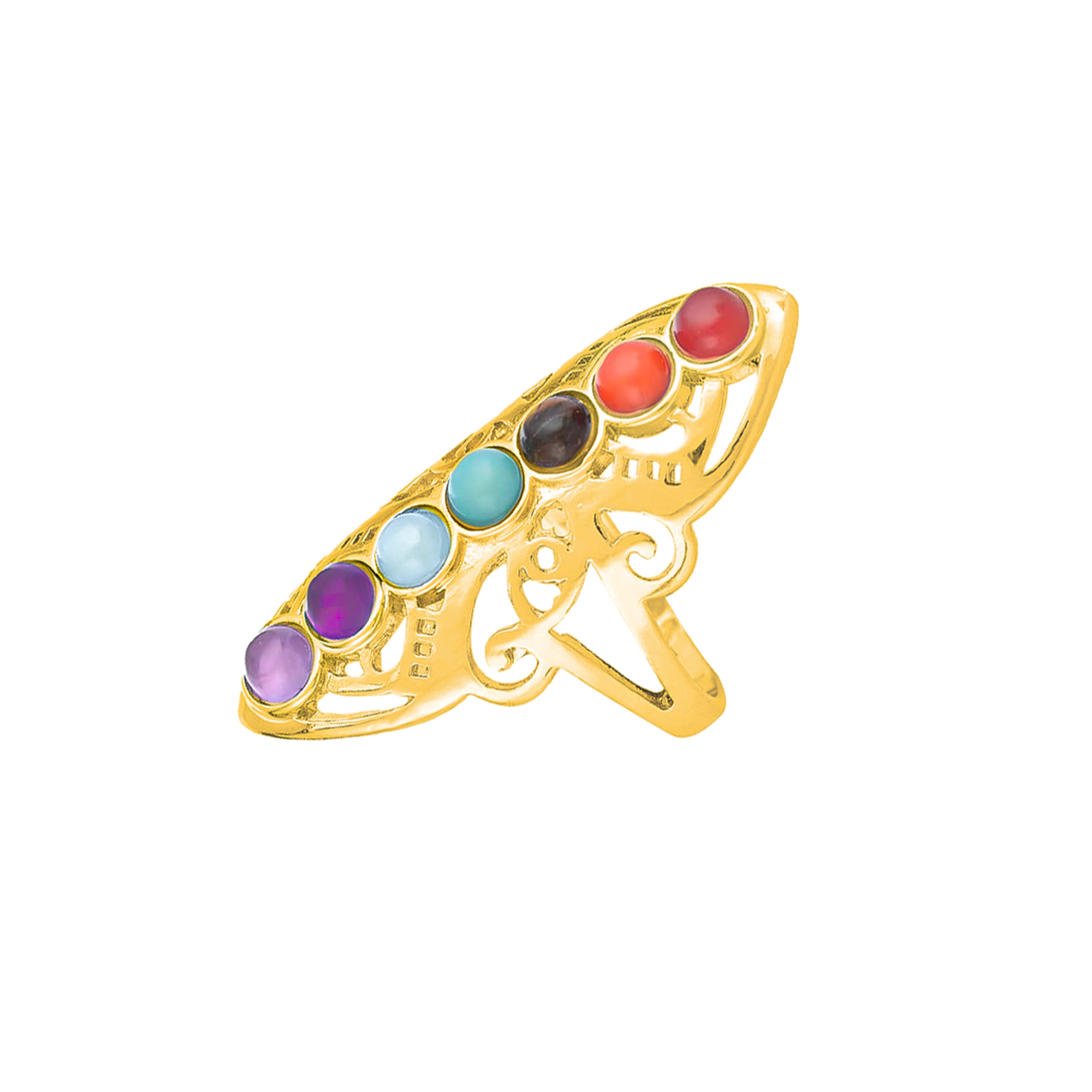 Add a vibrant splash of colour with this gold-plated multicolour crystal ring. Featuring a dazzling array of colourful crystals set in a bold design, this statement piece radiates glamour and liveliness. Perfect for elevating any outfit, it effortlessly adds a striking touch of sparkle and personality to your jewellery collection.