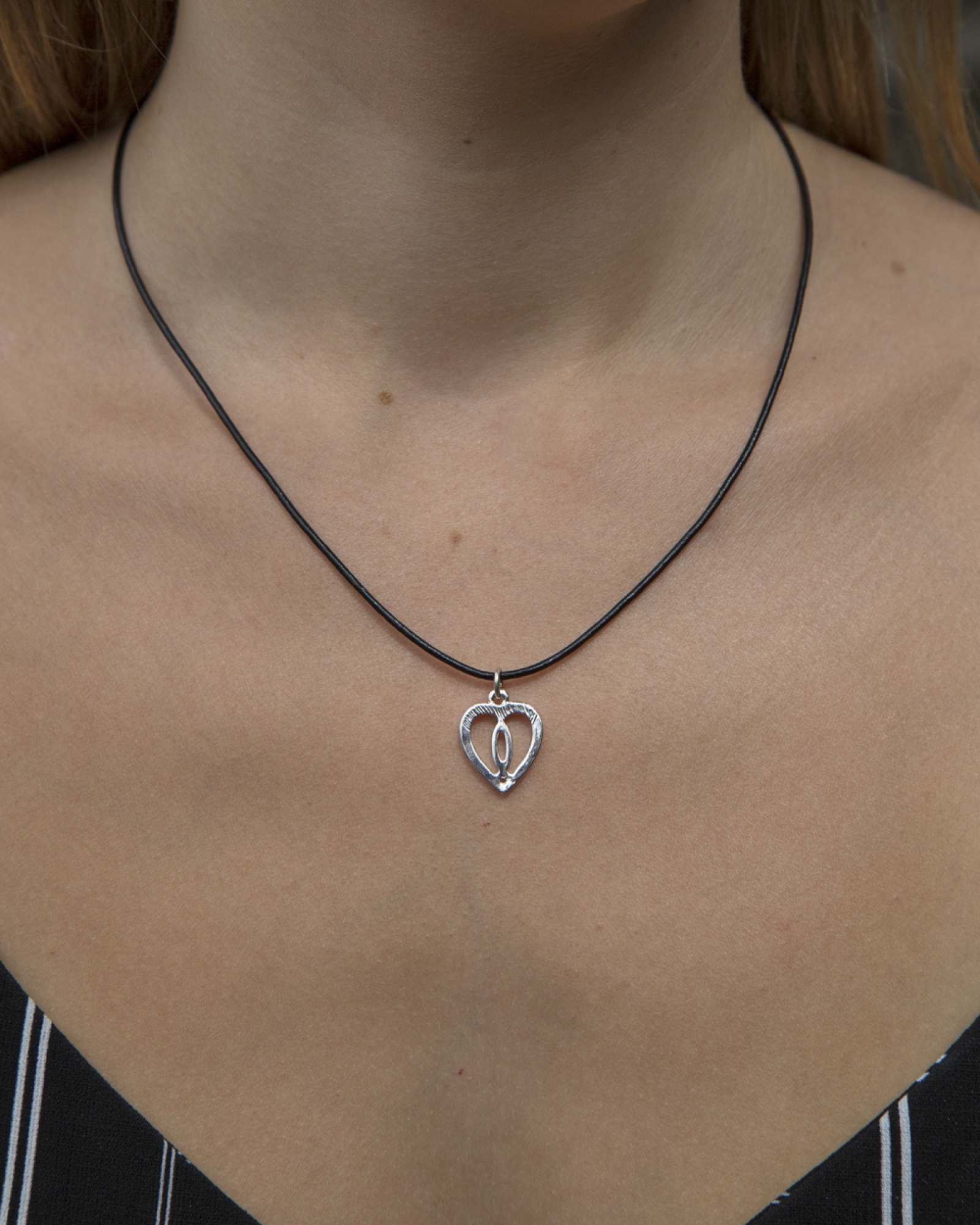 Heart pendant centred with ichthys fish on a leather cord.Available in bright silver plate, 18ct yellow gold plate or 18ct rose gold plate.