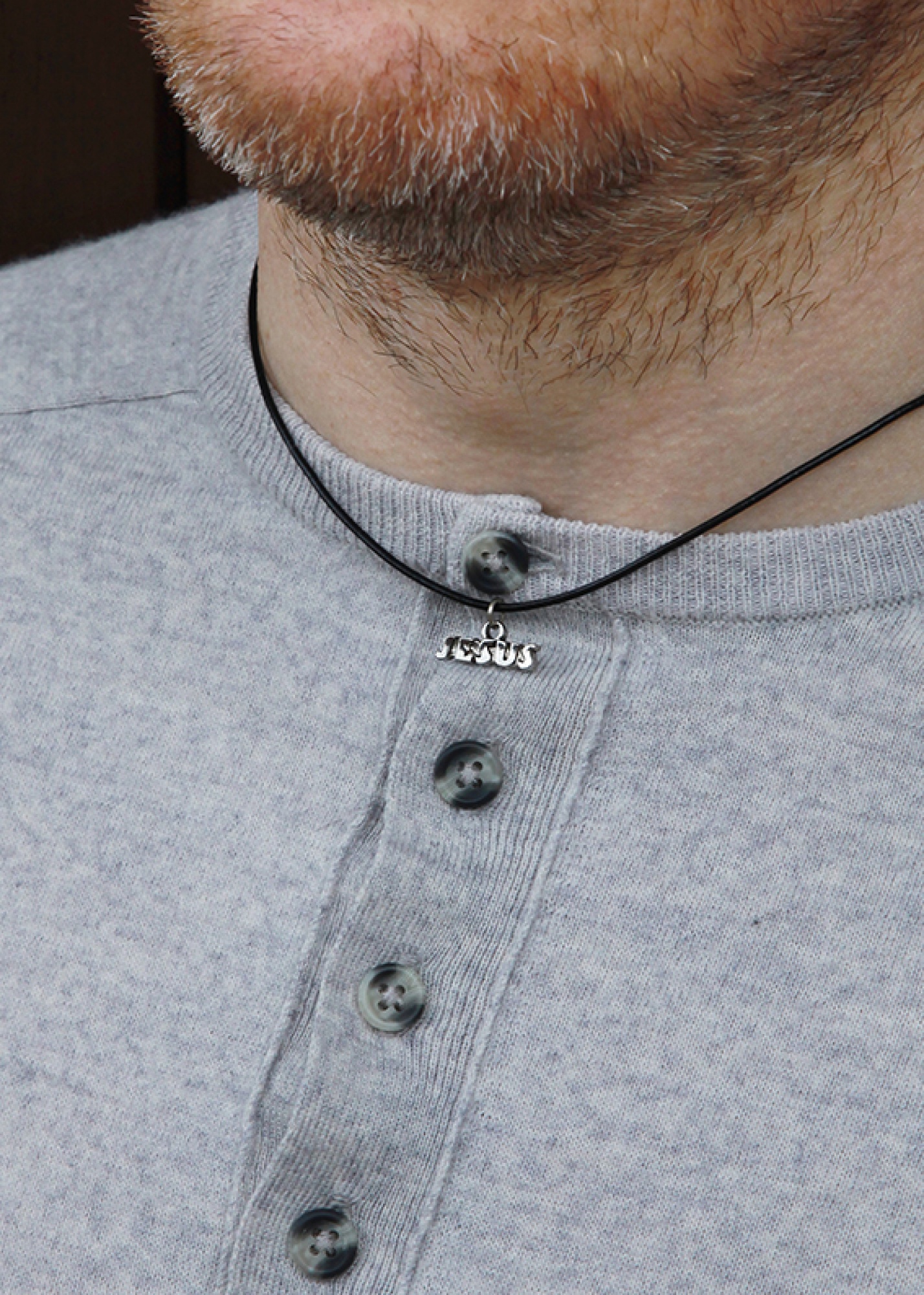 Jesus pendant on a leather cord.