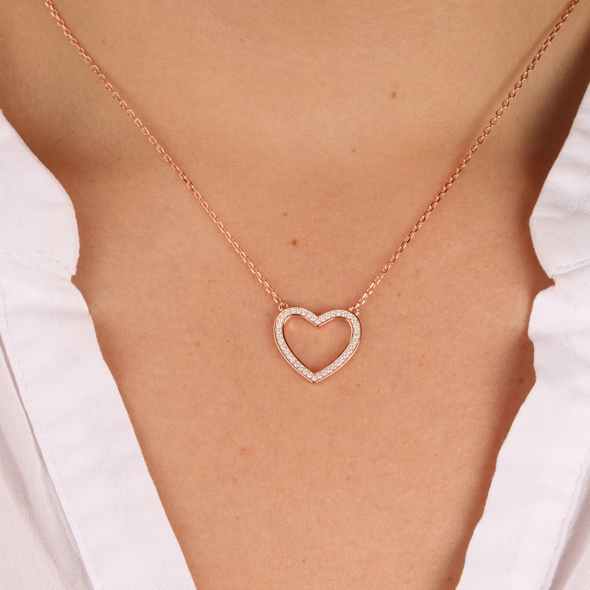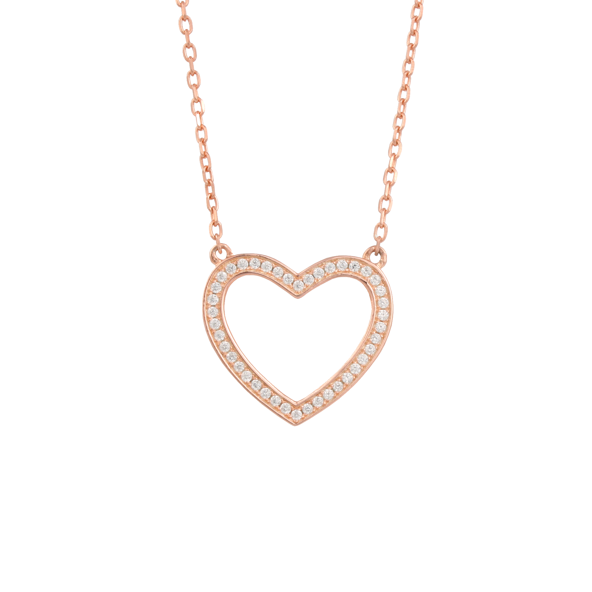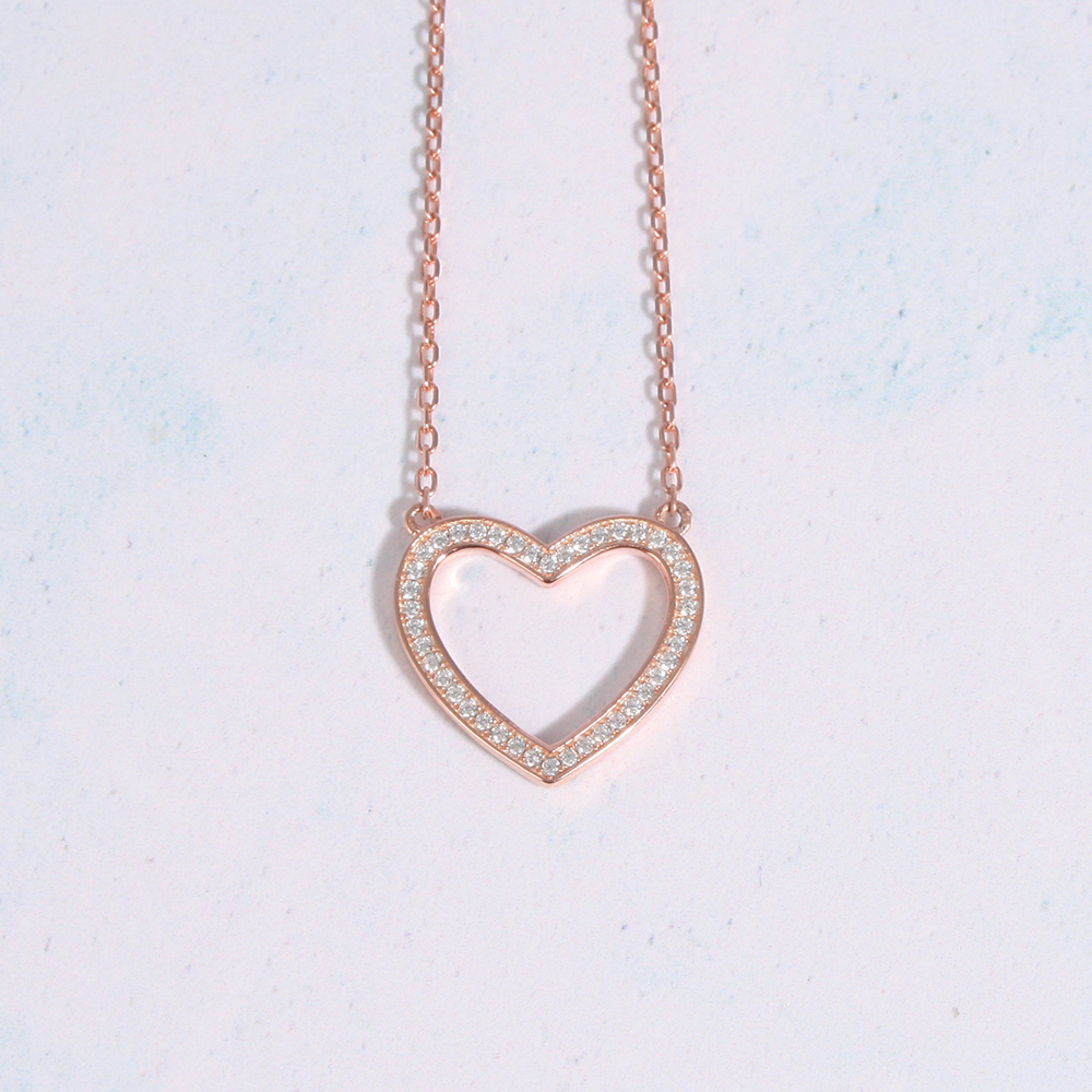 Juliet – Rose Gold Plate Openwork Heart Necklace brings together soft sparkle, romantic shape, and easy elegance in one beautifully giftable piece. The open heart design feels light and refined, while the line of CZ stones adds brightness around the curve. That balance gives the necklace a polished look without making it feel too formal. It feels special at first glance, yet it still slips easily into everyday wear.