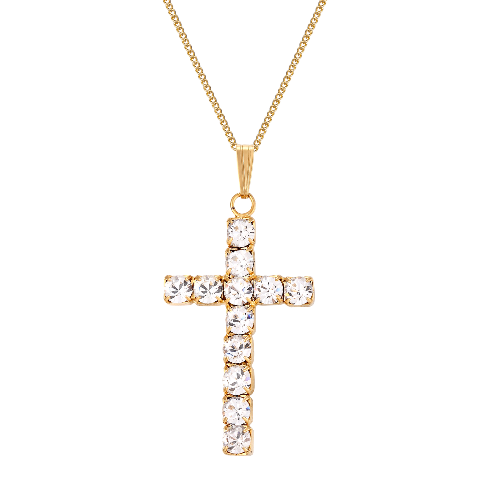 Large white Swarovski crystal cross pendant. Available in bright silver plate, 18ct yellow gold plate or 18ct rose gold plate.