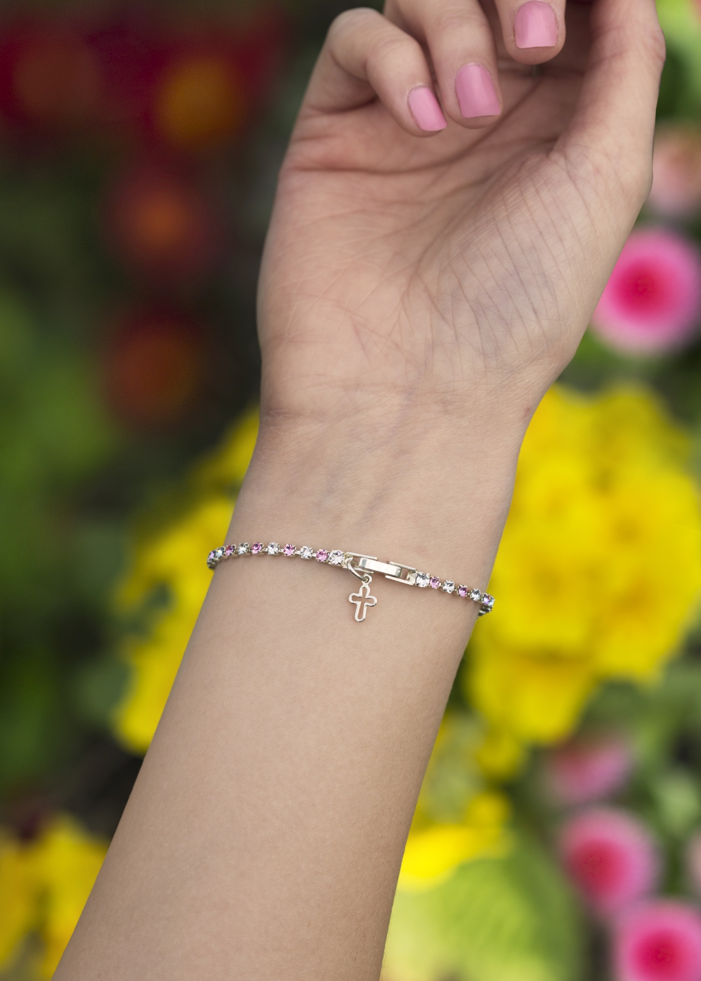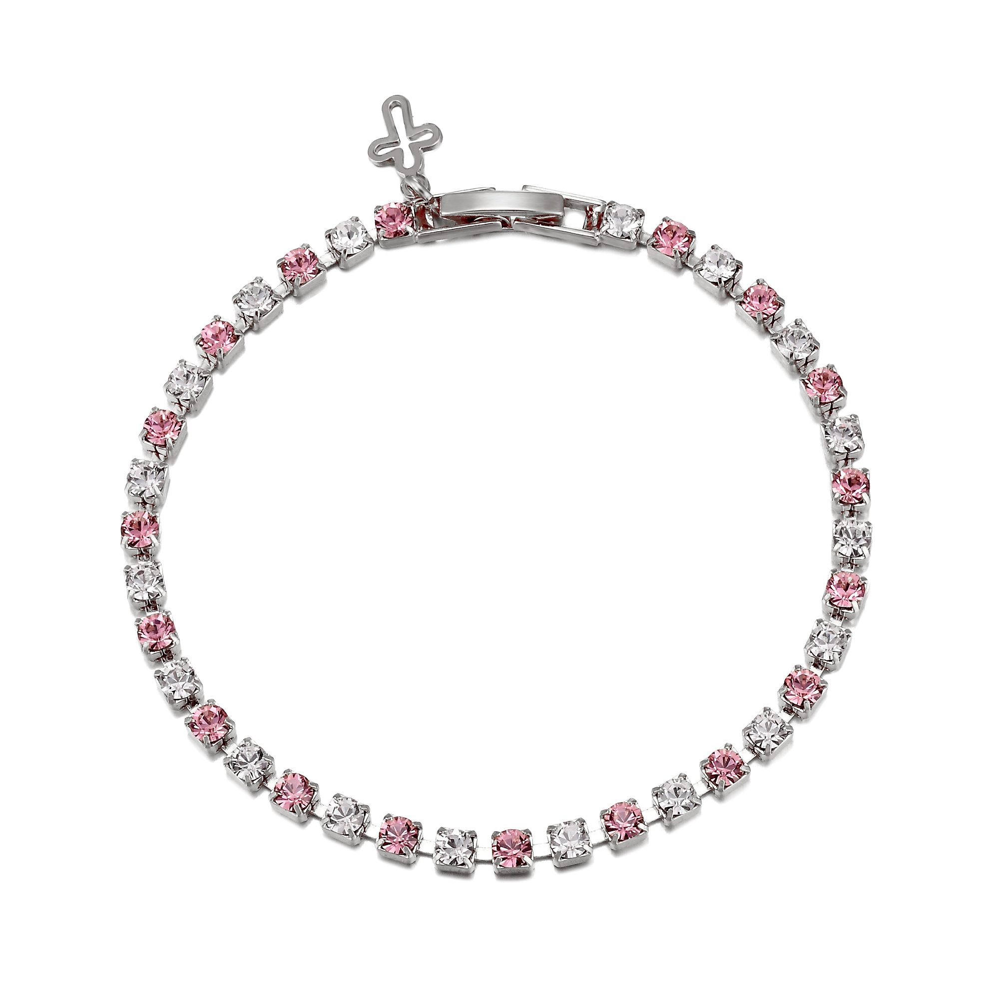 Light rose and crystal bracelet with dainty open cross charm. Available in bright silver plate, 18ct yellow gold plate or 18ct rose gold plate.