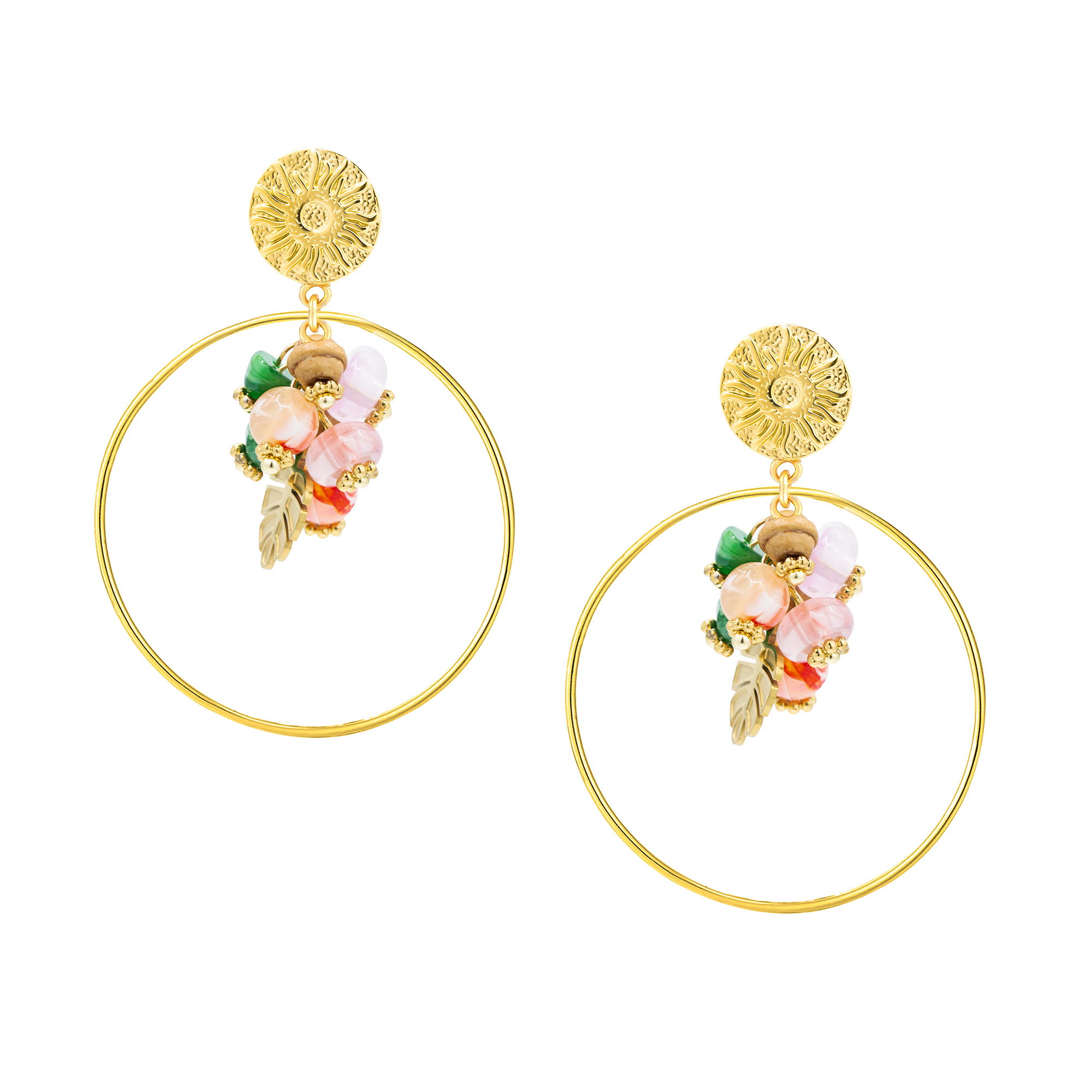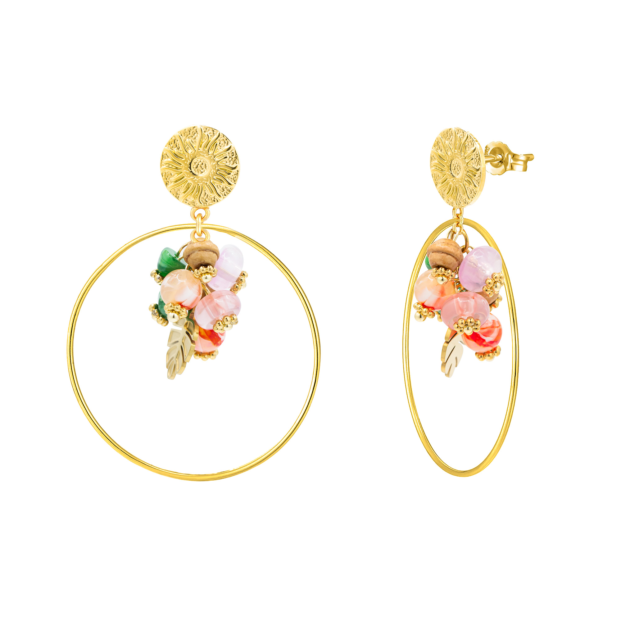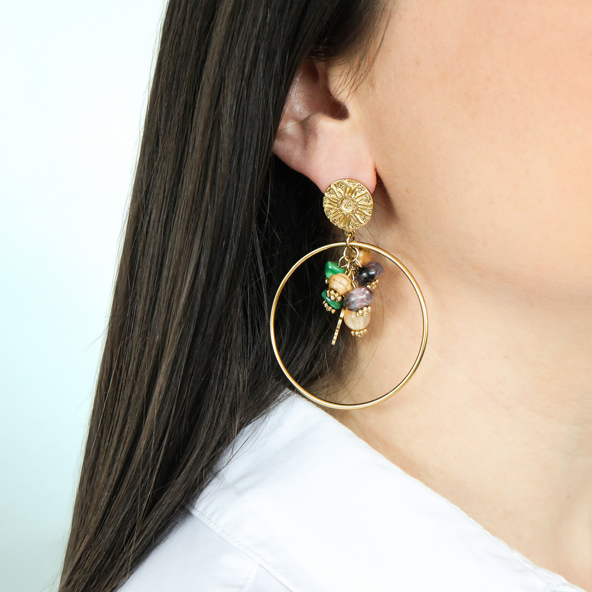 These gold plated natural stone drop earrings showcase a vibrant array of colourful stones suspended within a sleek gold hoop. Combining classic elegance with a modern twist, they add a sophisticated touch to any outfit. Lightweight and versatile, these earrings are perfect for accessorising casual ensembles or enhancing your beachwear, making them an essential addition to any jewellery collection.