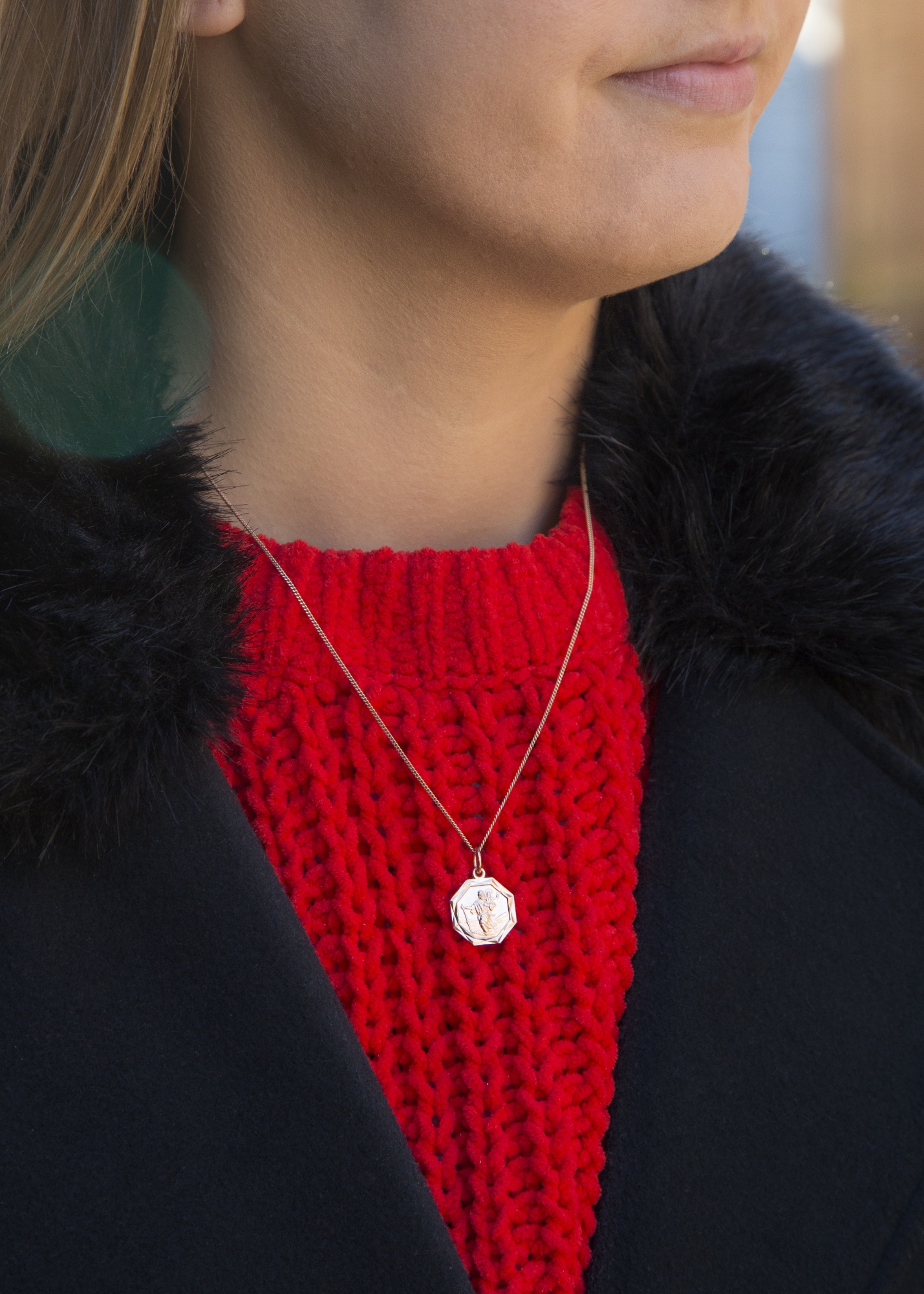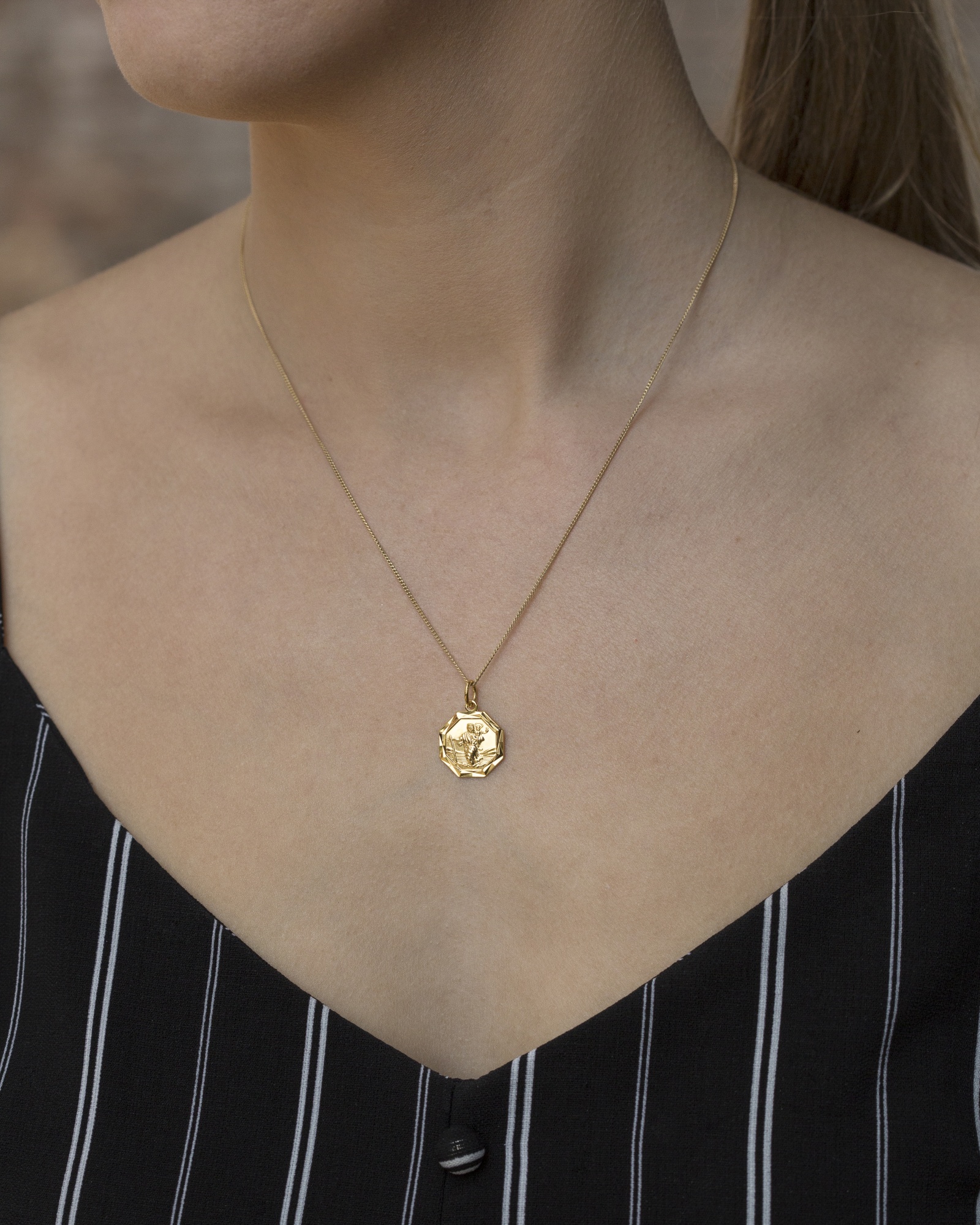 Octagonal sterling silver St Christopher pendant with diamond cut edge. Available in sterling silver (.925), 18ct yellow gold plate over sterling silver (.925) or 18ct rose gold plate over sterling silver (.925).