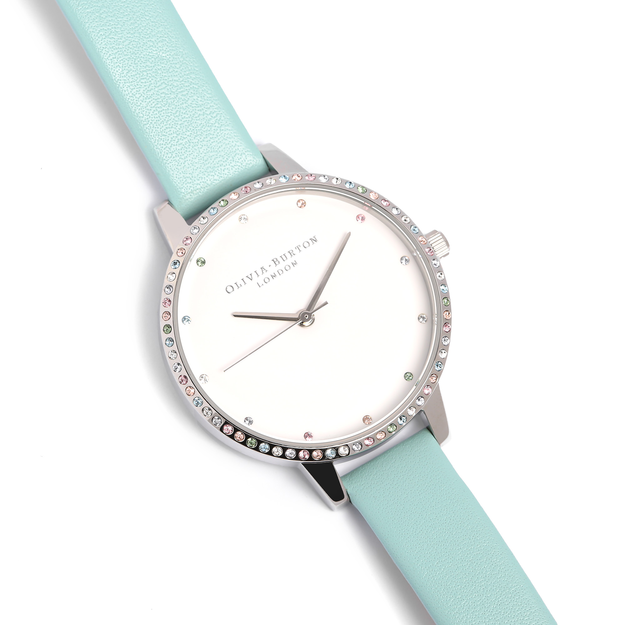 • A pop of turquoise meets rainbow sparkles in this statement timepiece. Our first ever Turquoise strap makes a cool contrast with one of our most dazzling bezels yet. A ring of sustainably-sourced rainbow crystals frame a classic white Demi dial, showing off the delicate crystal markers. Simply look down at your wrist when you need a little lift!