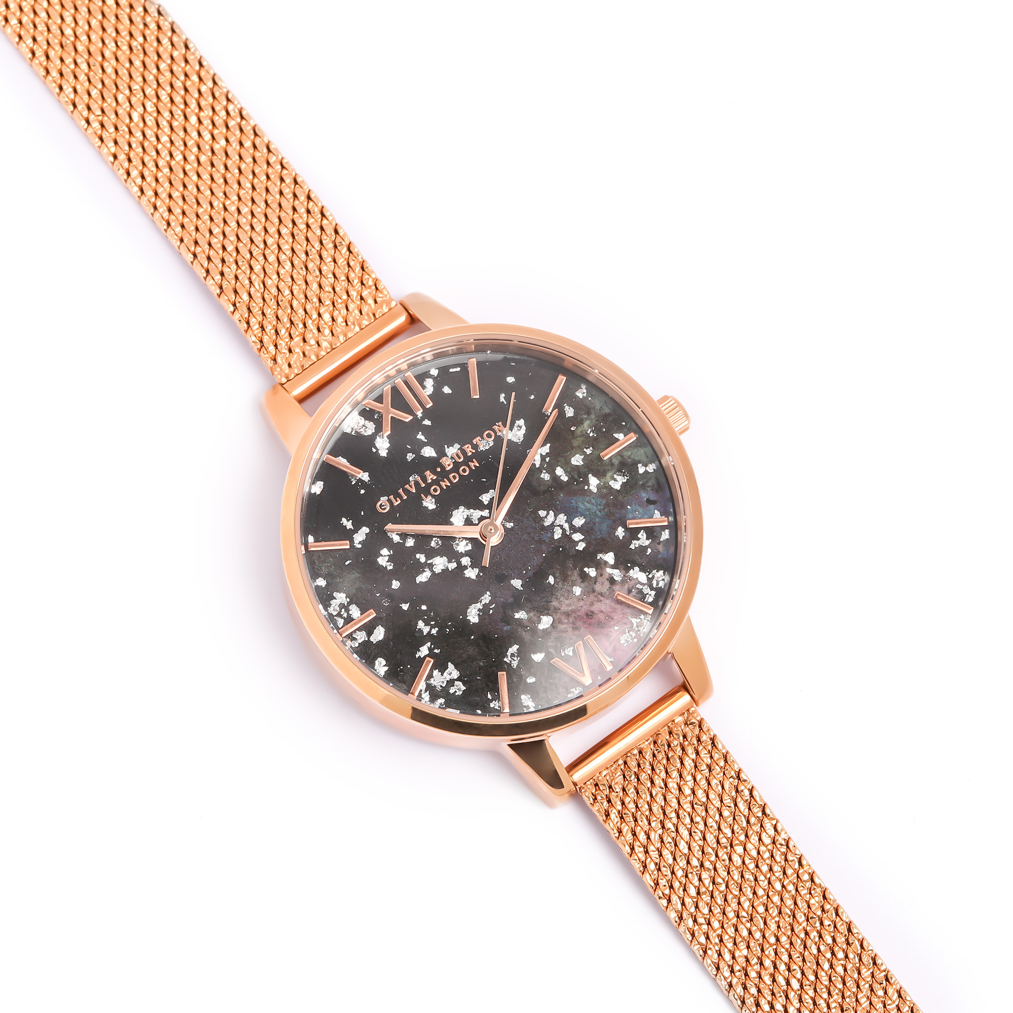 • Taking cues from the shimmering stars above, this 34mm Midi dial from Olivia Burton features iridescent metallic details, mysterious tones and ethereal prints, inspired by starry nights and shimmering skies. Rose Gold markers match the dial, and a wearable mesh strap makes this the perfect style that will go with any look.
