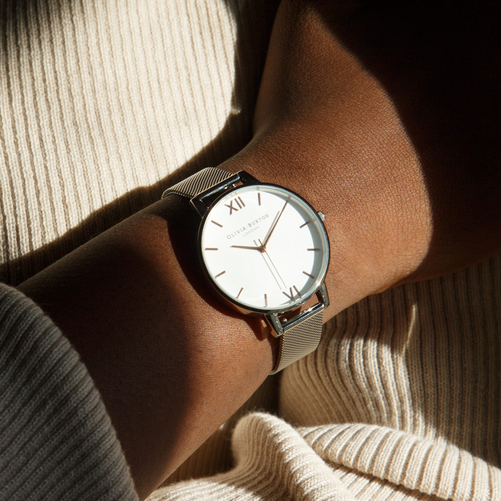 Sport a brand new look this season with this Olivia Burton watch from the White Dial collection. Designed with a slim large 38mm stainless steel case, the watch offers a pared-down silhouette with its clean dial, pointed hands, slim index hour markers and the brand’s distinctive Roman numerals at 6 and 12 o’clock. The sleek timepiece fastens with a mesh bracelet strap and a sliding clasp.