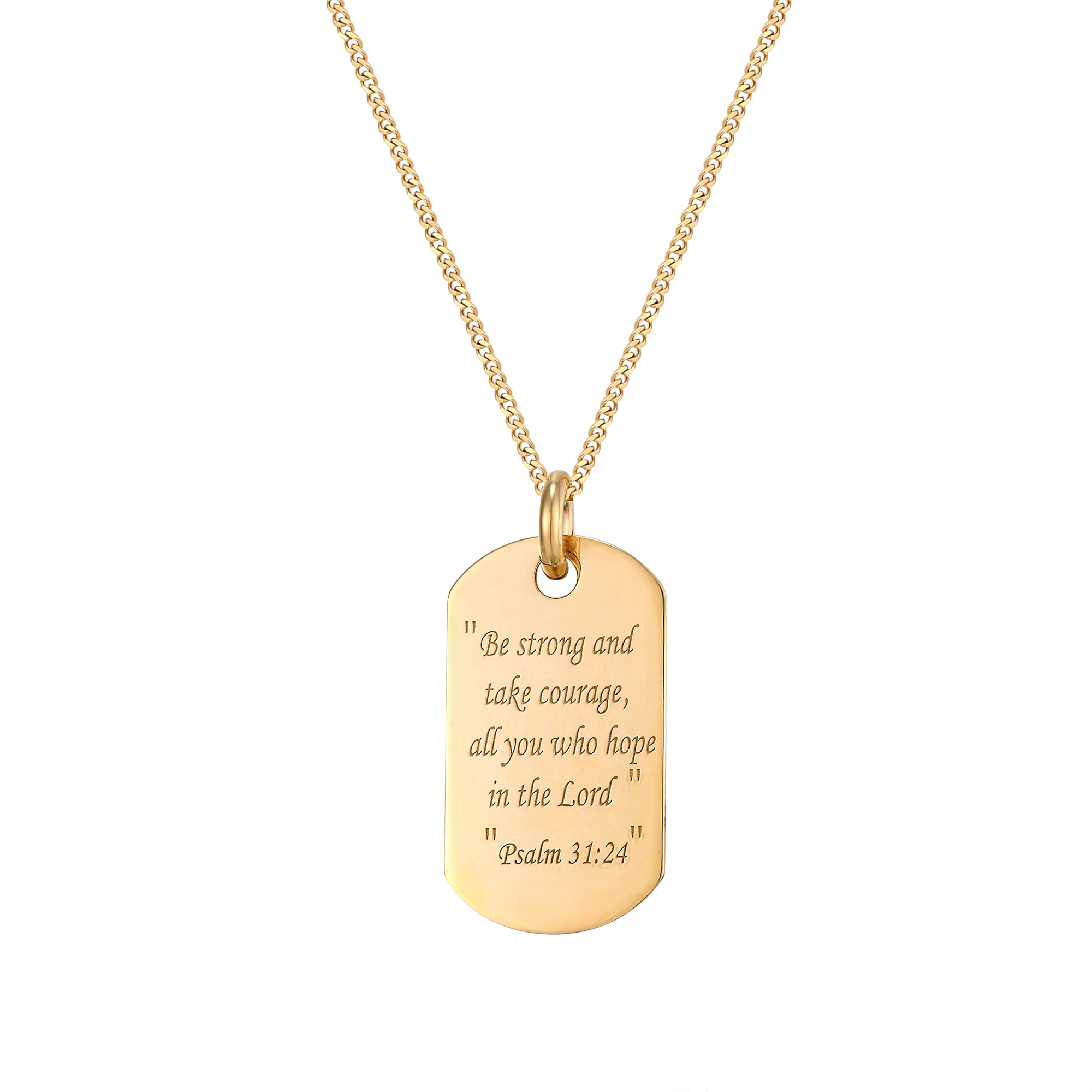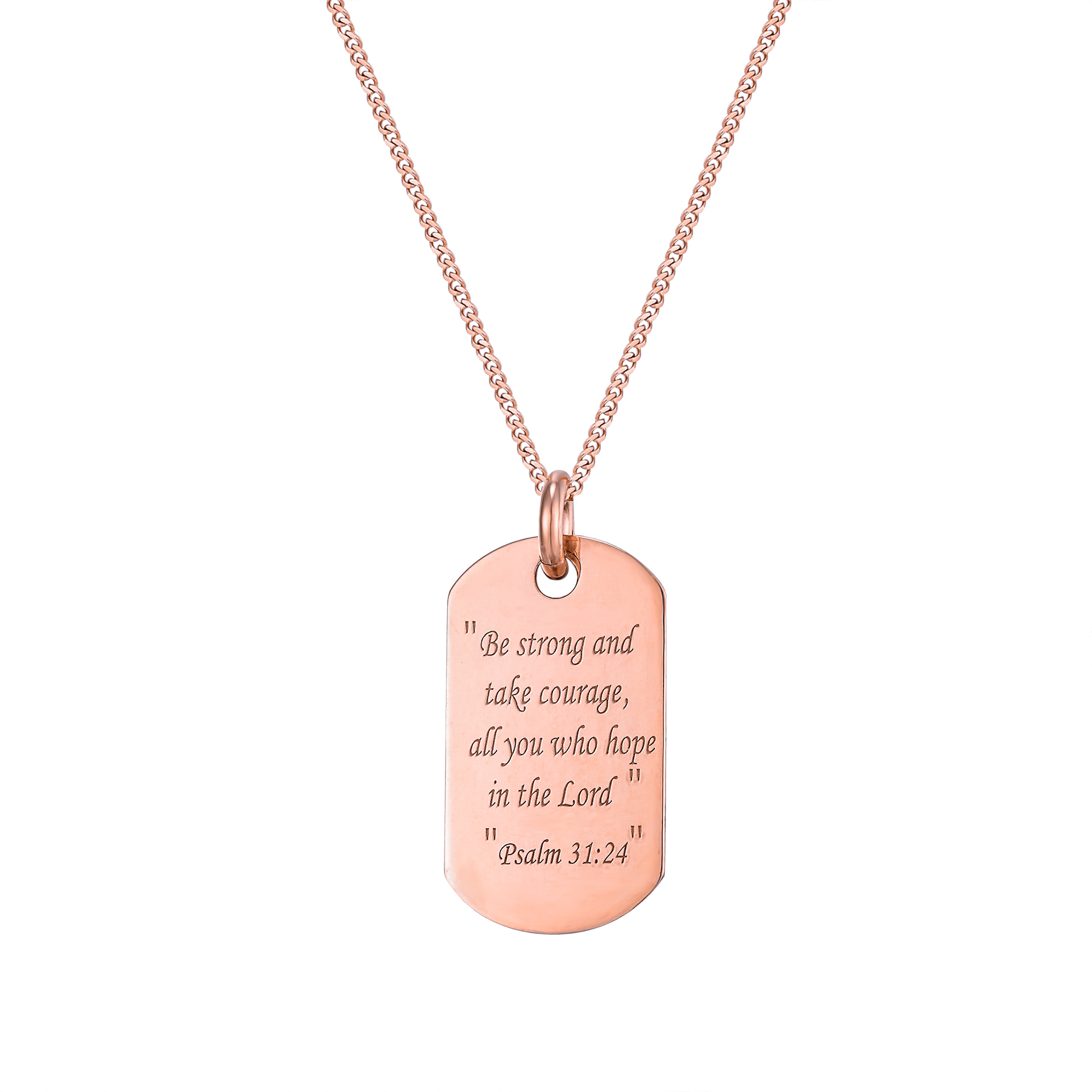 Personalised sterling silver (.925) tag pendant inscribed with the words “Be strong and take courage, all you who hope in the Lord” “Psalm 31:24”. Available in sterling silver (.925), 18ct yellow gold plate over sterling silver (.925) or 18ct rose gold plate over sterling silver (.925).