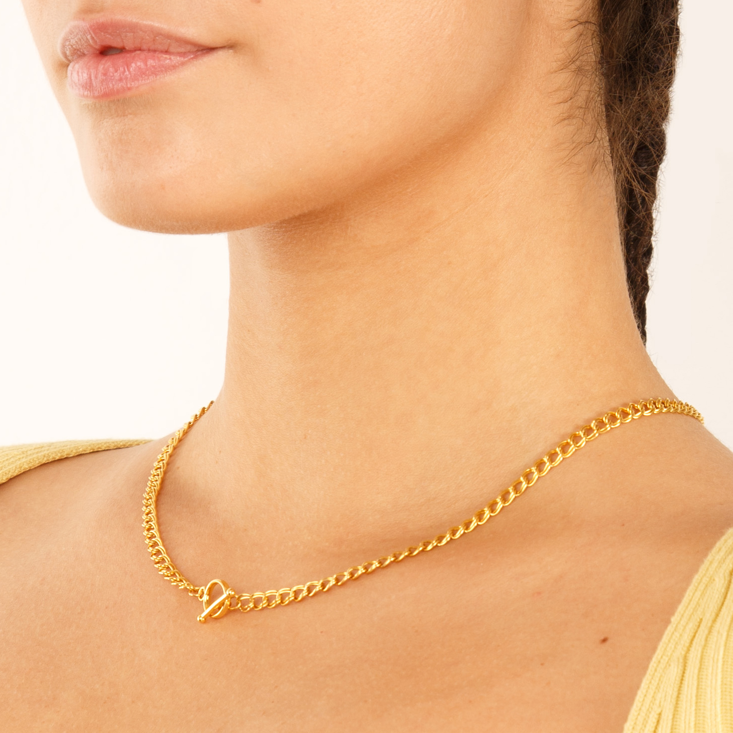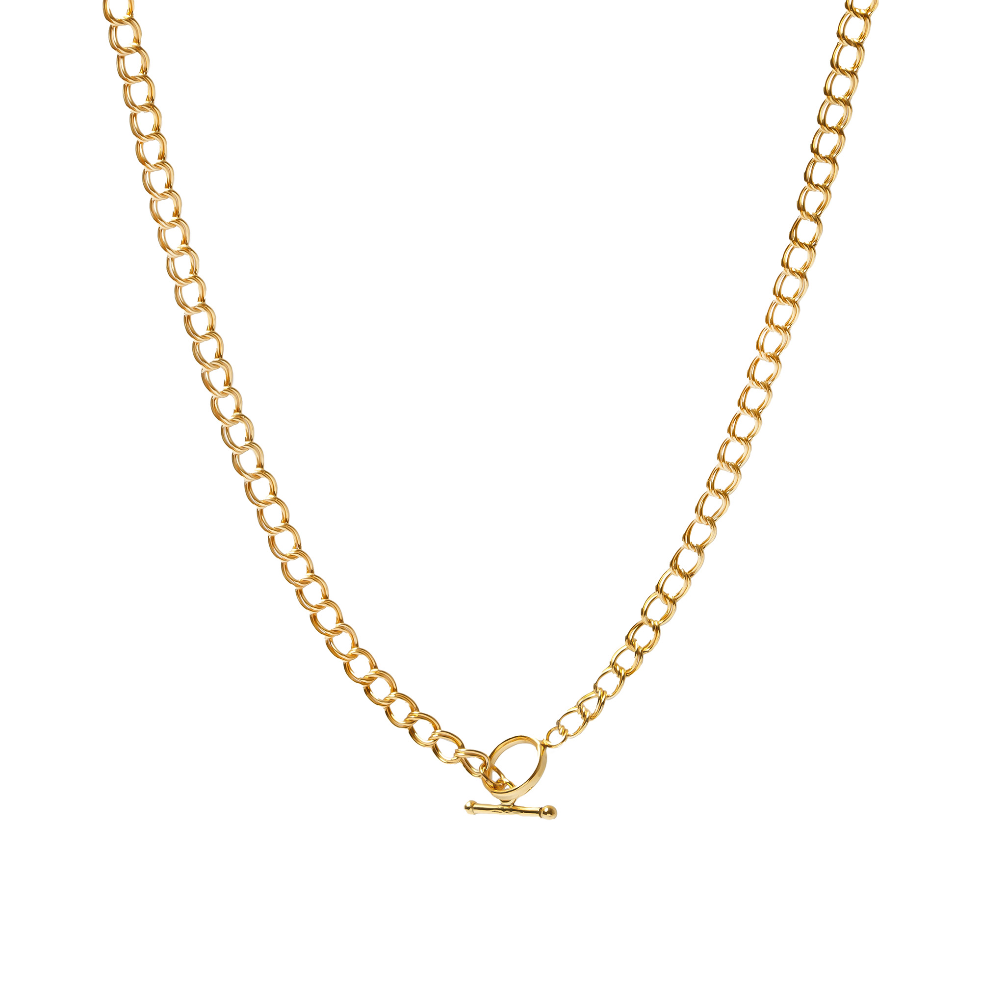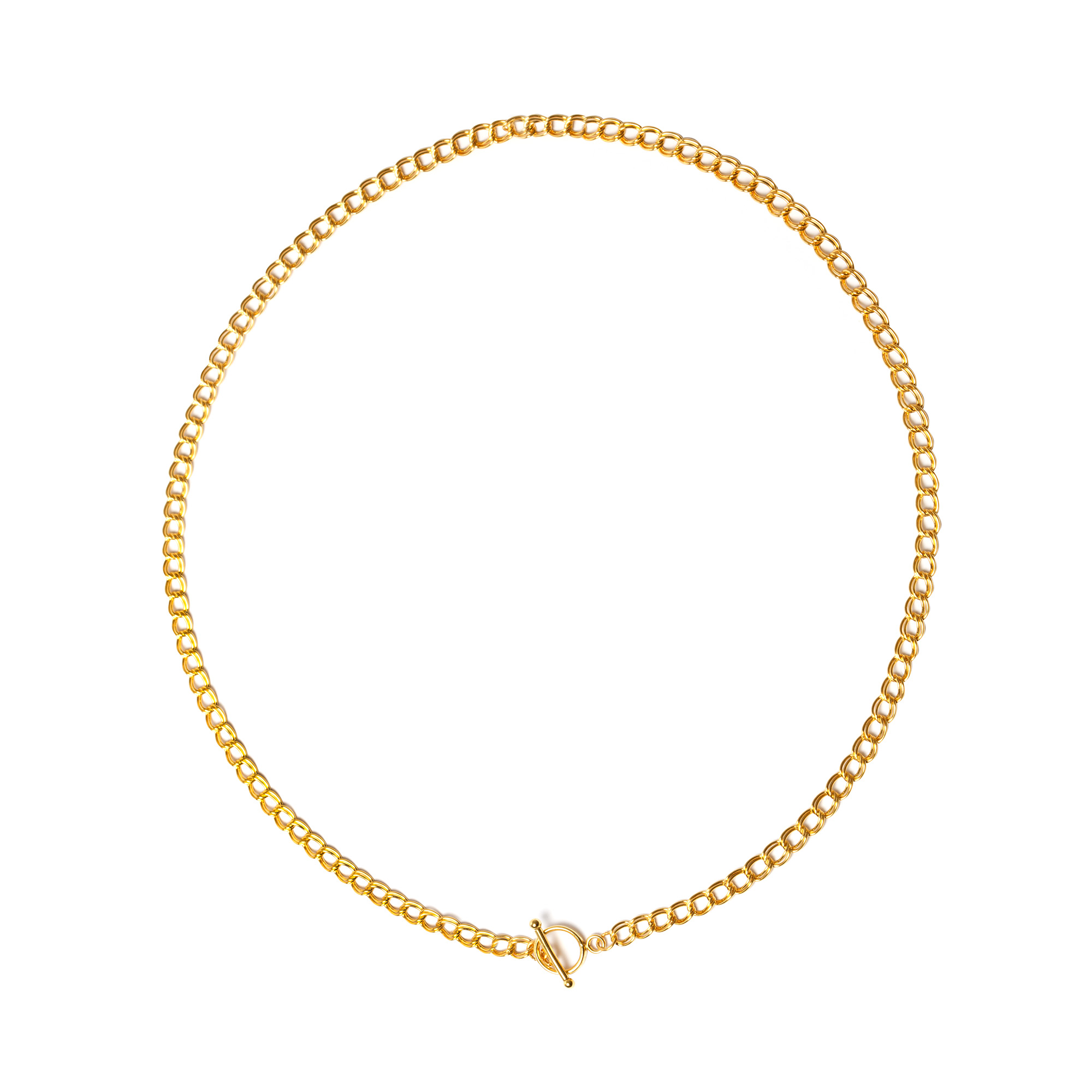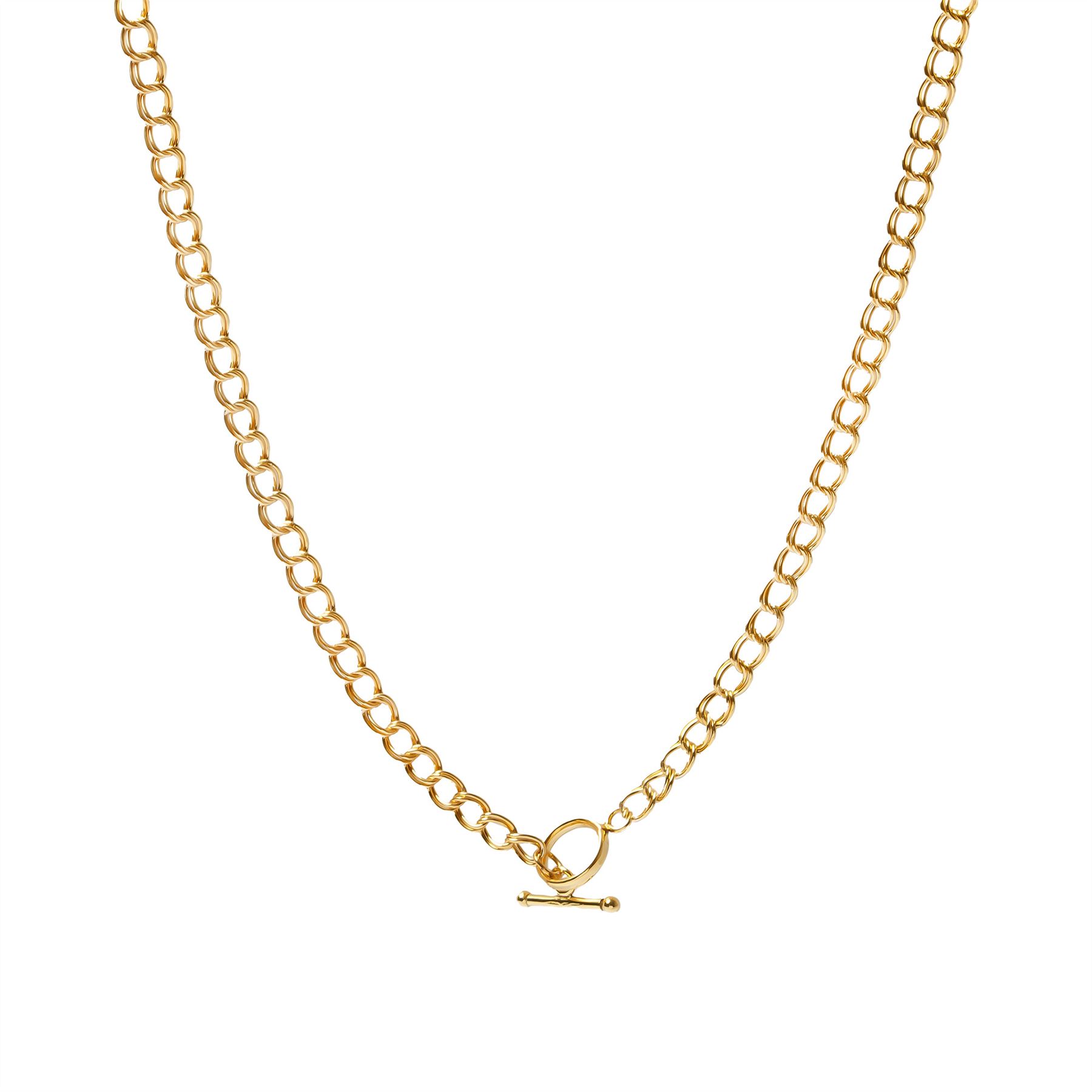 The classic double link design complements any style and occasion. It has a chain thickness of 4.5mm, while the T-bar clasp, featuring a 9.5mm ring diameter, ensures easy wearing and removal.