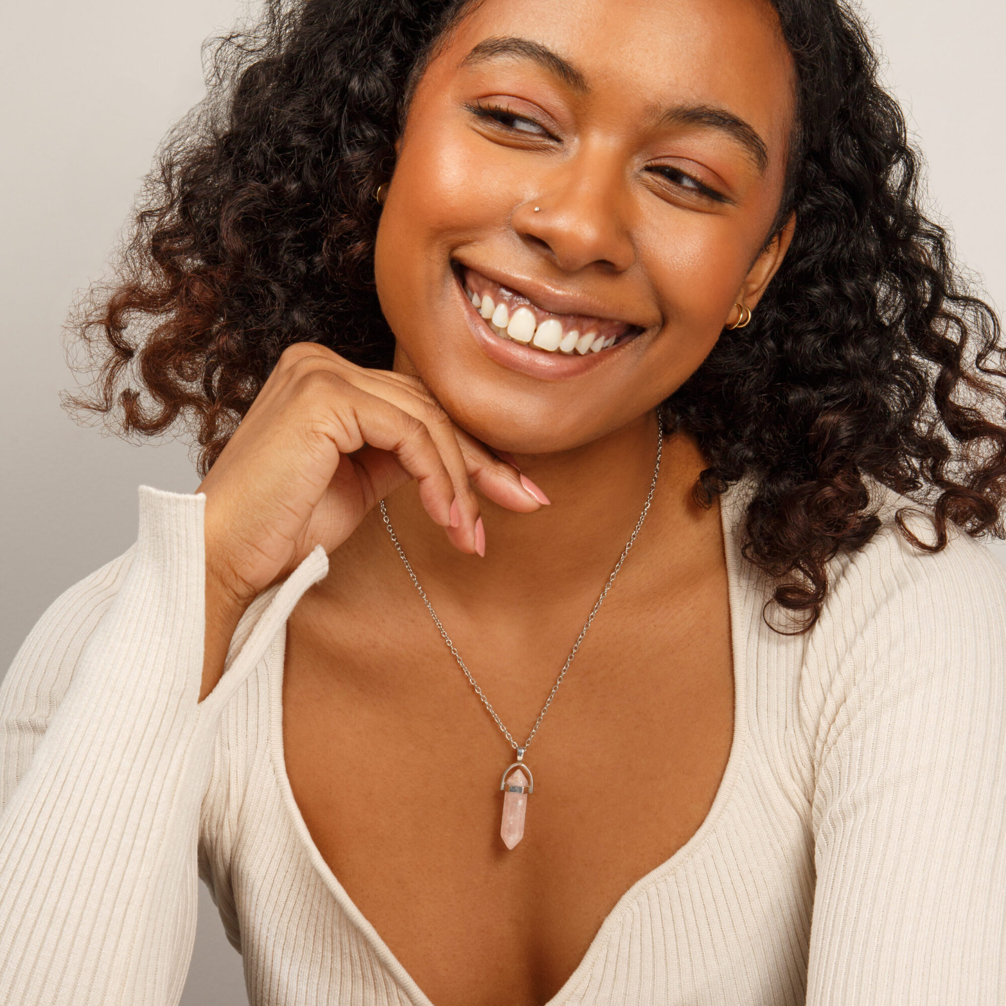 The Rose Quartz crystal drop charm necklace is a beautiful and emotionally meaningful piece of jewellery that combines elegance with the gentle and soothing energy of the rose quartz gemstone. This necklace features a graceful rose quartz crystal drop suspended from a delicate chain. The rose quartz crystal with its soft rosy pink color radiates a sense of love and emotional healing – making it the heart of the necklace.