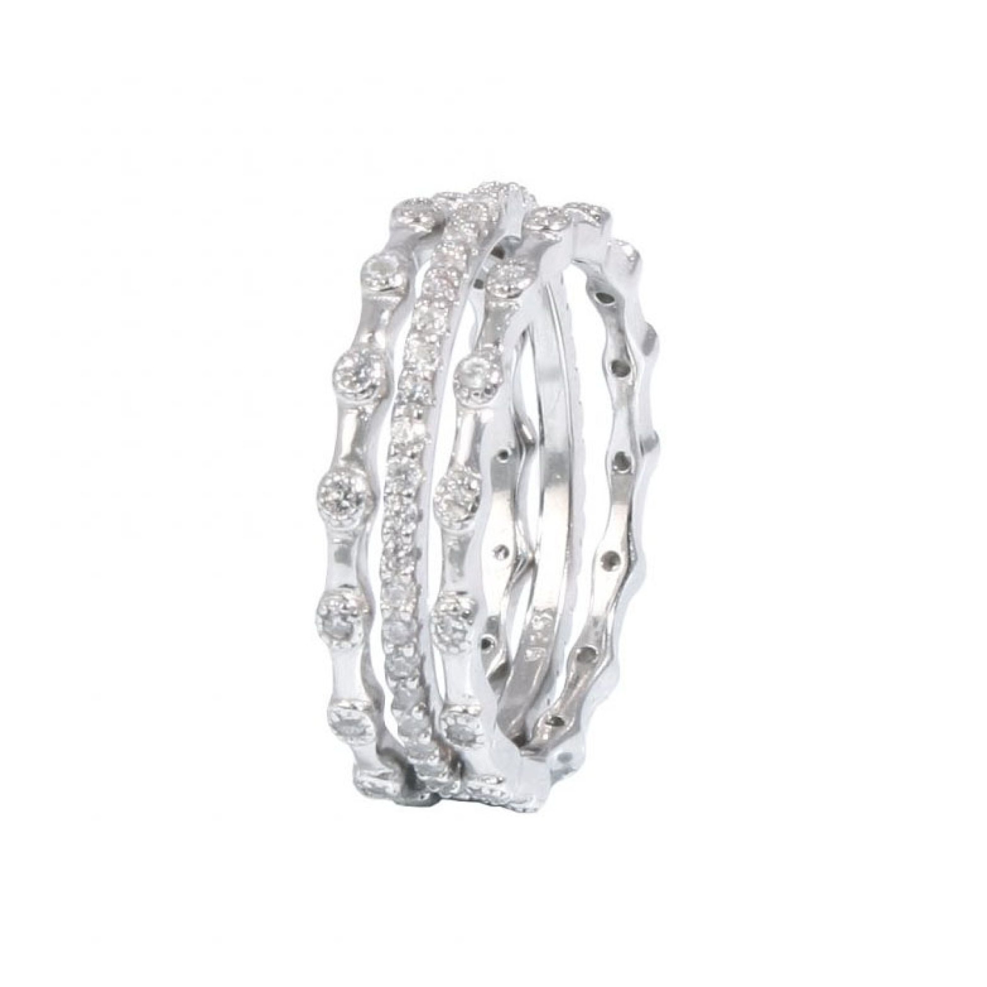 The mix of finishes makes this set stand out. One band features a neat row of cubic zirconia for clean sparkle. The others add extra texture and light with polished silver and stone-set accents. Worn together, they create a balanced look that feels modern, feminine, and easy to wear.