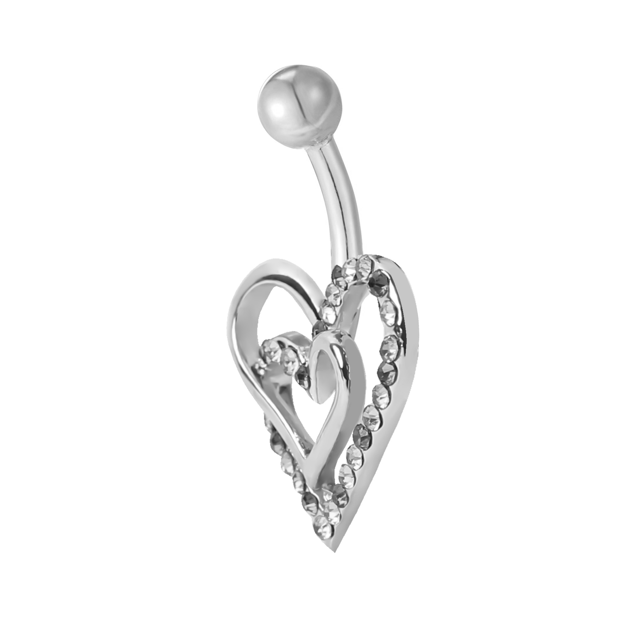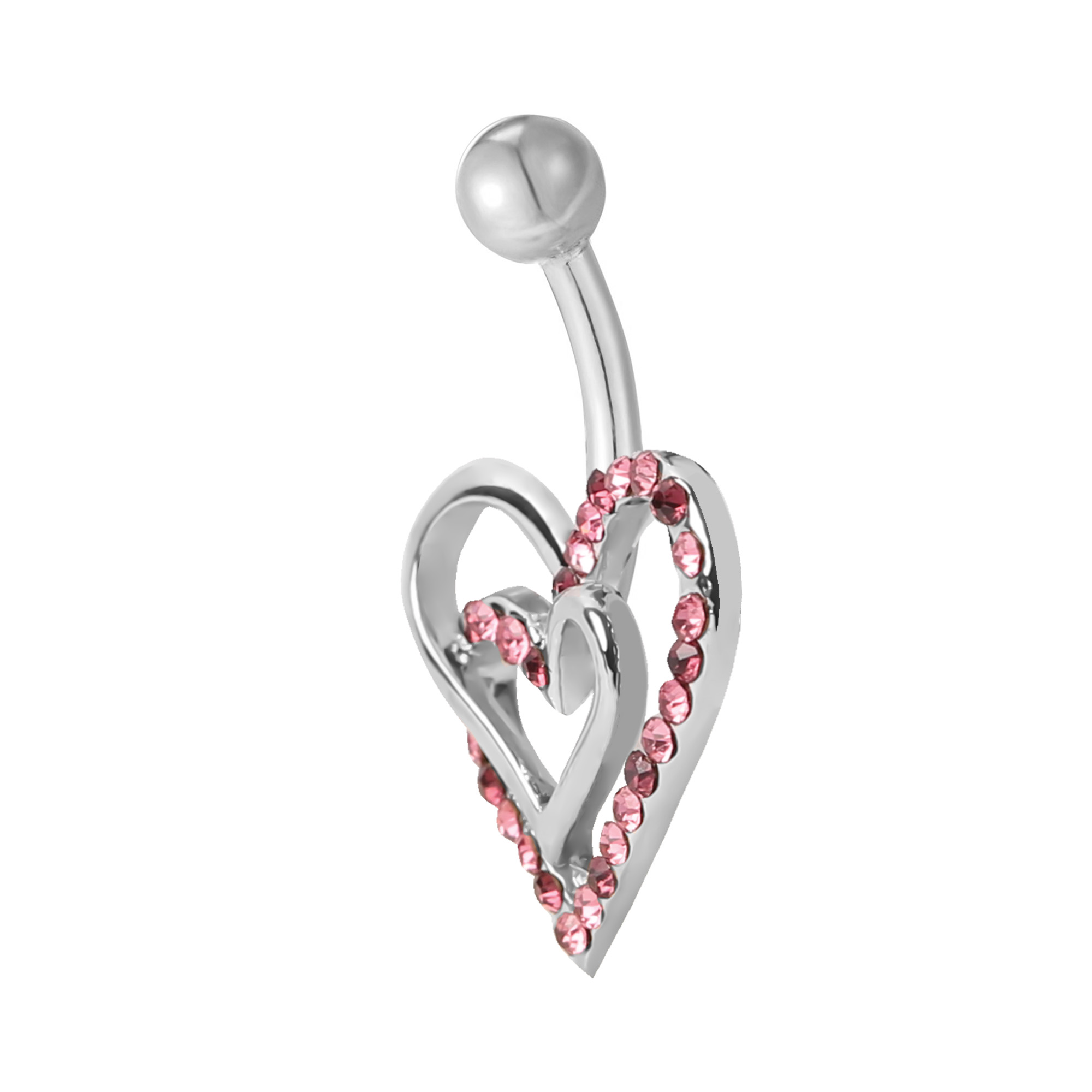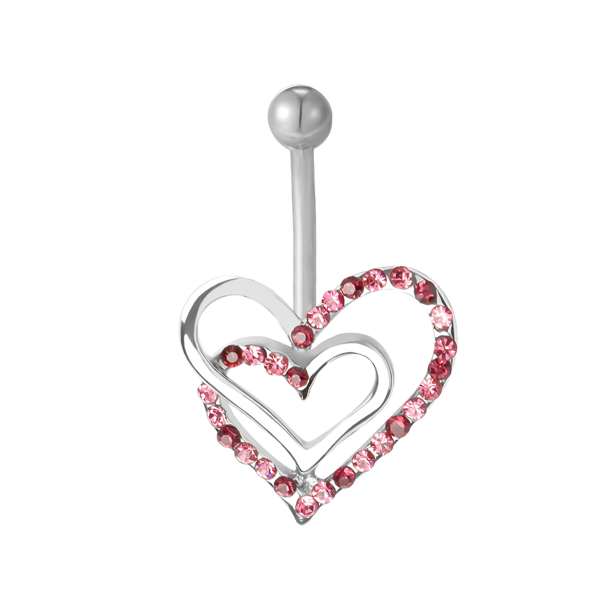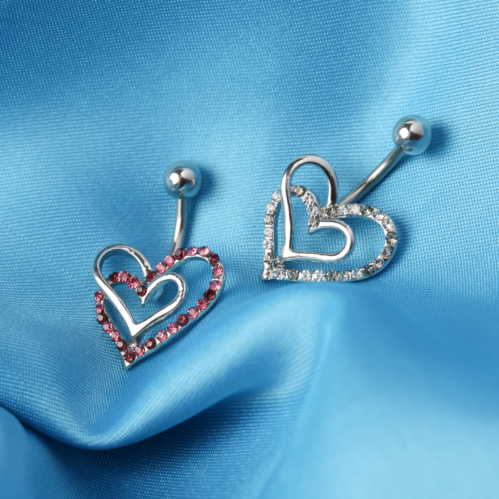This set of 2 double heart pavé CZ steel belly bars is a package of two body jewellery pieces that are designed to be worn in a navel or belly button piercing. Each belly bar features a double heart design one with pavé-set clear CZ stones and the other with pink CZ stones. They are designed to be comfortable for daily wear.