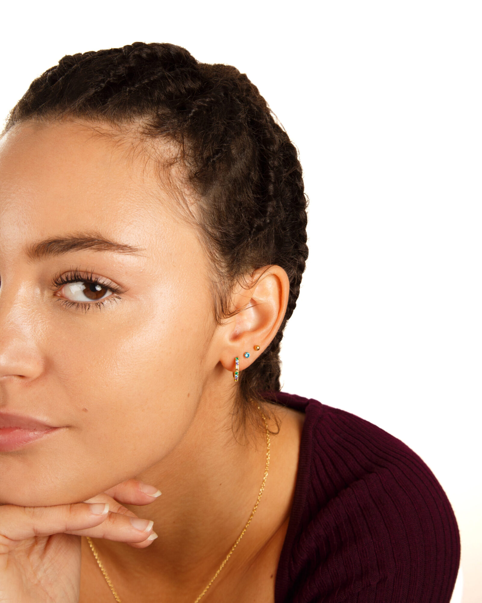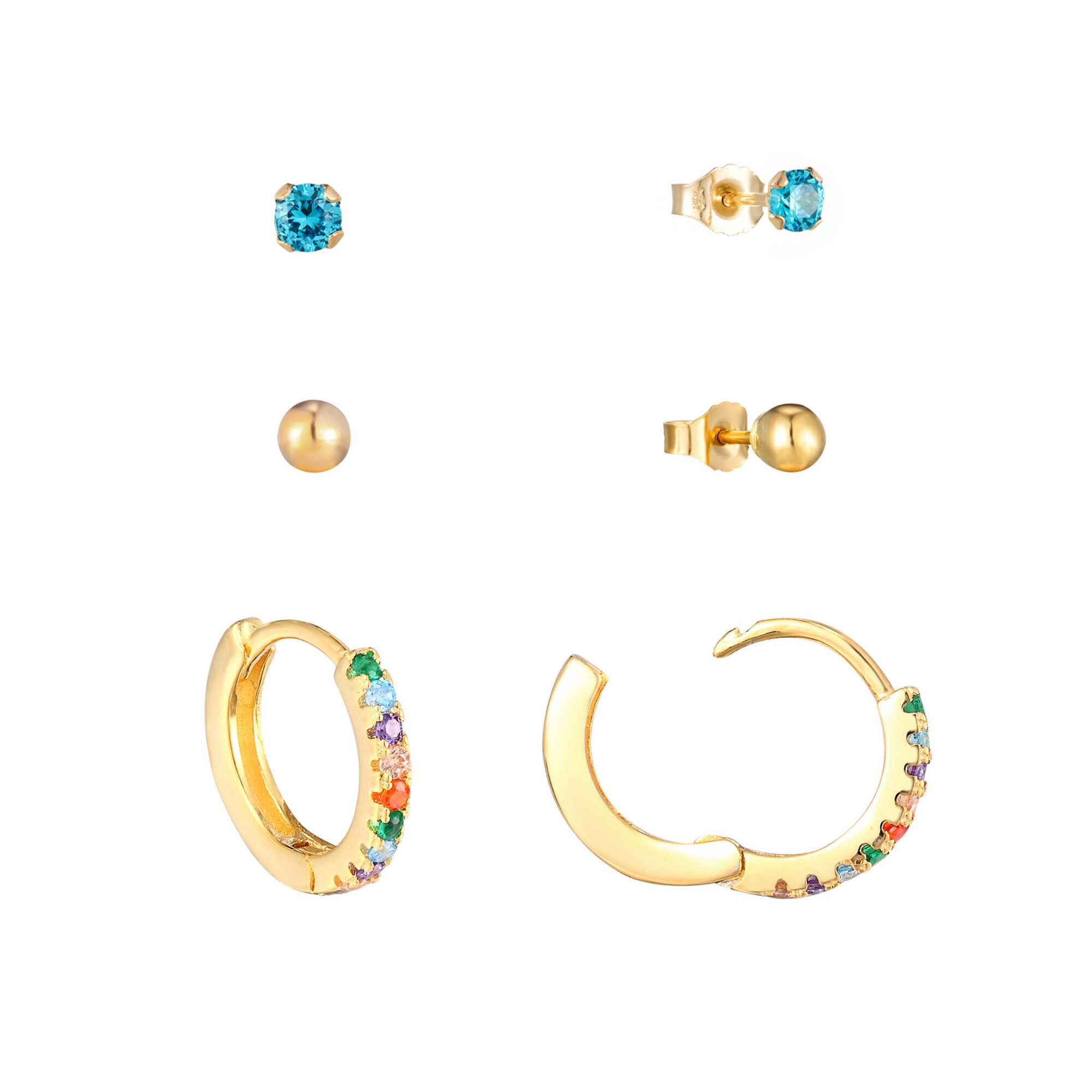 Introducing our Set of Three 18ct Gold Plated Sterling Silver Multi CZ Huggie Hoops & Studs, a dazzling collection designed to infuse your style with a burst of sparkle and color. Meticulously crafted, this set includes a pair of huggie hoops and two stud earrings, adorned with an array of vibrant CZ stones and plated in 18ct gold. Their petite size offers a subtle touch of luxury, perfect for stacking or wearing individually. Elevate your look with these versatile and enchanting earrings, a testament to refined simplicity with a dynamic pop of colour.