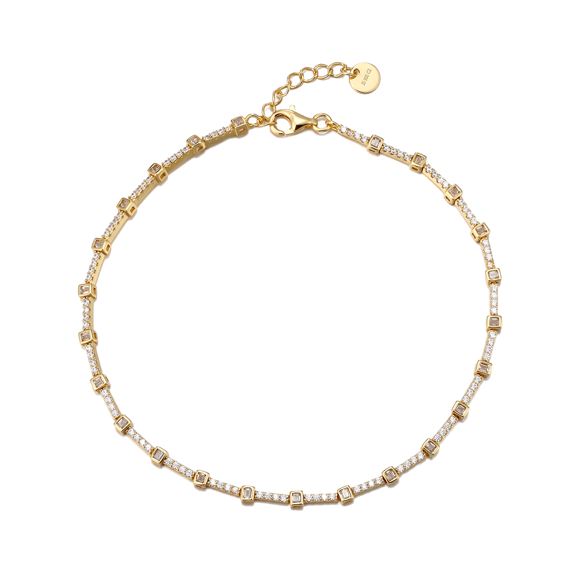 Add an elegant sparkle to your jewellery collection with this beautifully crafted anklet. Dazzling with white cz crystals, this is a stunning statement piece. The perfect gift for a loved one. Available in 18ct gold plated, 18ct rose gold plated, and 925 sterling silver. Comes with 1 inch extender chain.