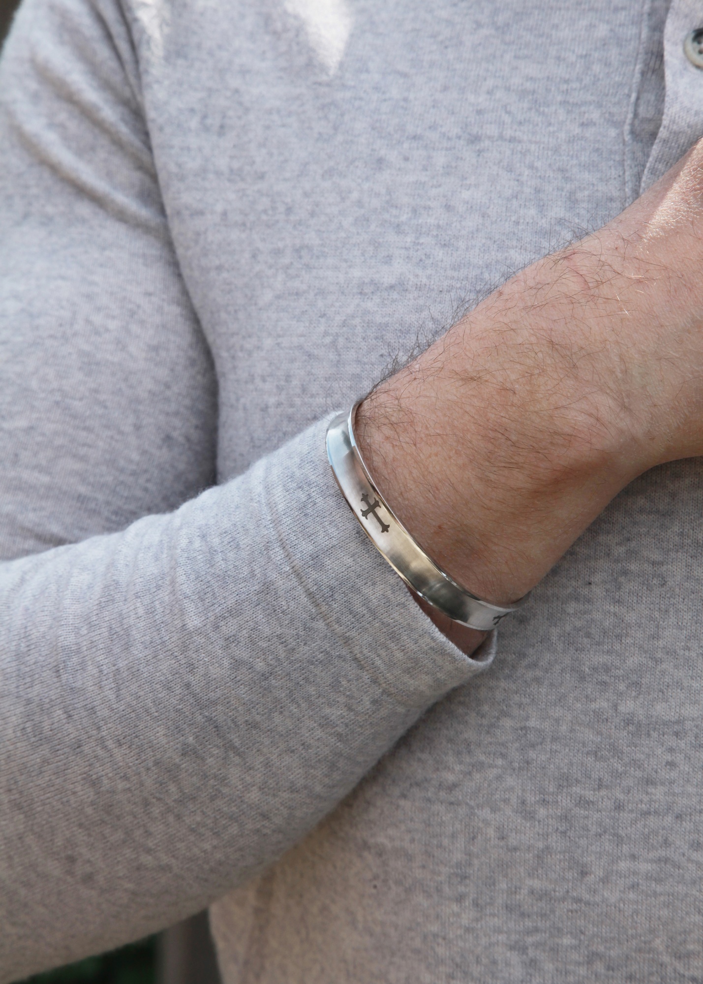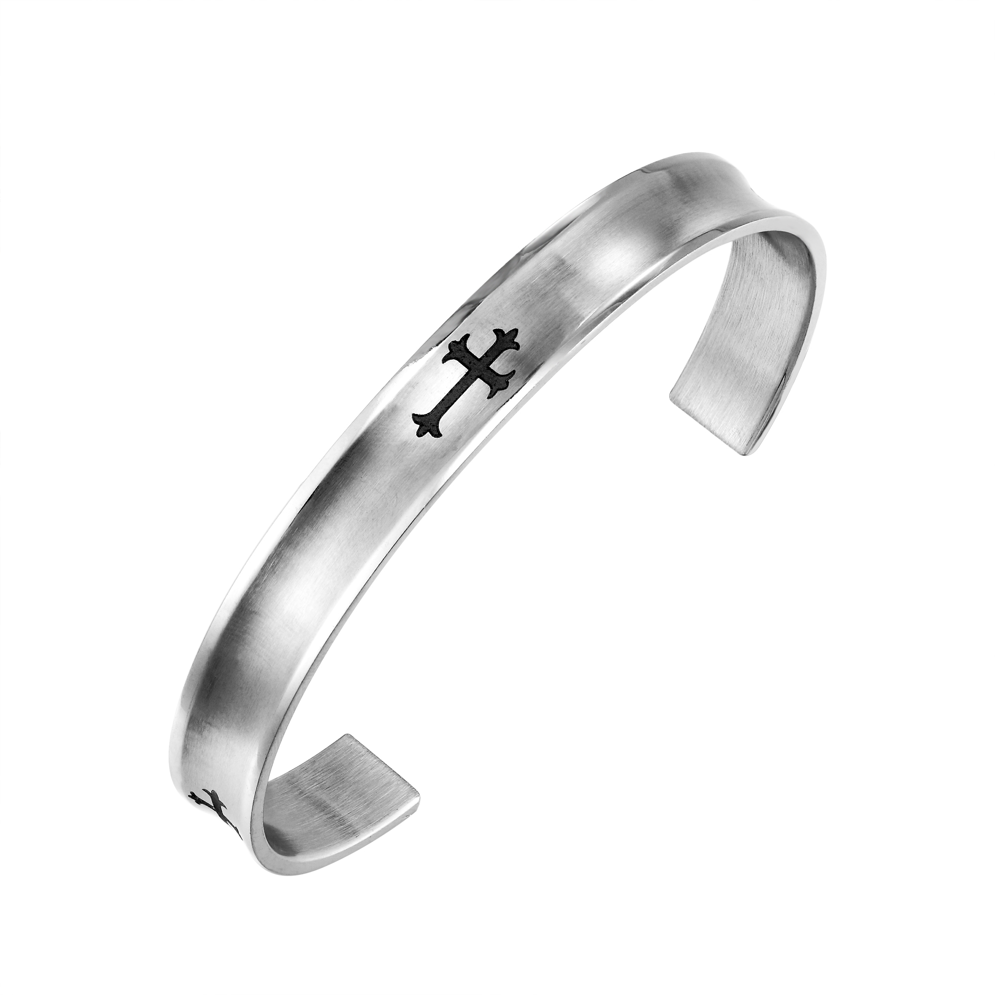 Urban stainless steel clip over bangle with etched in cross design.
