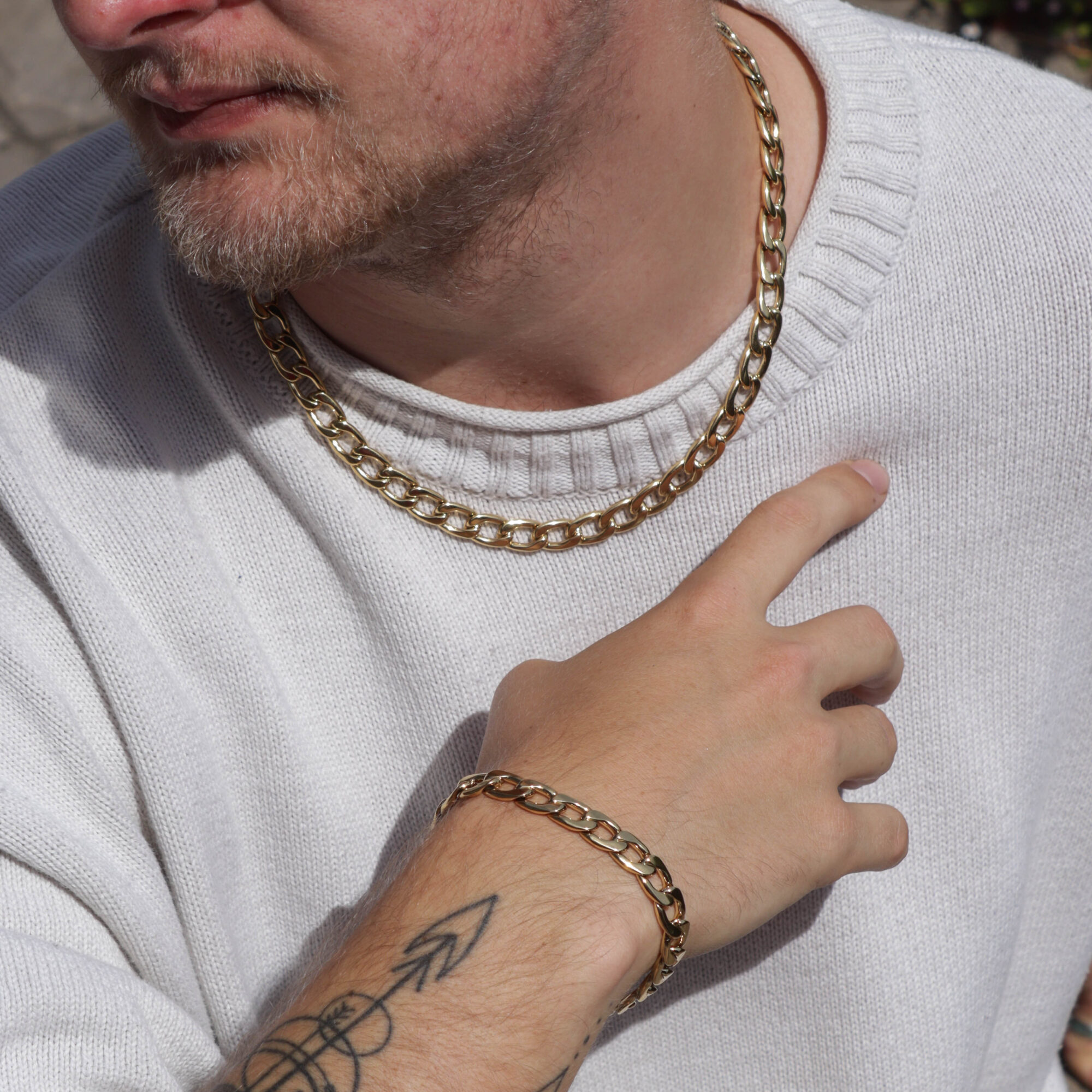 Stainless steel chunky curb chain, available in steel finish or PVD gold plated.