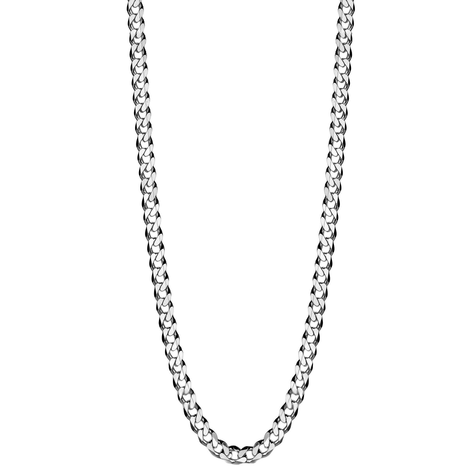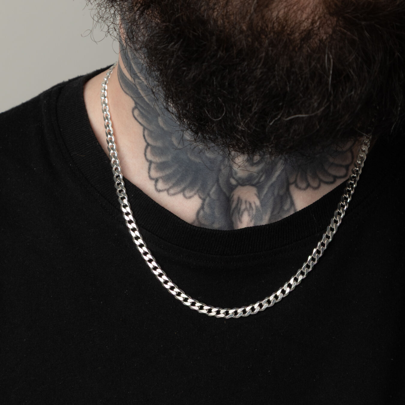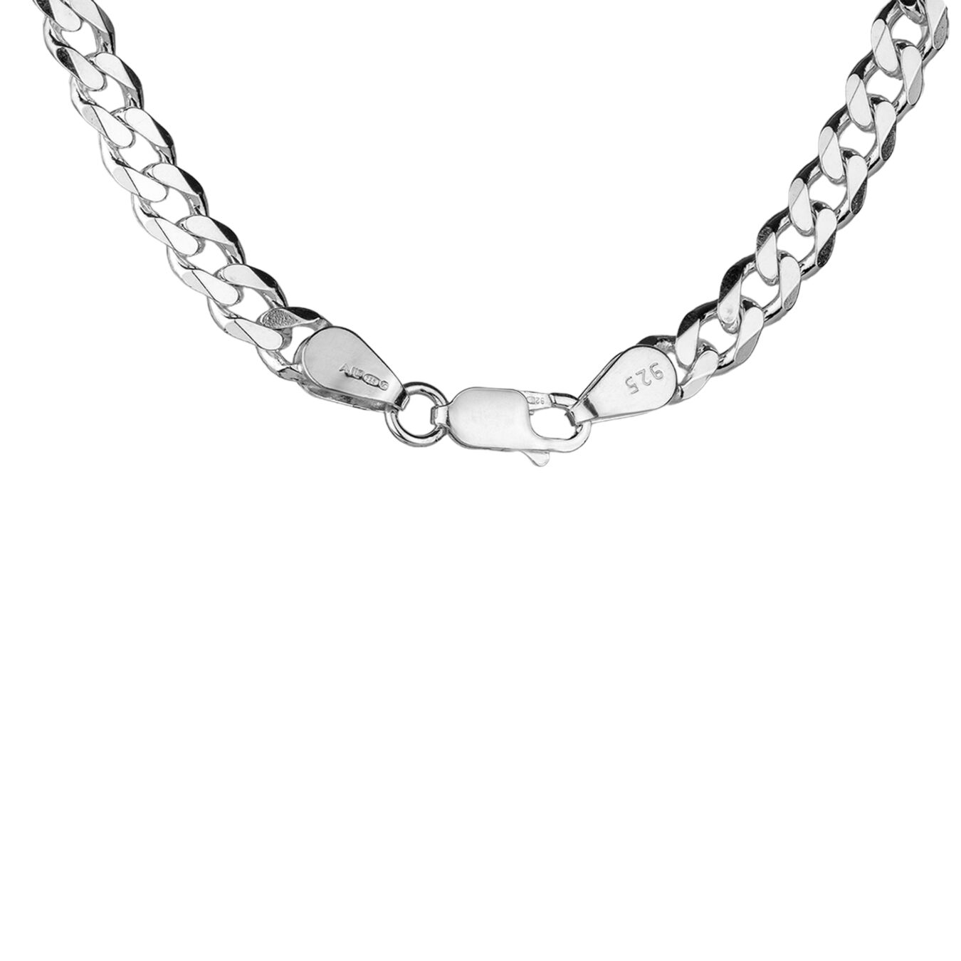 The curb link design gives the necklace a bold but wearable character. Each link sits neatly in place, so the chain has a smooth and structured appearance around the neck. As a result, it creates a confident look without feeling too heavy or overstyled. The polished finish also helps reflect light across the surface, which gives the chain a bright silver shine.