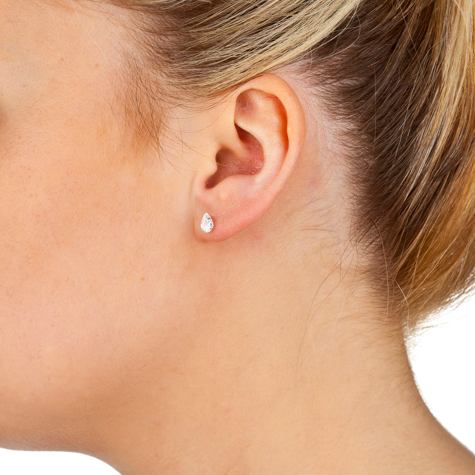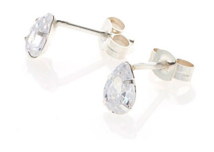 These beautifully classic stud earrings are handmade in the UK from Sterling Silver and they fasten behind the ear with butterflies. Set elegantly in a 4-finger clasp and with a teardrop shape 4x6mm White Cubic Zirconia stone, these earrings sparkle and look fabulous on, bringing a hint of understated glamour to your look. These earrings come in a beautiful presentation box and would make an ideal gift for someone special.