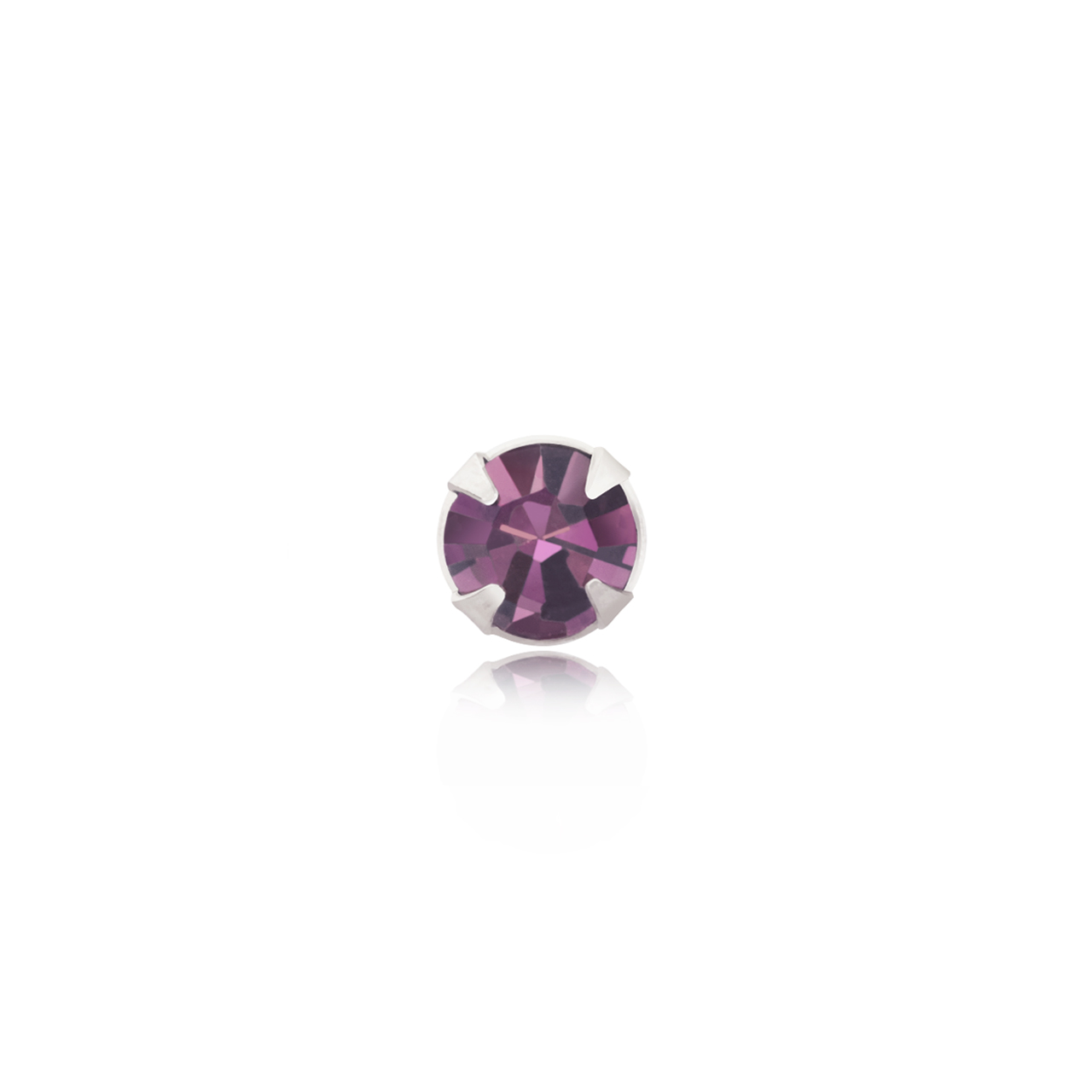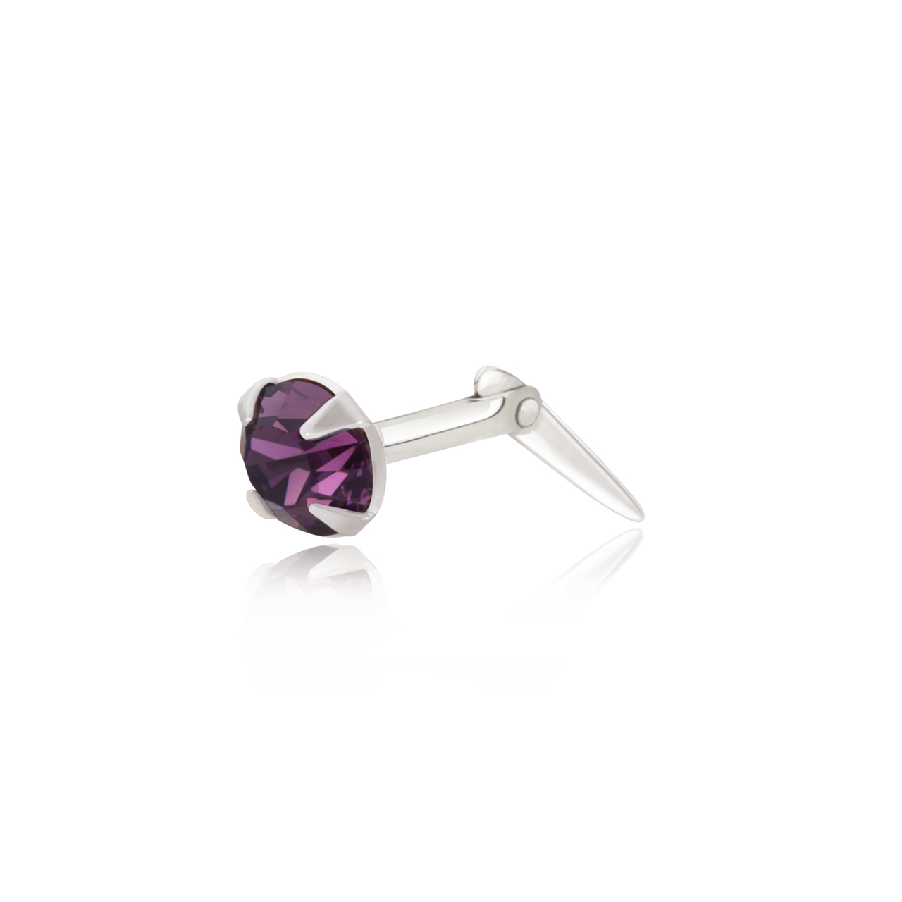 This Andralok 3mm purple crystal nose stud is crafted from solid sterling silver and features a small faceted purple crystal held in a secure claw setting. The 3mm size offers a subtle, refined look that works well for everyday wear.