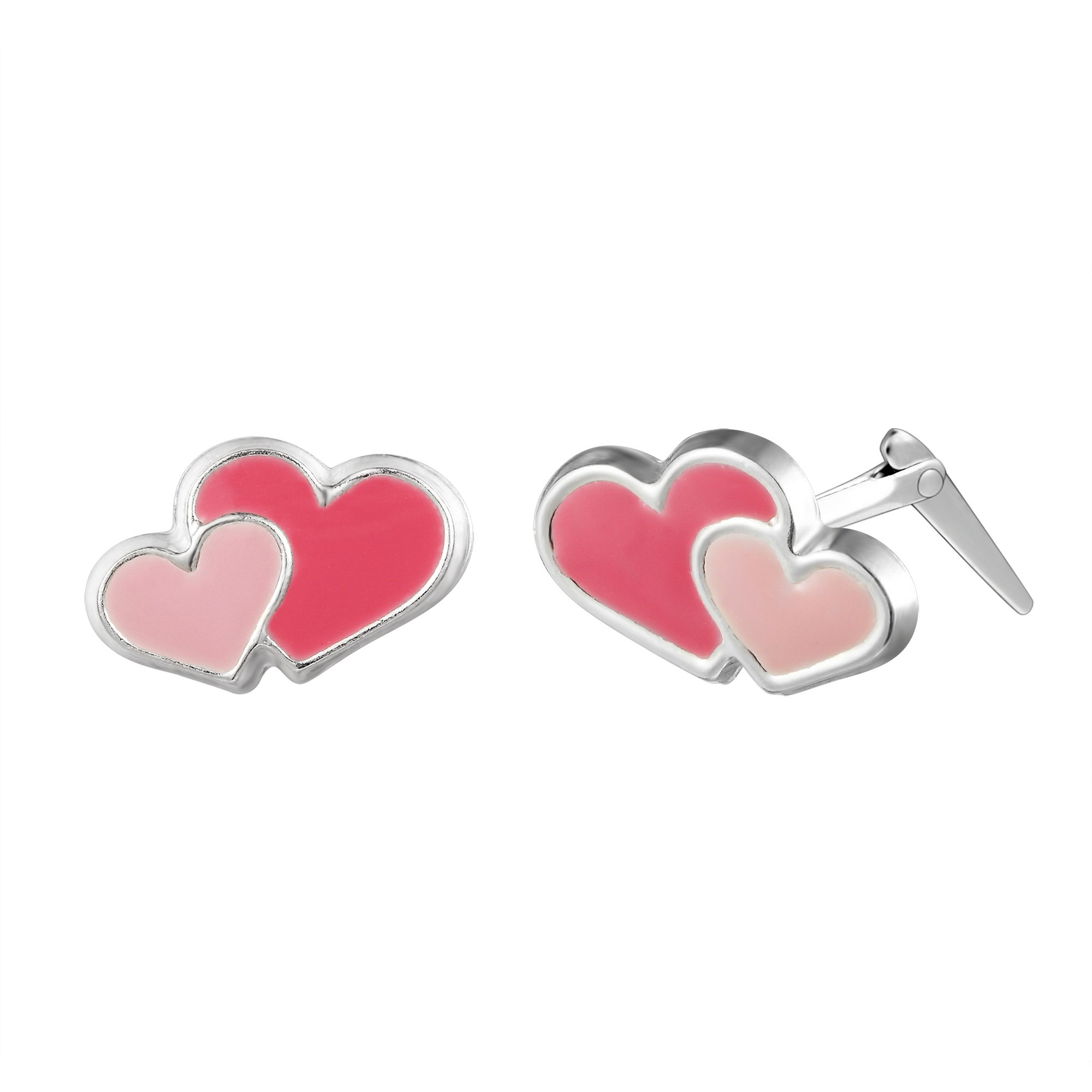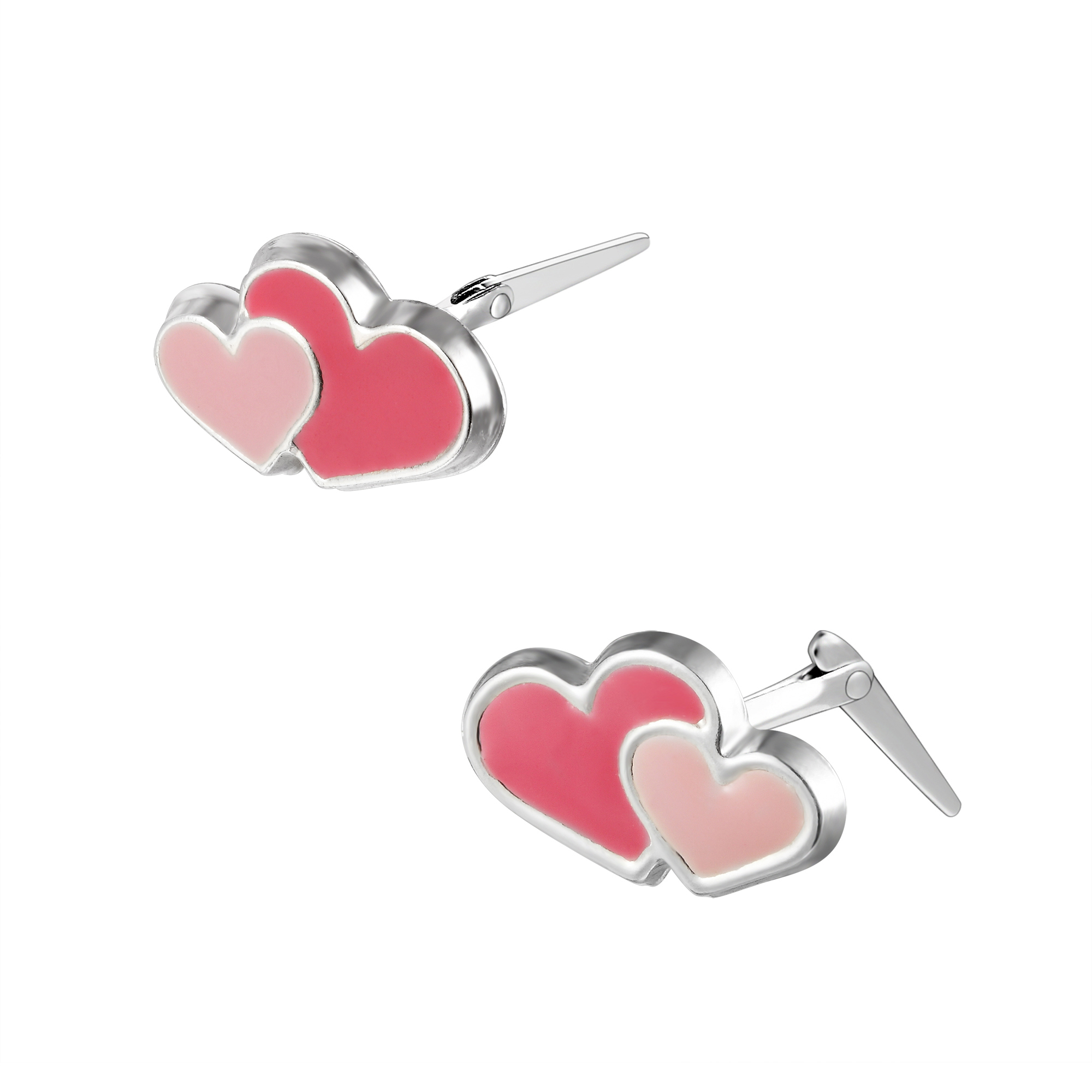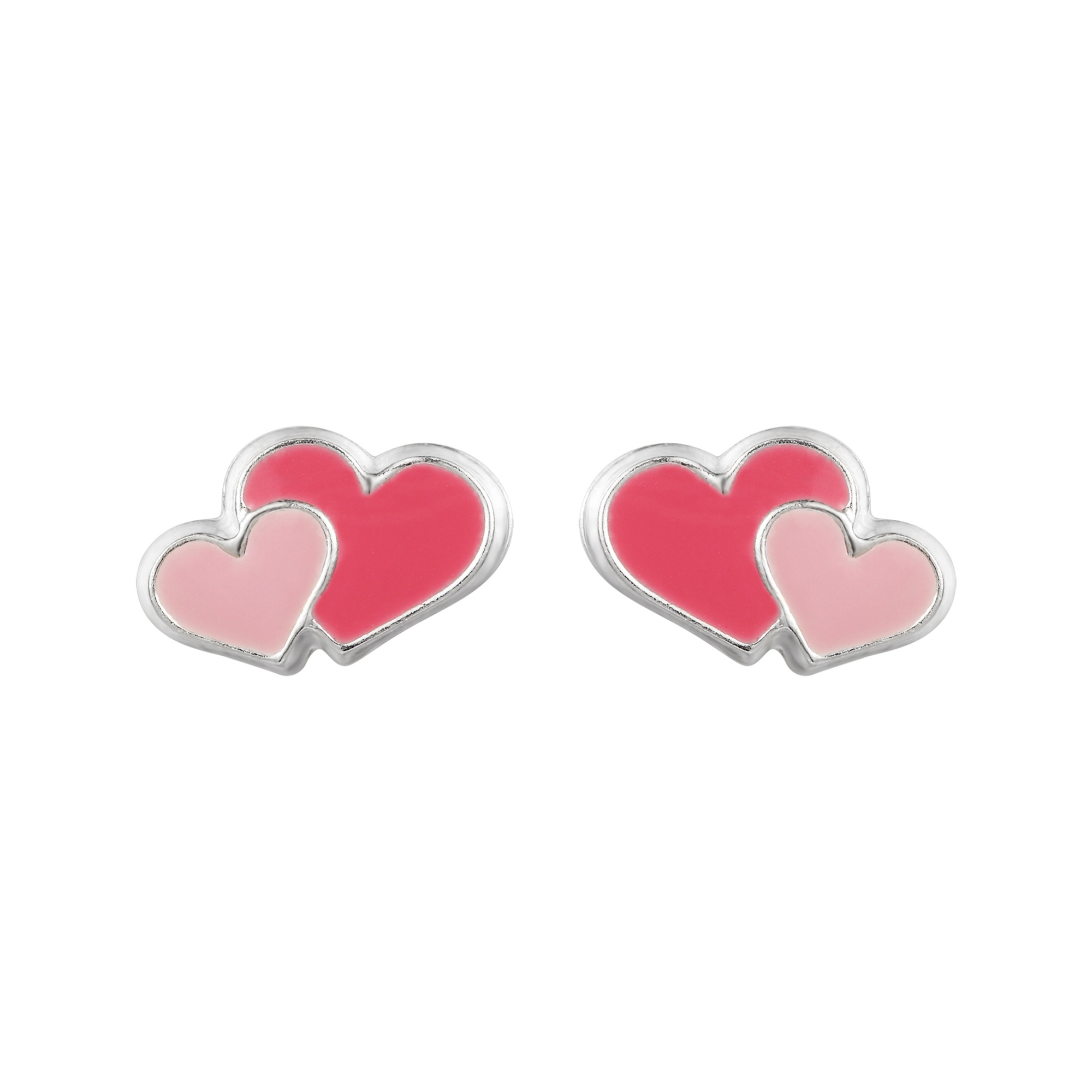 The design features two overlapping hearts in glossy enamel, with a bright red heart paired alongside a softer Light Pink heart. Because the enamel surface is smooth and even, the colour looks bold and intentional. Moreover, the silver outline frames the hearts neatly, so the shape stays crisp on the ear. Therefore, you get a clear heart motif that still feels refined.