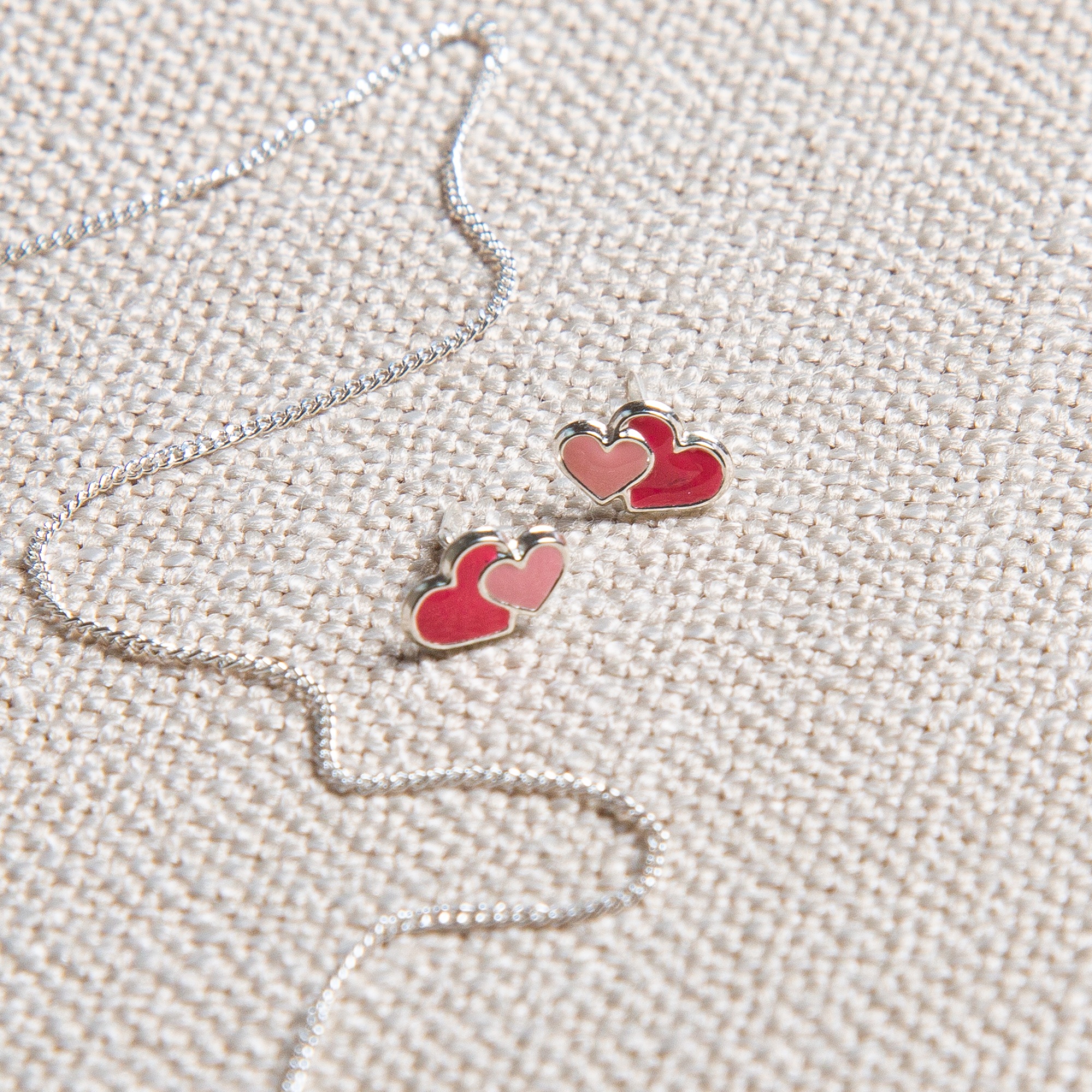 Sterling silver gives the piece a cool, clean base. In addition, it makes the colours pop without looking loud. For everyday styling, silver enamel double heart studs work beautifully with plain silver hoops and simple studs. Alternatively, wear them with a fine chain when you want a small colour accent that still feels coordinated. Either way, the look stays easy and considered.