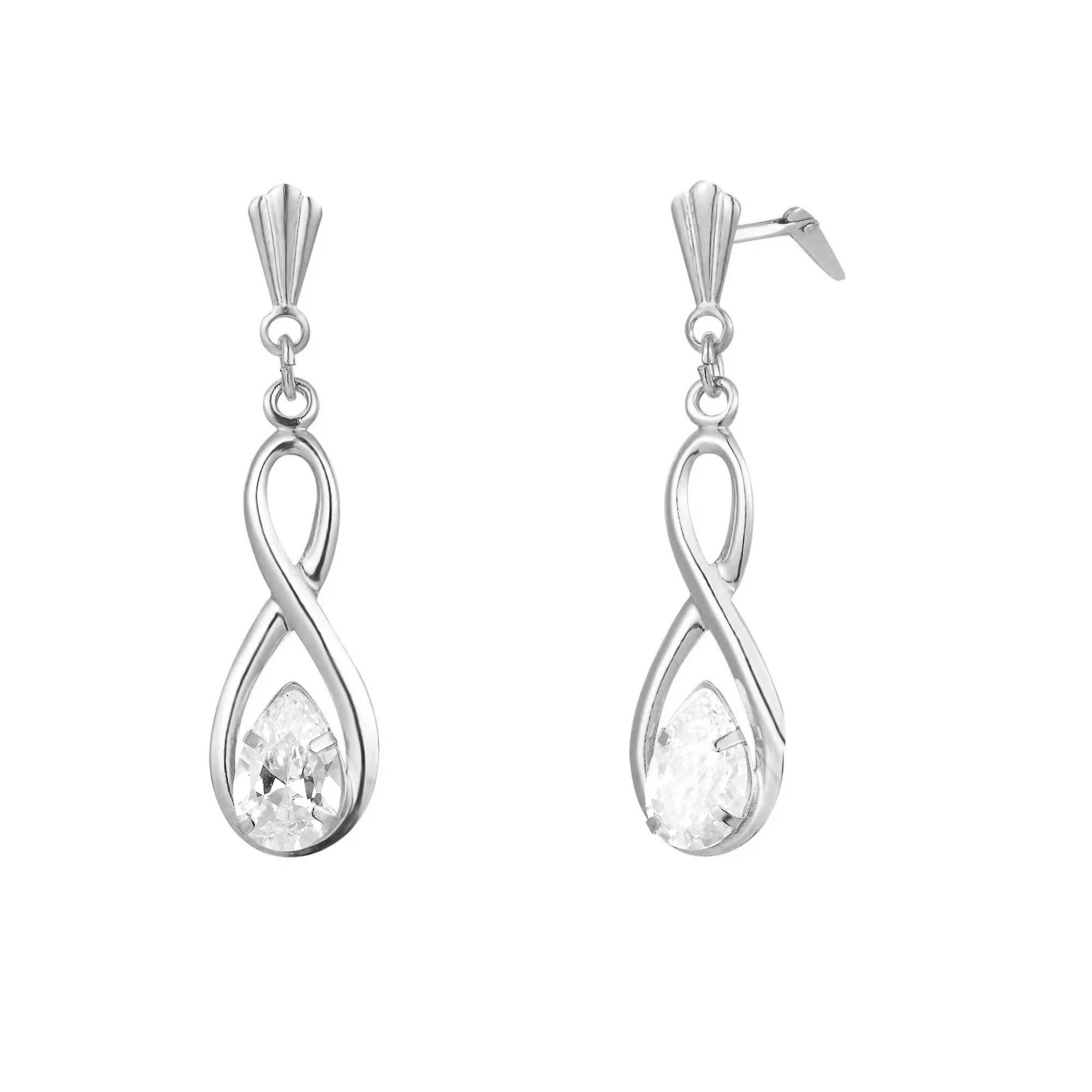 These Andralok infinity crystal drop earrings use the Andralok back fitting as part of their construction. This fitting holds the earrings securely on the ear and provides a stable, balanced feel throughout the day. The earrings sit cleanly without forward tilt.