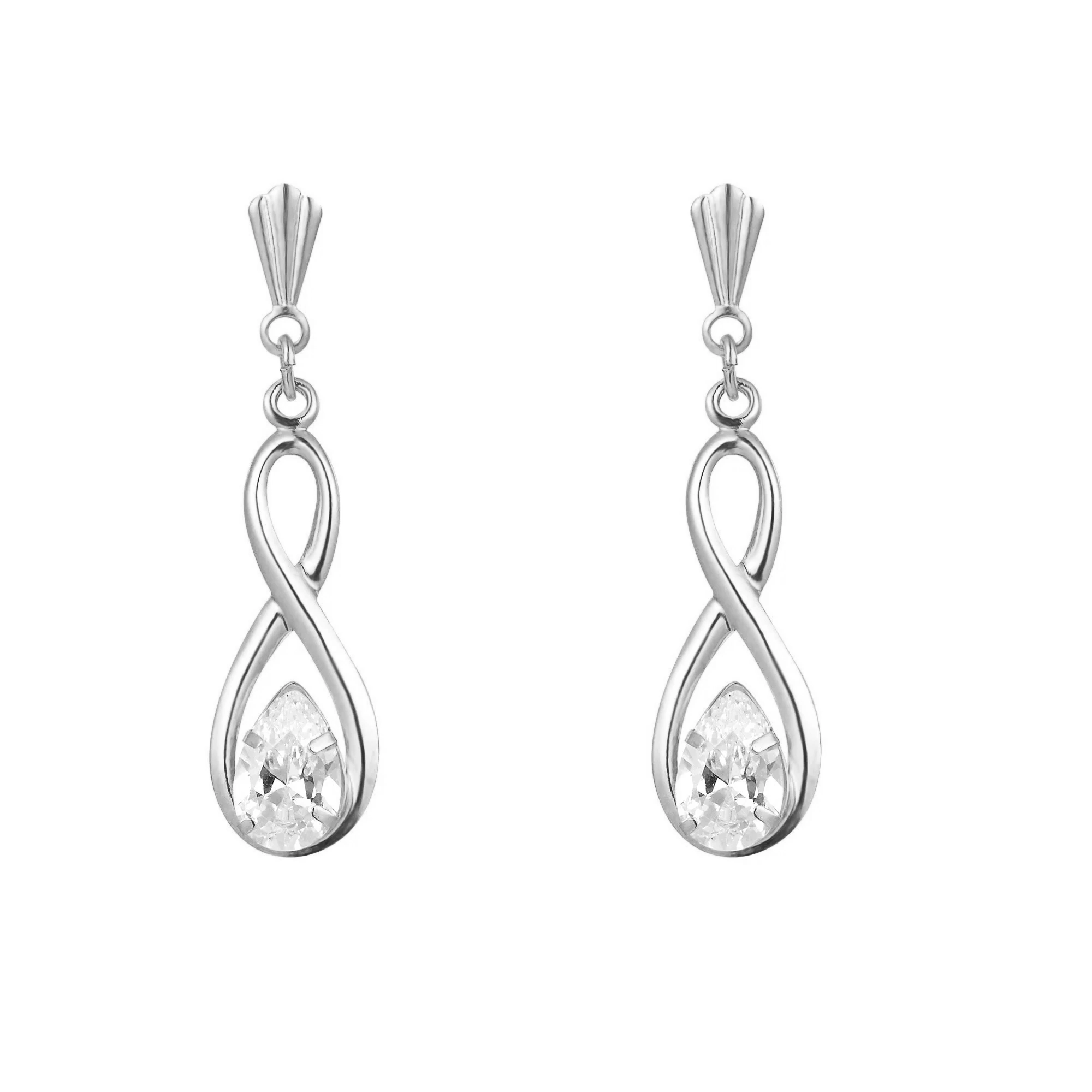 These Andralok infinity crystal drop earrings are crafted from solid 925 sterling silver and shaped into a defined infinity drop. Each earring holds a clear faceted crystal set within the lower curve, creating contrast within a single sculpted form.