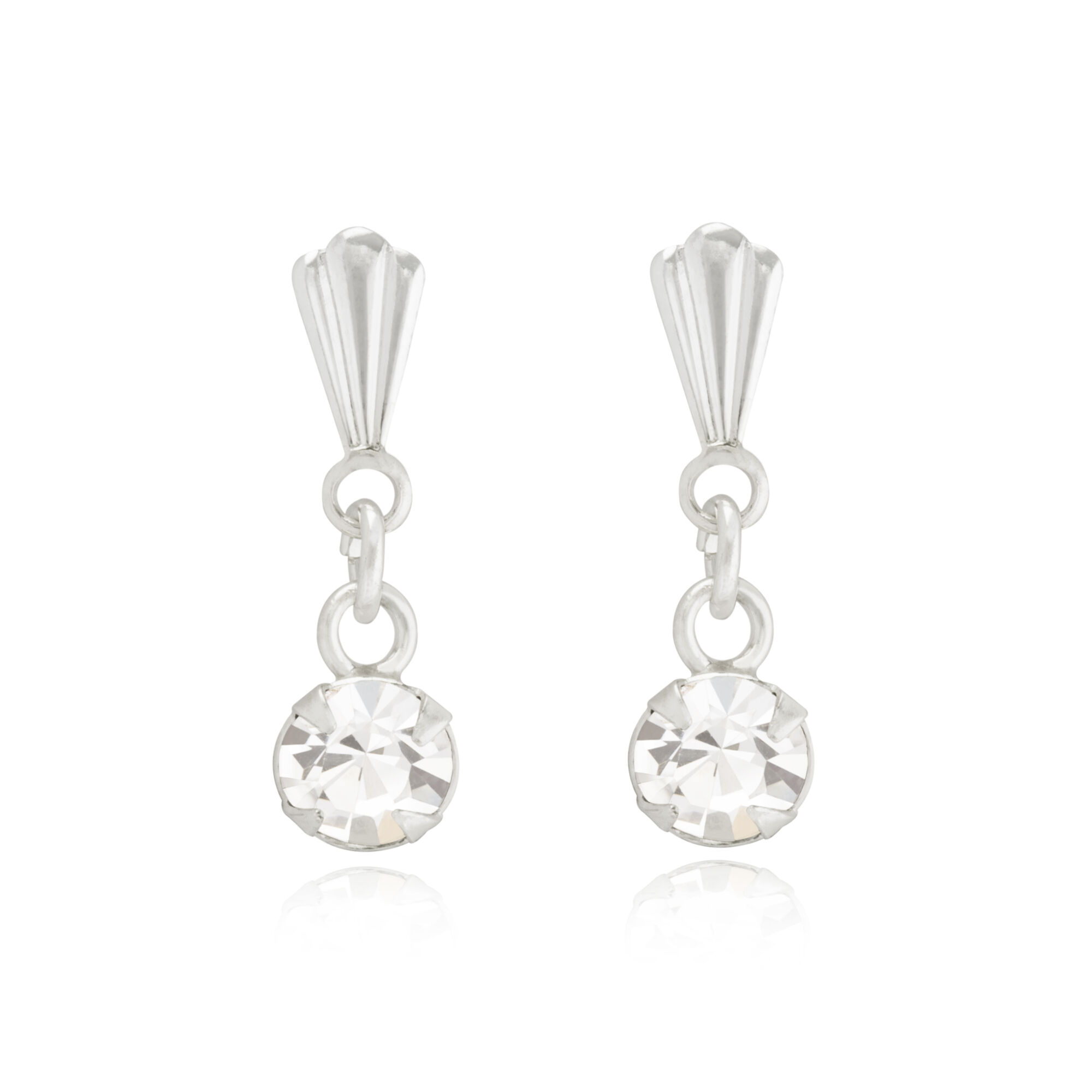 These Andralok round crystal drop earrings are crafted from solid 925 sterling silver and formed into a compact drop design. Each earring features a round clear faceted crystal suspended beneath the fitting, creating light reflection within a controlled profile.
