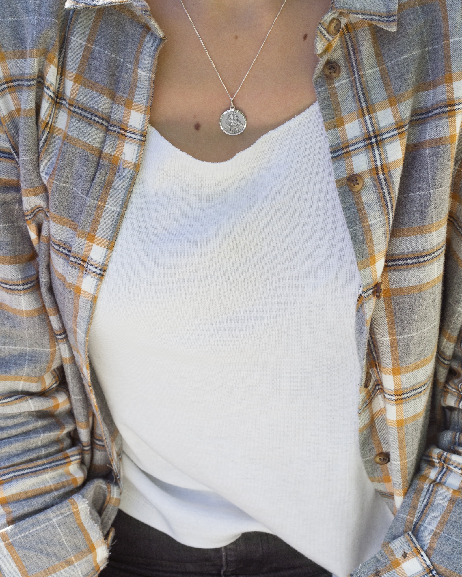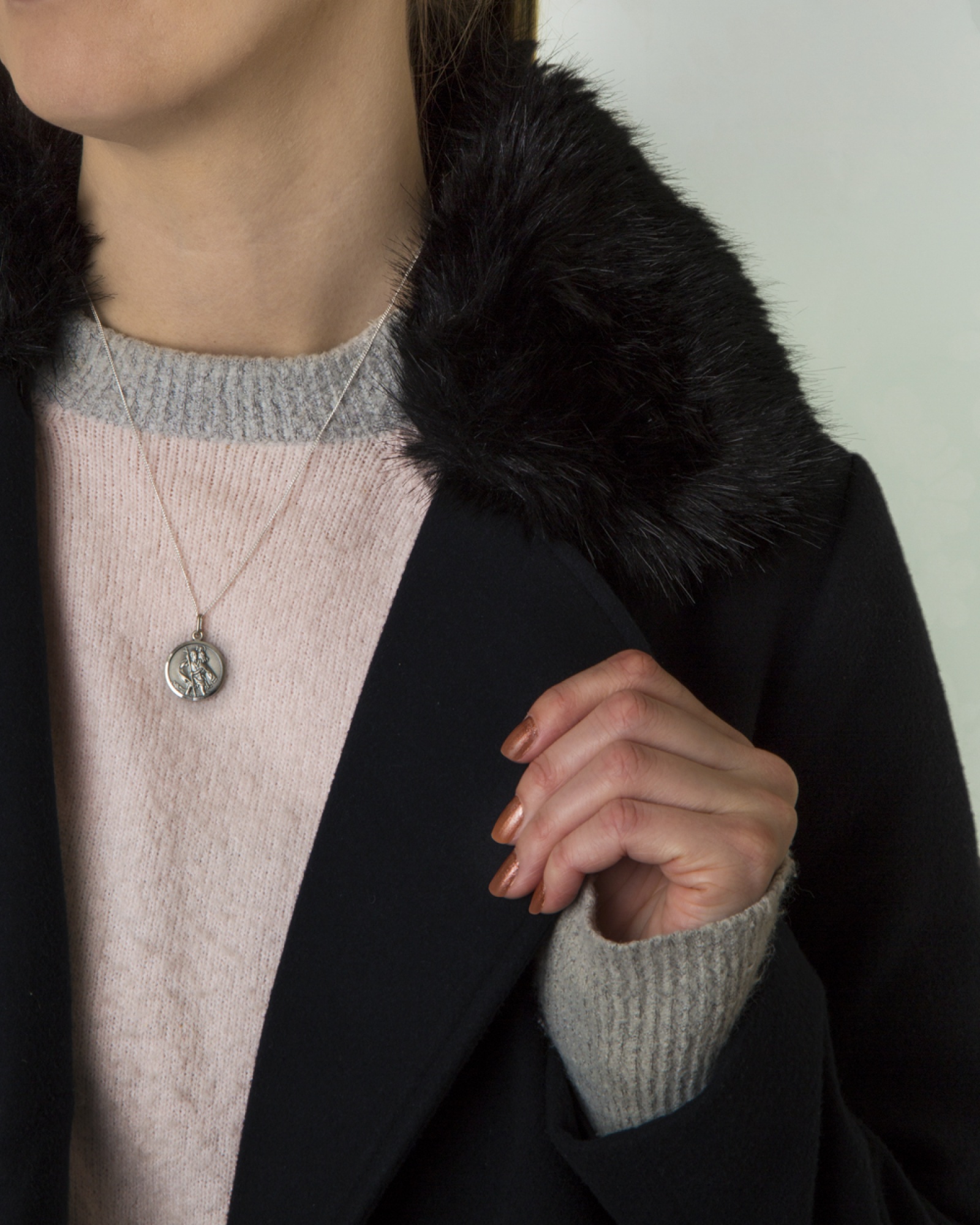 Sterling silver antiqued finish round St Christopher pendant. A sterling silver (.925) product.