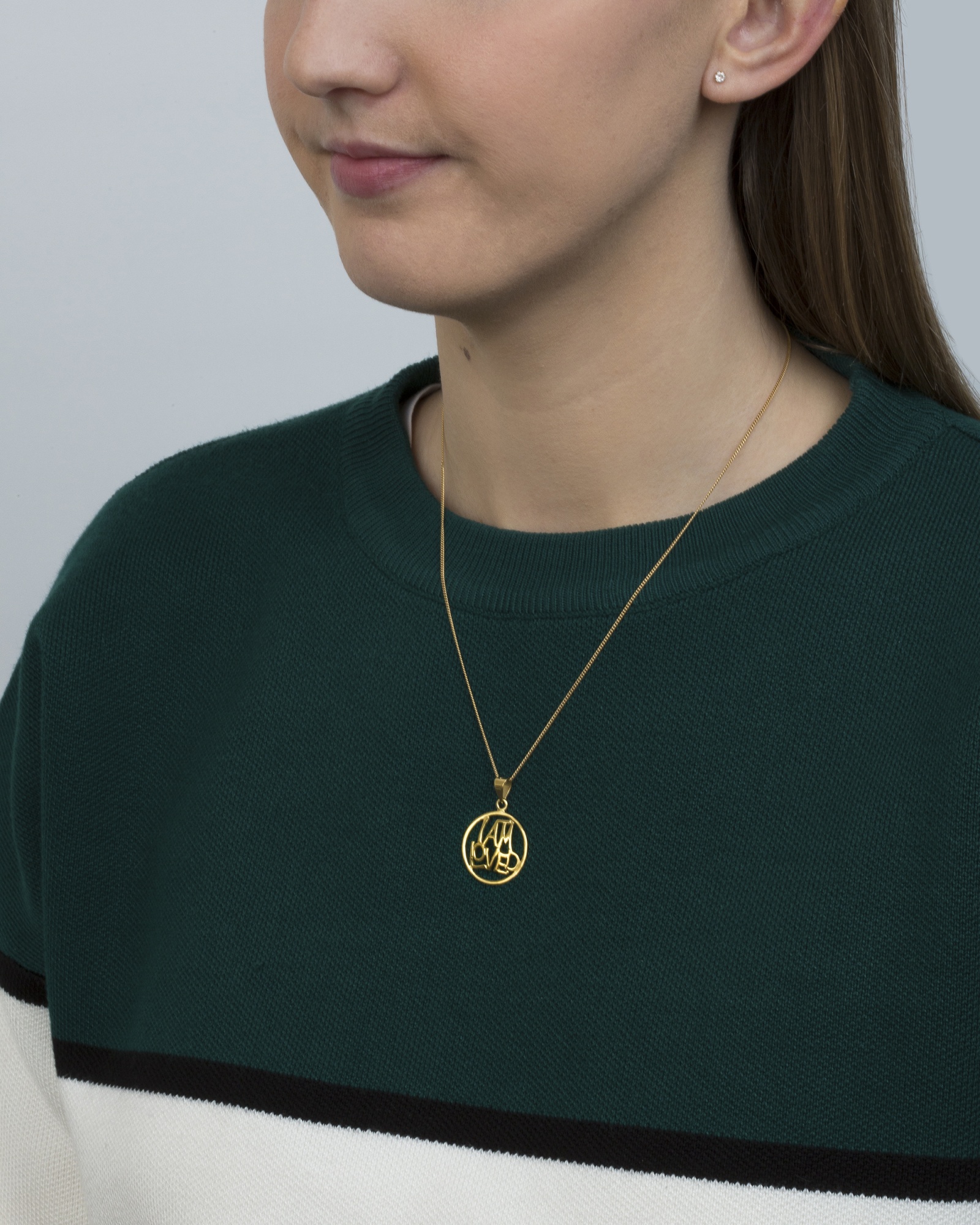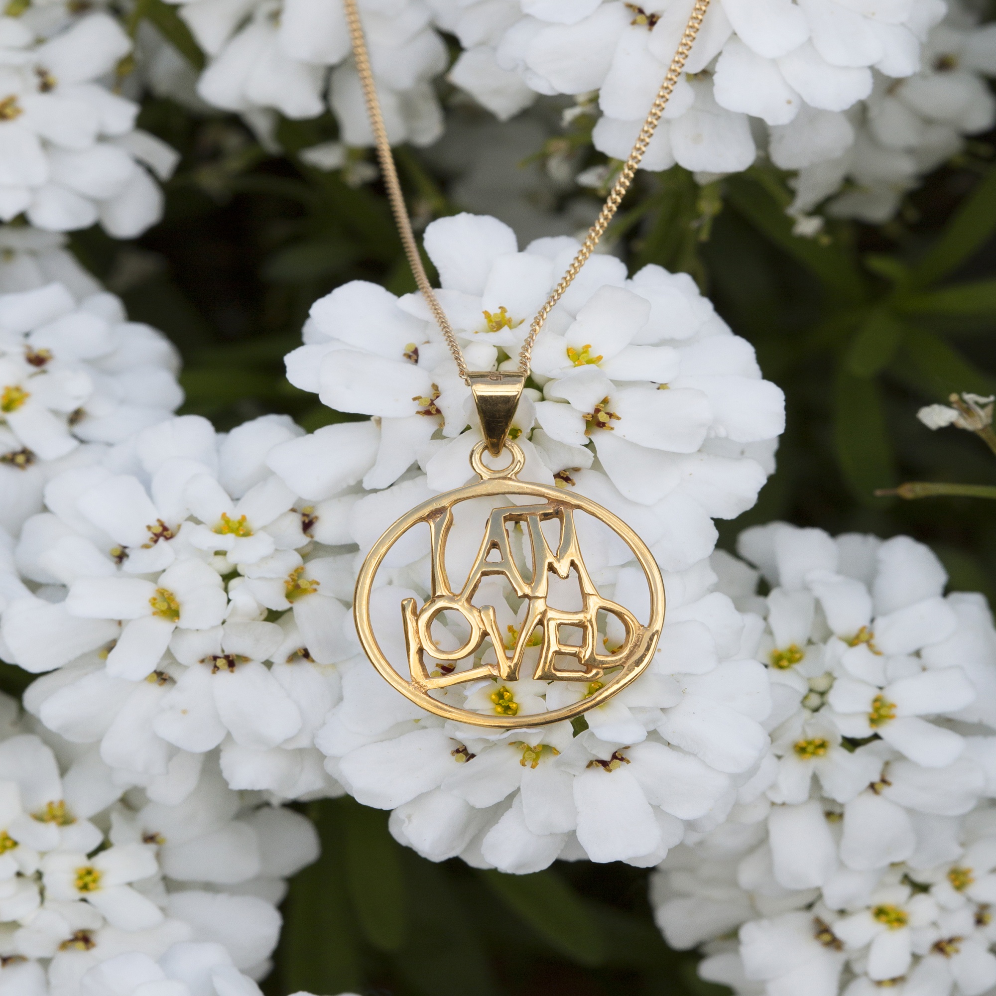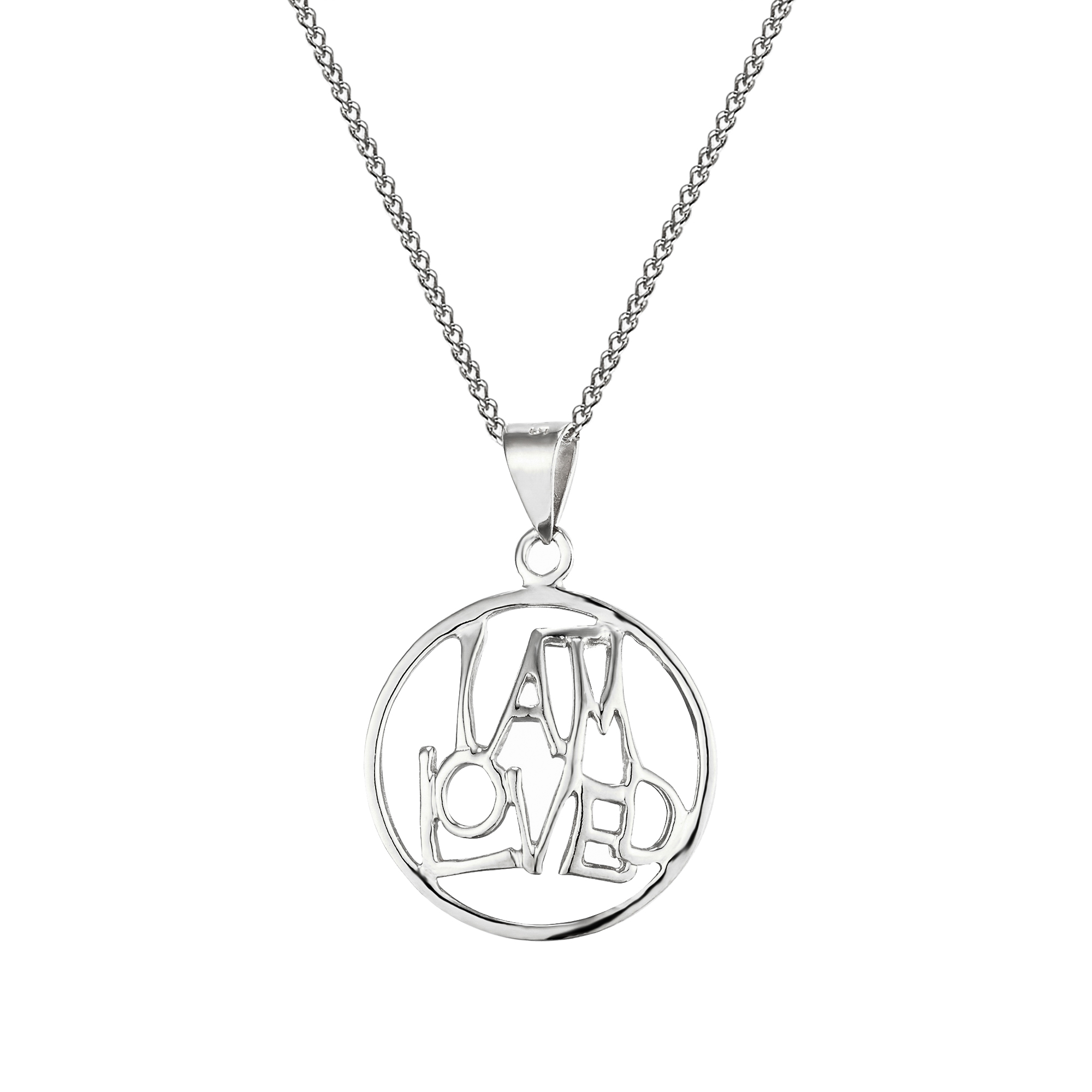 Sterling Silver circular ‘I am loved’ pendant. Available in sterling silver (.925), 18ct yellow gold plate over sterling silver (.925) or 18ct rose gold plate over sterling silver (.925).