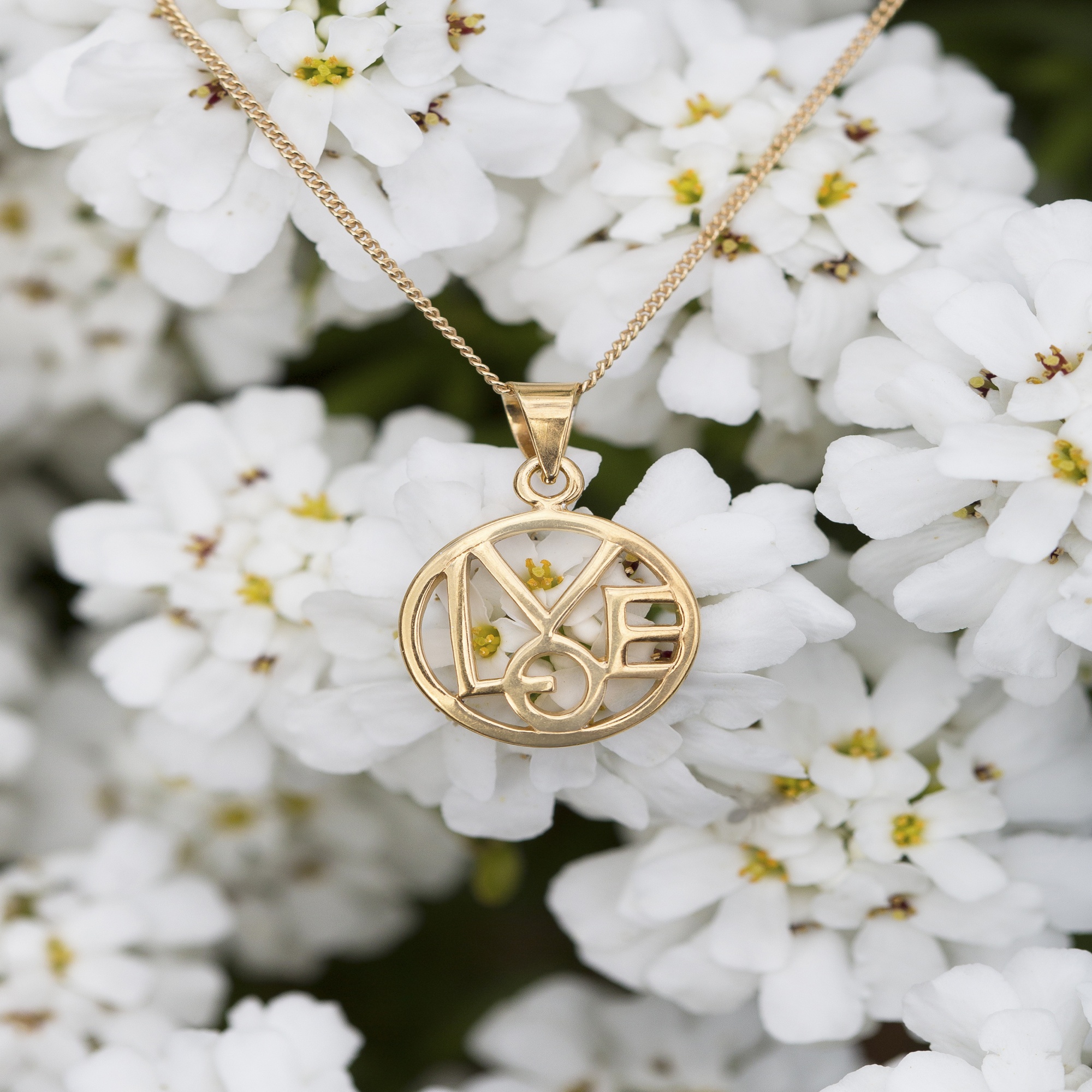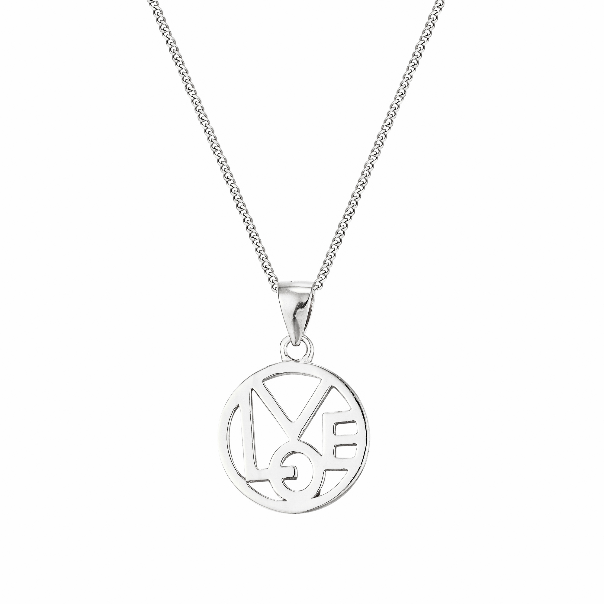 Sterling silver circular pendant with the word ‘love’ cut out. Available in sterling silver (.925), 18ct yellow gold plate over sterling silver (.925) or 18ct rose gold plate over sterling silver (.925).