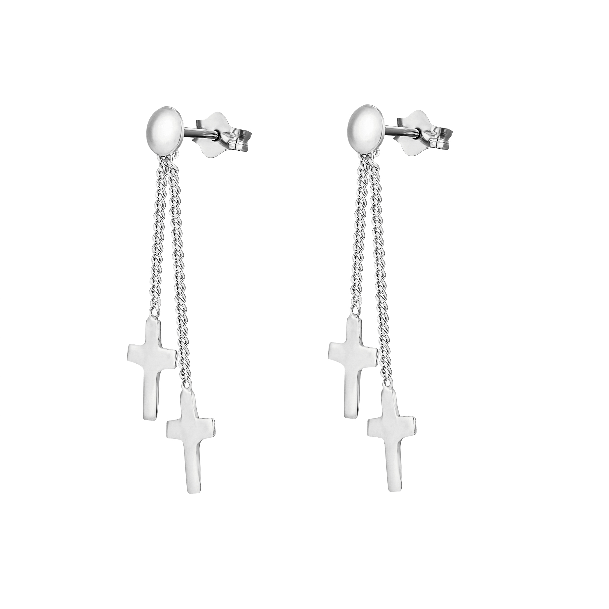 Sterling silver cross drop stud earrings. Available in sterling silver (.925), 18ct yellow gold plate over sterling silver (.925) or 18ct rose gold plate over sterling silver (.925).