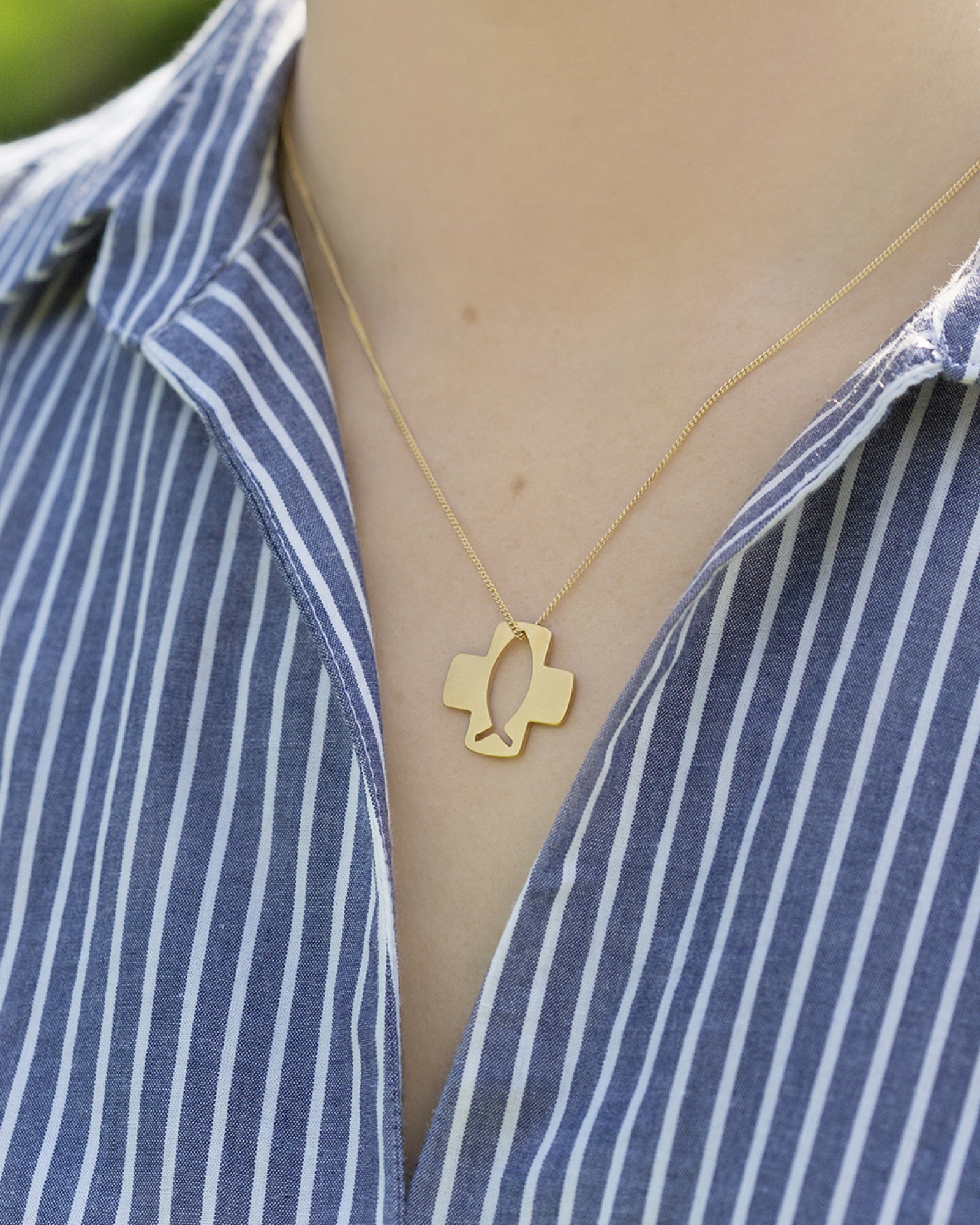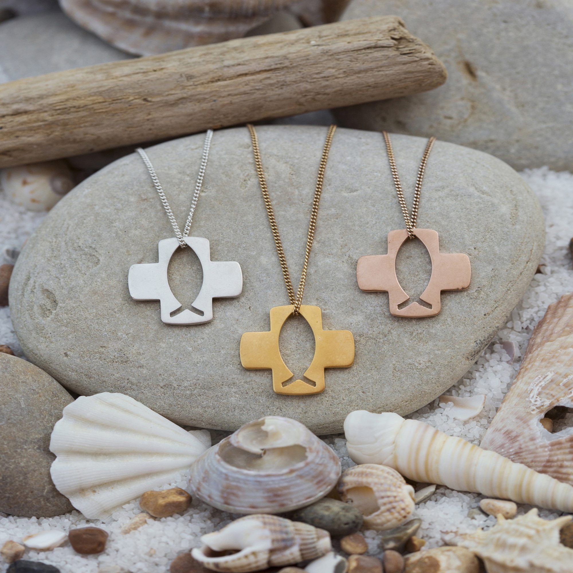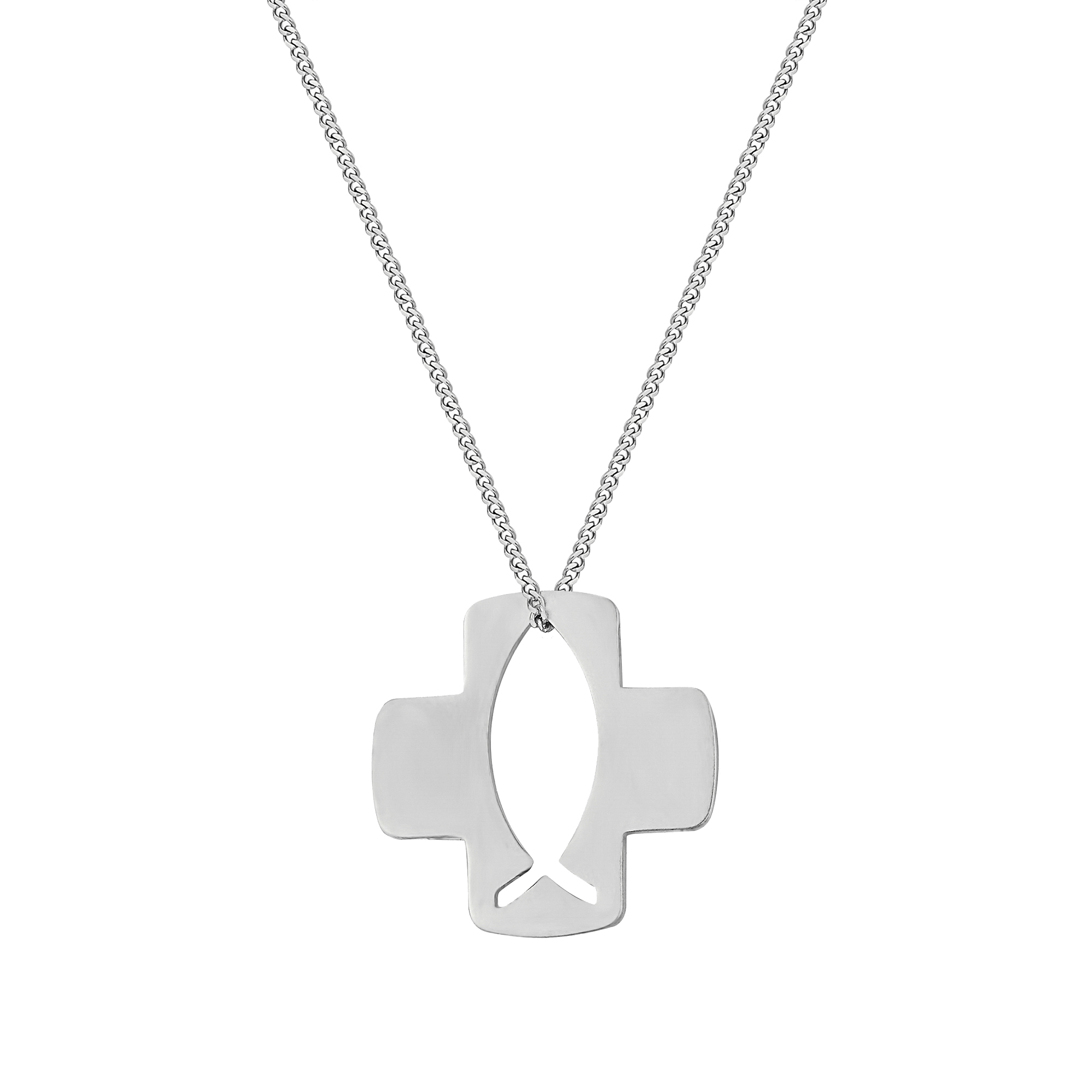 Sterling silver cross pendant with cut out fish centre. Available in sterling silver (.925), 18ct yellow gold plate over sterling silver (.925) or 18ct rose gold plate over sterling silver (.925).
