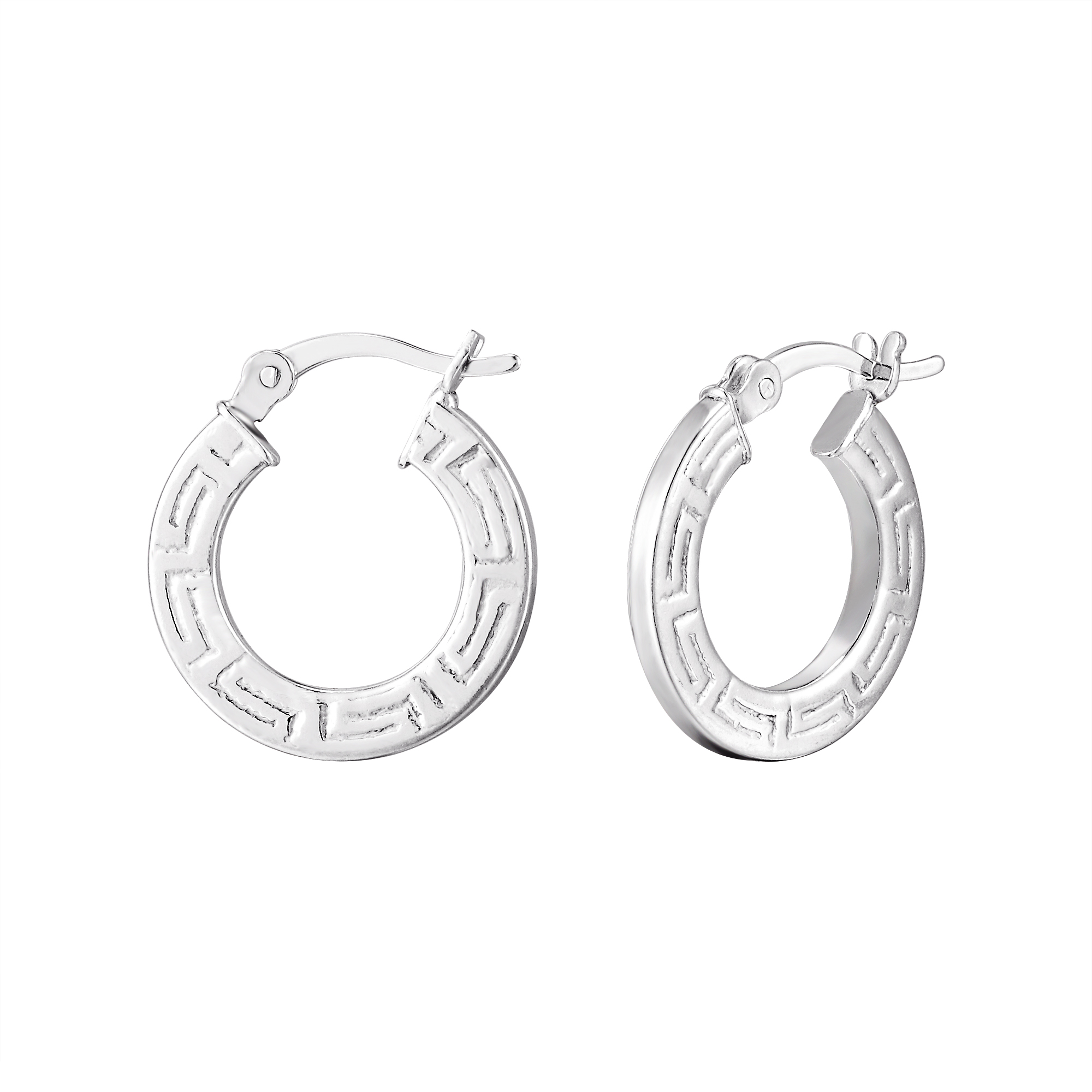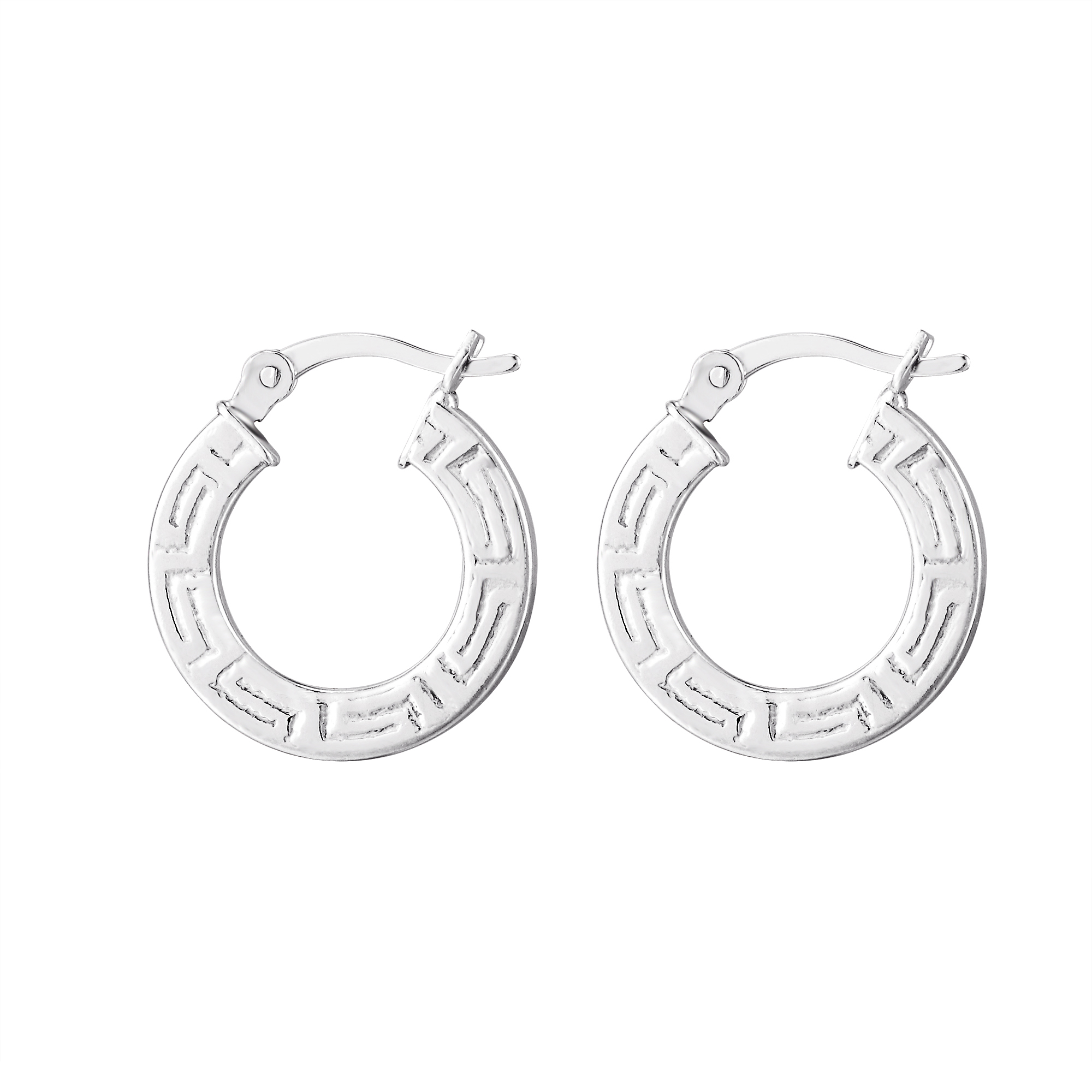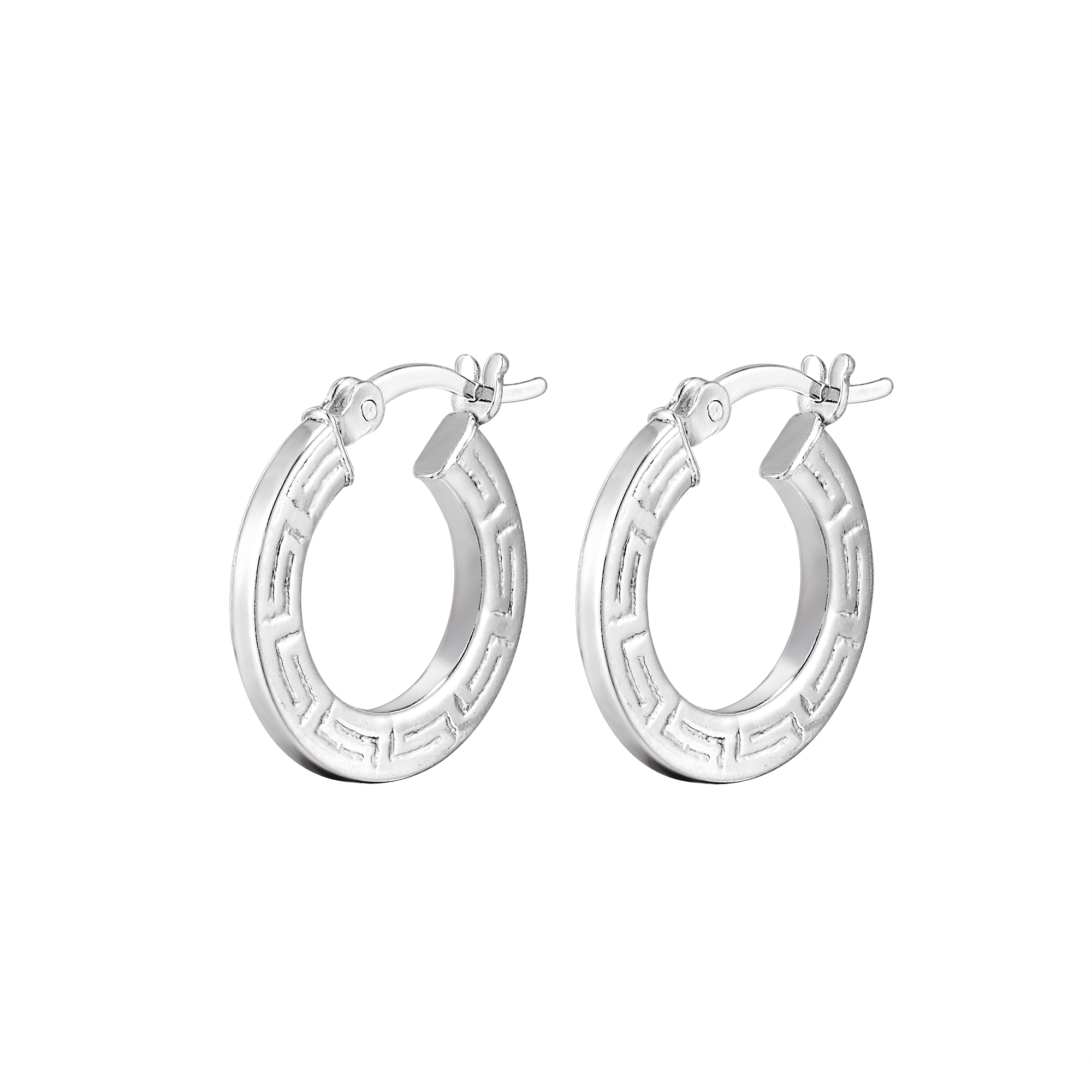 These greek-key style creole hoop earrings are made from sterling silver and fasten at the back with a click in creole fitting. They have a textured edge in the meander design and are a chic addition to any outfit, suitable for everyday wear. Arriving in a gift box, these earrings are ready to give to someone special.