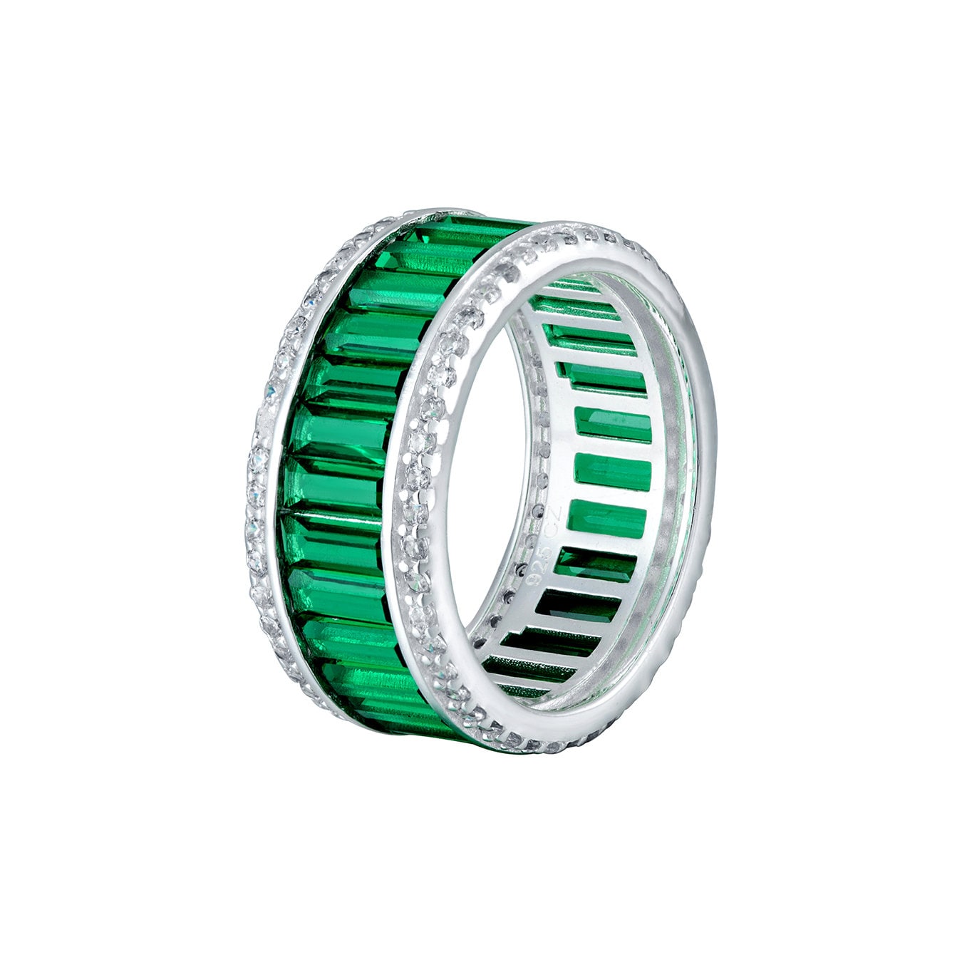 This sparkling dress ring has an eternity style band of green baguette cut cubic zirconia’s adding an elegant and glittering touch to every look. This will make a stunning gift for that special someone looking to dress up their jewellery collection. Comes in an elegant gift box ready to give for any occasion.Available in UK ring sizes J, L, O, R, and T.Please note that if you are ordering more than one item that they will arrive in only one gift box. If you need more than one gift box then please message us and let us know!