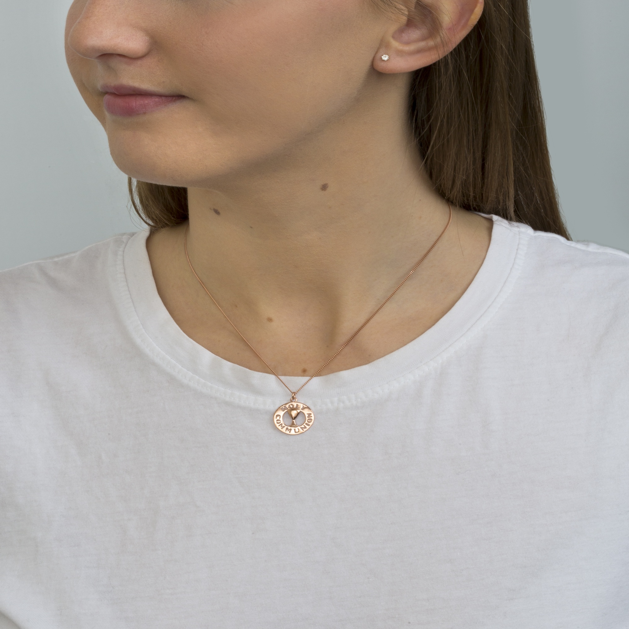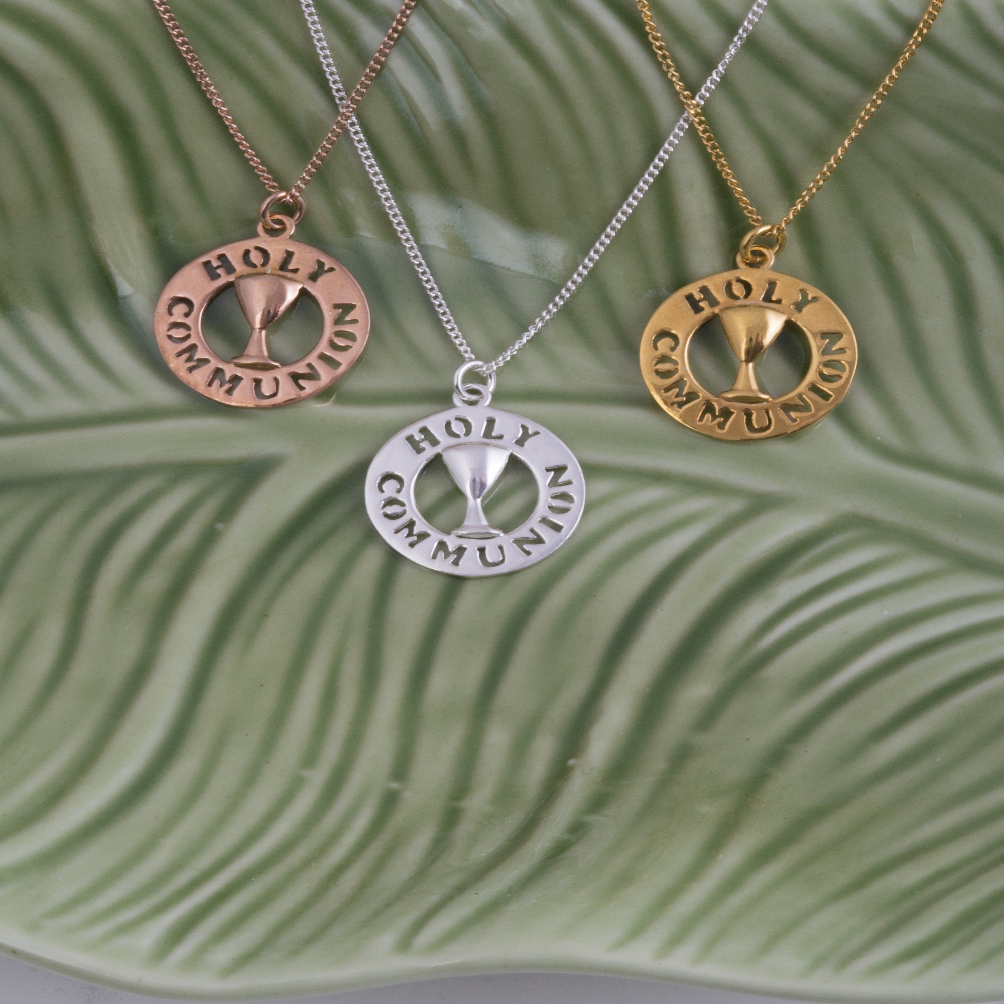 Sterling Silver Holy Communion pendant. Available in sterling silver (.925), 18ct yellow gold plate over sterling silver (.925) or 18ct rose gold plate over sterling silver (.925).