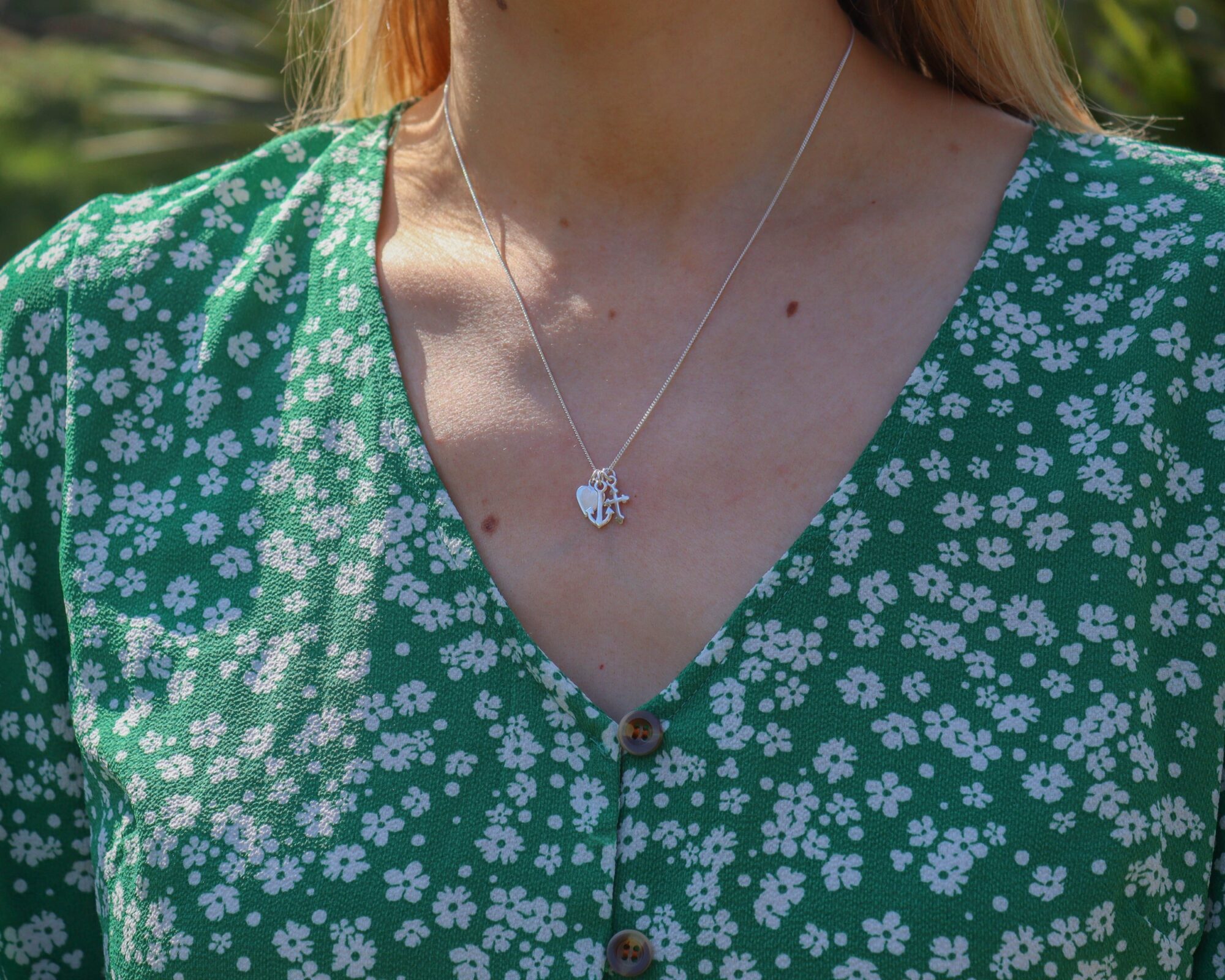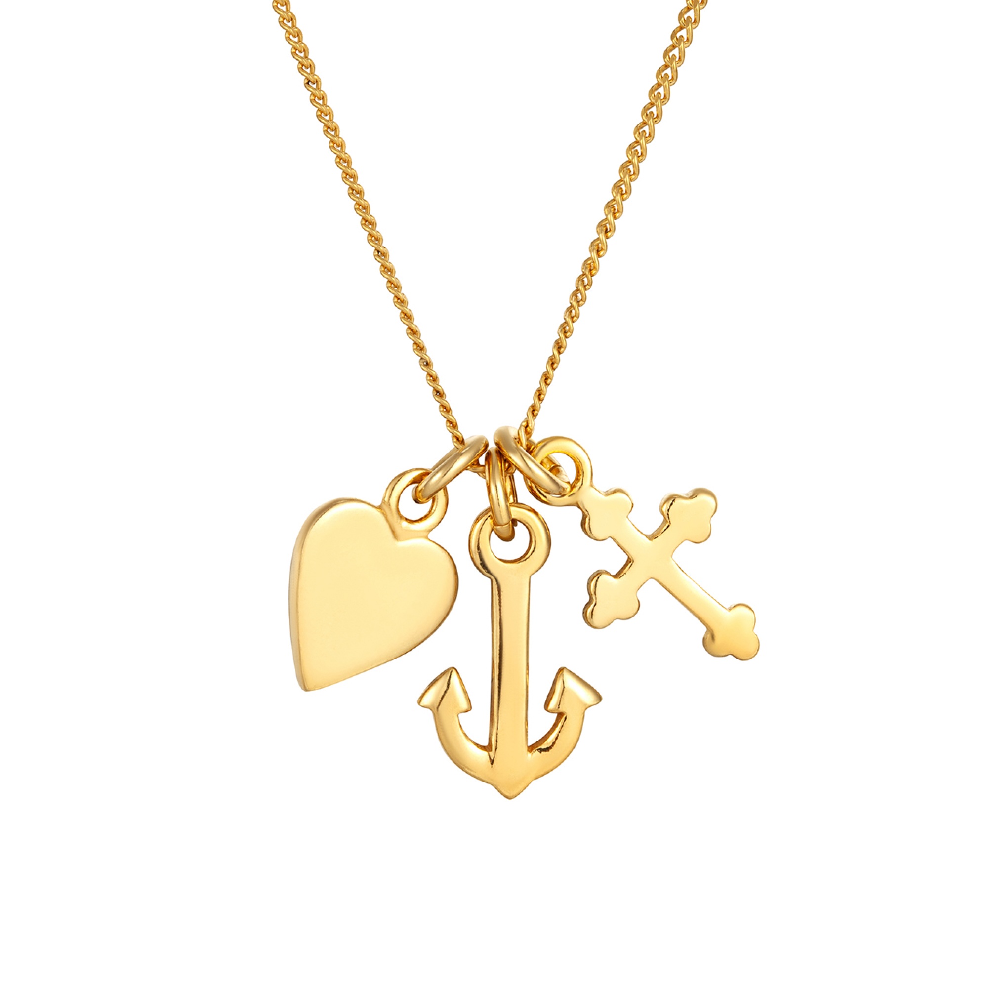 Sterling Silver love, hope, faith (heart, anchor, cross) symbol necklace. Available in sterling silver (.925), 18ct yellow gold plate over sterling silver (.925) or 18ct rose gold plate over sterling silver (.925).